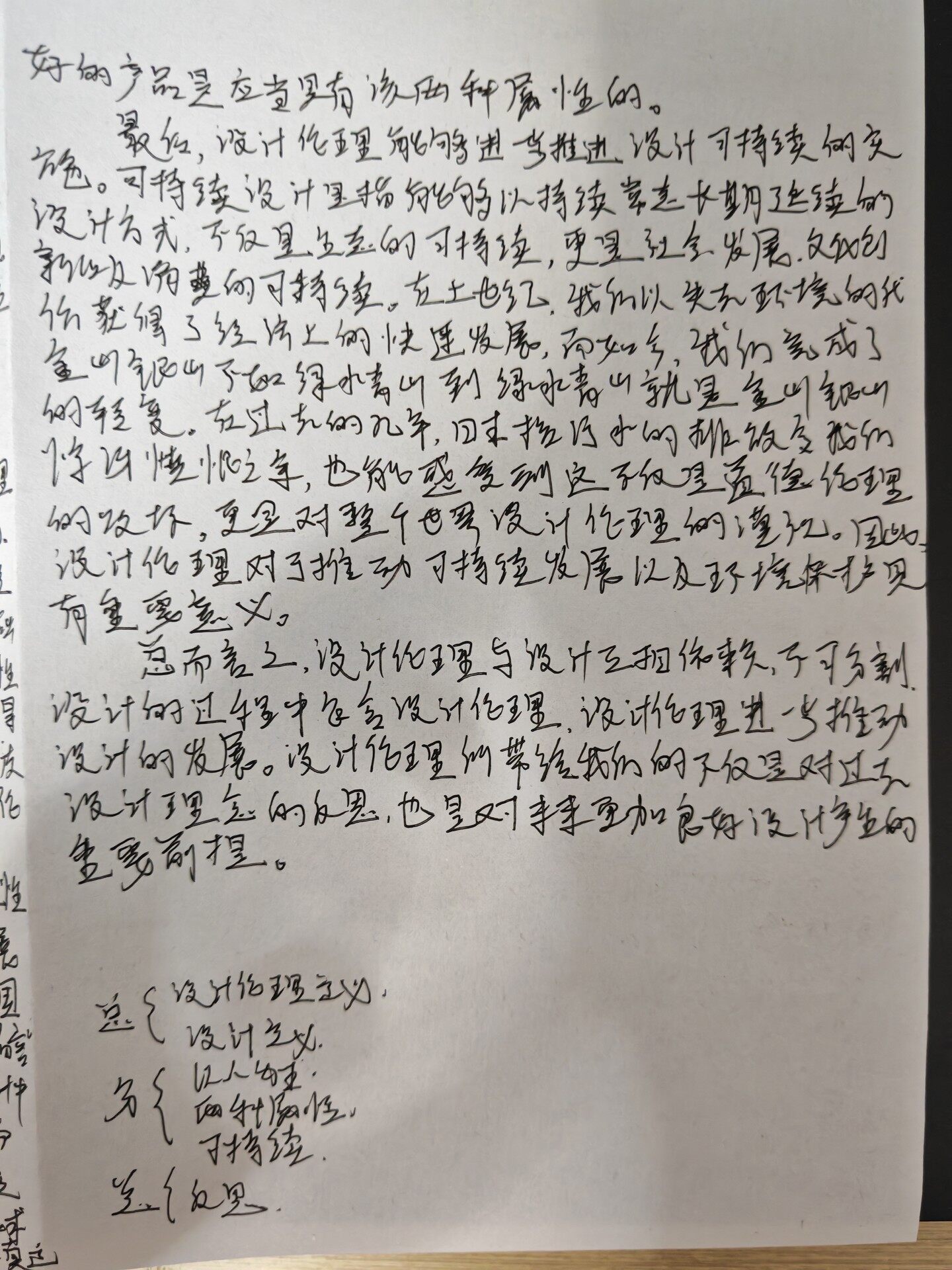 好的产品是应当具有该两种属性的。 最后,设计伦理能够进一步推进设计可持续的实 :发展. 价获得了经济。是也,我所以失去环境的 1亿 学讶愤恨之年,也能感受到这不仅是道德论理 的收场,更是对整个世界设计伦理的漠视。因此 设计伦理对于推动可持续发展以及环境保护贝 出 有重要意义。 性 总而言之,设计论理与设计互相依赖,不可分割 羽近 会设计 设计的发展。设计伦理所带给我们的是对 设计理念的反思,也是对未来更加良好设计产生的 重要前提。 性 展 国 总{改 设计论理定义 设计主必. 分{ 的科属性。 以人为本. 可持续 本 美反思.