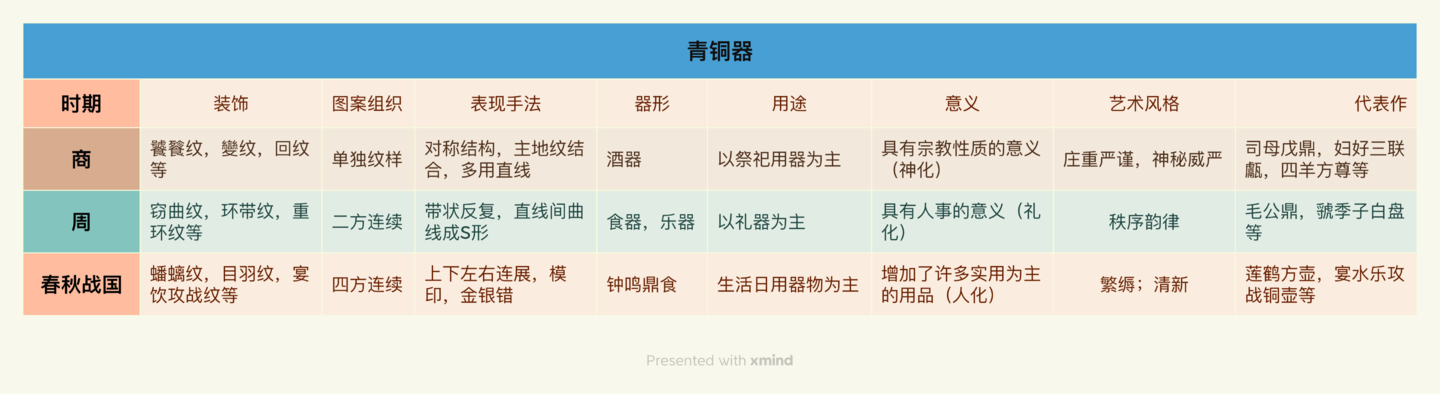 青铜器 时期 装饰 图案组织 表现手法 器形 用途 意义 艺术风格 代表作 商 饕餮纹,纹,回纹 对称结构,主地纹结 具有宗教性质的意义 主重严谨,神秘威严 司母戊鼎,妇好三联 等 单独纹样 合,多用直线 酒器 以祭祀用器为主 (神化) 周 窃曲纹,环带纹,重 带状反复,直线间曲 环纹等 二方连续 线成S形 食器,乐器 以礼器为主 具有人事的意义(礼 秩序韵律 毛公鼎,虢季子白盘 化) 等 春秋战国 蟠螭纹,目羽纹,宴 上下左右连展,模 增加了许多实用为主 莲鹤方壶,宴水乐攻 饮攻战纹等 四方连续 印,金银错 钟鸣鼎食 生活日用器物为主 的用品(人化) 繁缛;清新 战铜壶等 Presented with xmind