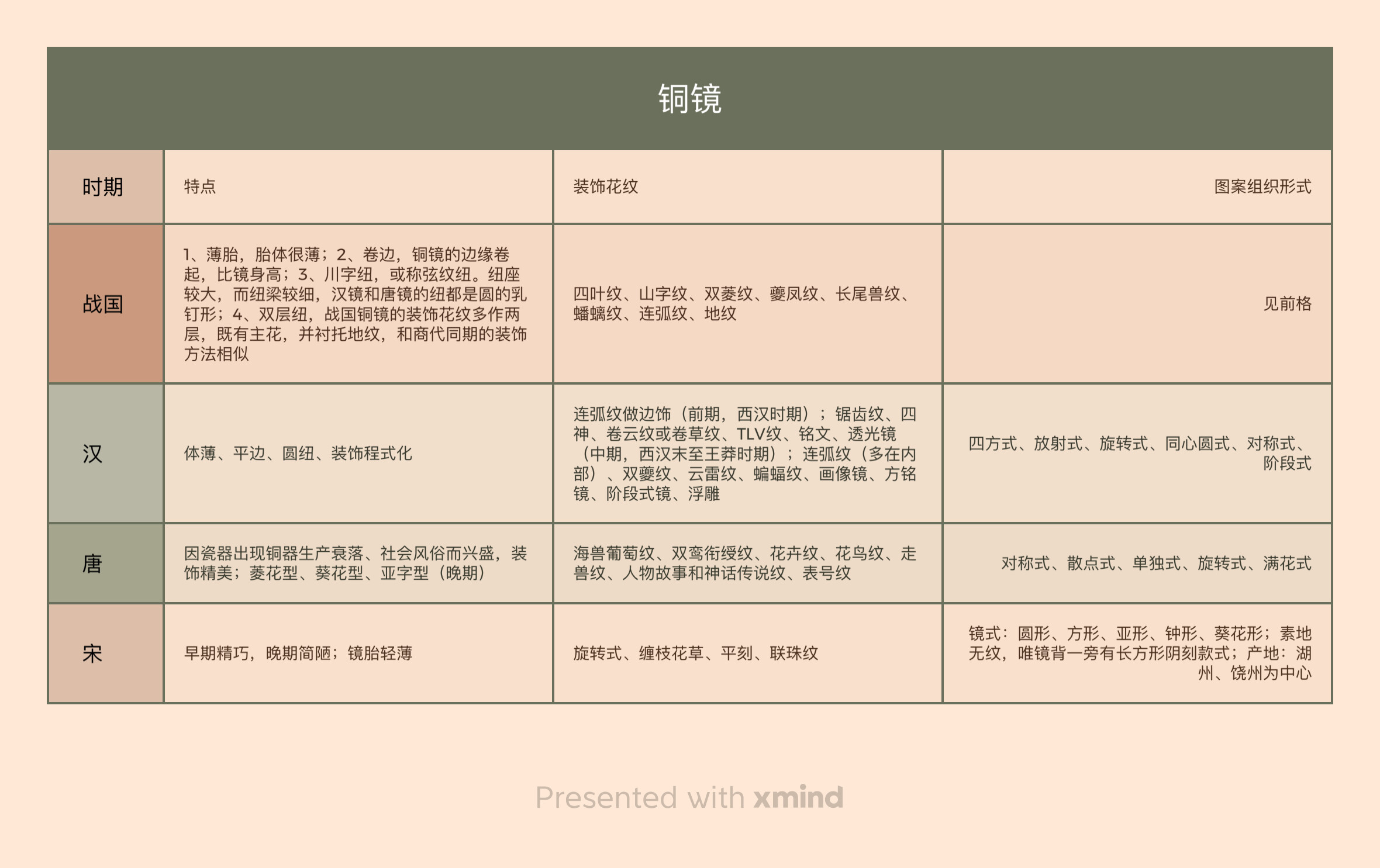 铜镜 时期 特点 装饰花纹 图案组织形式 1、薄胎,胎体很薄;2、卷边,铜镜的边缘卷 起,比镜身高;3、川字纽,或称弦纹纽。纽座 战国 较大,而纽梁较细,汉镜和唐镜的纽都是圆的乳 四叶纹、山字纹、双菱纹、夔凤纹、长尾兽纹、 见前格 钉形;4、双层纽,战国铜镜的装饰花纹多作两 蟠螭纹、连弧纹、地纹 层,既有主花,并衬托地纹,和商代同期的装饰 方法相似 连弧纹做边饰(前期,西汉时期);锯齿纹、四 神、卷云纹或卷草纹、TLV纹、铭文、透光镜 汉 体薄、平边、圆纽、装饰程式化 (中期,西汉末至王莽时期);连弧纹(多在内 四方式、放射式、旋转式、同心圆式、对称式、 部)、双夔纹、云雷纹、蝙蝠纹、画像镜、方铭 阶段式 镜、阶段式镜、浮雕 唐 因瓷器出现铜器生产衰落、社会风俗而兴盛,装 海兽葡萄纹、双鸾衔绶纹、花卉纹、花鸟纹、走 兽纹、人物故事和神话传说纹、表号纹 对称式、散点式、单独式、旋转式、满花式 饰精美;菱花型、葵花型、亚字型(晚期) 镜式:圆形、方形、亚形、钟形、葵花形;素地 宋 早期精巧,晚期简陋;镜胎轻薄 旋转式、缠枝花草、平刻、联珠纹 无纹,唯镜背一旁有长方形阴刻款式;产地:湖 州、饶州为中心 Presented with xmind