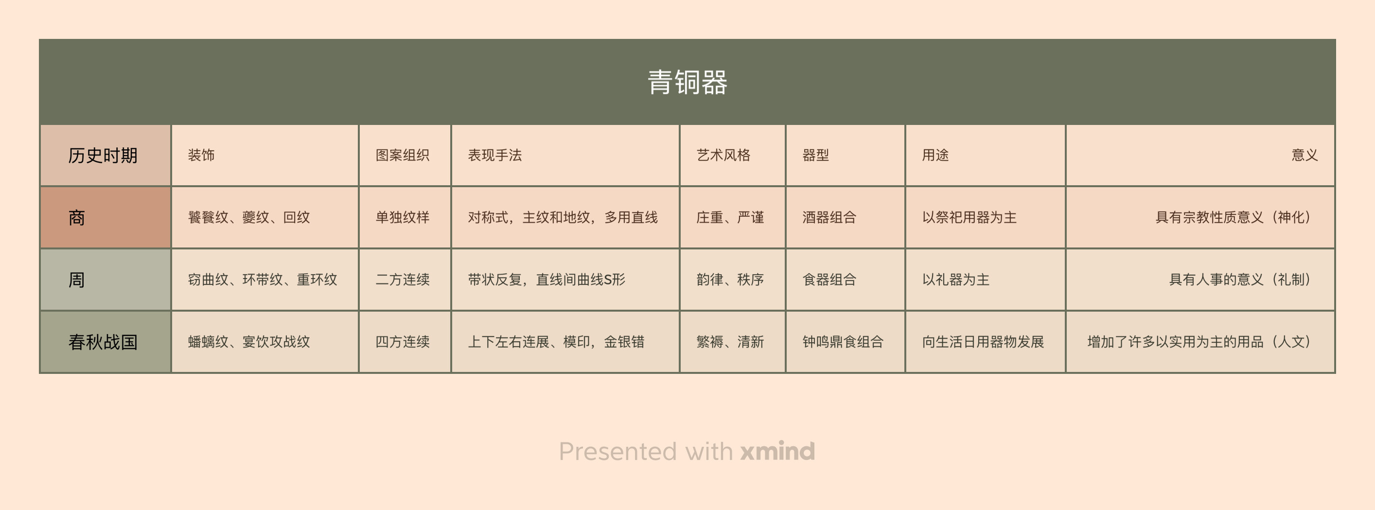 青铜器 历史时期 装饰 图案组织 表现手法 艺术风格 器型 用途 意义 商 饕餮纹、夔纹、回纹 单独纹样 对称式,主纹和地纹,多用直线 庄重、严谨 酒器组合 以祭祀用器为主 具有宗教性质意义(神化) 周 窃曲纹、环带纹、重环纹 二方连续 带状反复,直线间曲线S形 韵律、秩序 食器组合 以礼器为主 具有人事的意义(礼制) 春秋战国 蟠螭纹、宴饮攻战纹 四方连续 上下左右连展、模印,金银错 繁褥、清新 钟鸣鼎食组合 向生活日用器物发展 增加了许多以实用为主的用品(人文) Presented with xmind