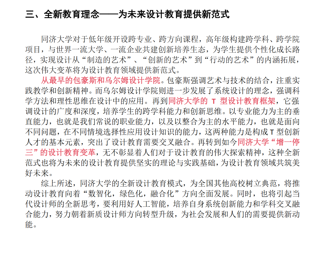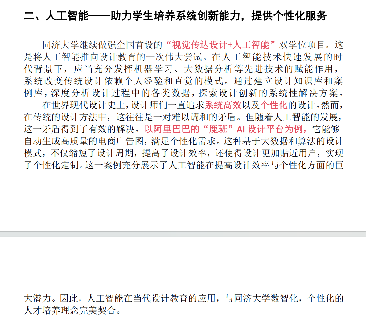 二、人工智能- --助力学生培养系统创新能力,提供个性化服务 同济大学继续做强全国首设的 “视觉传达设计+人工智能”双学位项目。这 是将人工智能推向设计教育的一次伟大尝试。在人工智能技术快速发展的时 代背景下,应当充分发挥机器学习、大数据分析等先进技术的赋能作用, 系统改变传统设计依赖个人经验和直觉的模式。通过建立设计知识库和案 例库,深度分析设计过程中的各类数据,探索设计创新的系统性解决方案。 在世界现代设计史上,设计师们一直追求系统高效以及个性化的设计。然而, 在传统的设计方法中,这往往是一对难以调和的矛盾。但随着人工智能的发展, 这一矛盾得到了有效的解决。以阿里巴巴的“鹿班”AI设计平台为例,它能够 自动生成高质量的电商广告图,满足个性化需求。这种基于大数据和算法的设计 模式,不仅缩短了设计周期,提高了设计效率,还使得设计更加贴近用户,实现 了个性化定制。这一案例充分展示了人工智能在提高设计效率与个性化方面的巨 大潜力。因此, ,人工智能在当代设计教育的应用,与同济大学数智化, 个性化的 人才培养理念完美契合。