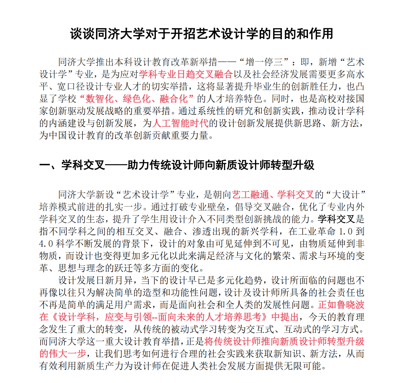谈谈同济大学对于开招艺术设计学的目的和作用 同济大学推出本科设计教育改革新举措 -“增一停三”:即,新增“艺术 设计学”专业,是为应对学科专业日趋交叉融合以及社会经济发展需要更多高水 平、宽口径设计专业人才的切实举措,这将显著提升毕业生的创新胜任力,也凸 显了学校“数智化、绿色化、融合化”的人才培养特色。同时,也是高校对接国 家创新驱动发展战略的重要举措。通过系统性的研究和创新实践,推动设计学科 的内涵建设与创新发展,为人工智能时代的设计创新发展提供新思路、新方法, 为中国设计教育的改革创新贡献重要力量。 一、学科交叉-助力传统设计师向新质设计师转型升级 同济大学新设“艺术设计学”专业,是朝向艺工融通、学科交叉的“大设计” 培养模式前进的扎实一步。通过打破专业壁垒,倡导交叉融合,优化了专业内外 学科交叉的生态,提升了学生用设计介入不同类型创新挑战的能力。学科交叉是 指不同学科之间的相互交叉、融合、渗透出现的新兴学科,在工业革命1.0到 4.0科学不断发展的背景下,设计的对象由可见延伸到不可见,由物质延伸到非 物质,而设计也变得更加多元化以此来满足经济与文化的繁荣、需求与环境的变 革、思想与理念的跃迁等多方面的变化。 设计发展日新月异,当下的设计早已是多元化趋势,设计所面临的问题也不 再像以往只为解决简单的造型和功能性问题,设计及设计师所具备的社会责任也 不再是简单的满足用户需求,而是面向社会和全人类的发展性问题。正如鲁晓波 在《设计学科,应变与引领--面向未来的人才培养思考》中提出,今天的教育理 念发生了重大的转变,从传统的被动式学习转变为交互式、互动式的学习方式。 而同济大学这一重大设计教育举措,正是将传统设计师推向新质设计师转型升级 的伟大一步,让我们思考如何进行合理的社会实践来获取新知识、新方法,从而 有效利用新质生产力为设计师在促进人类社会发展方面提供无限可能。