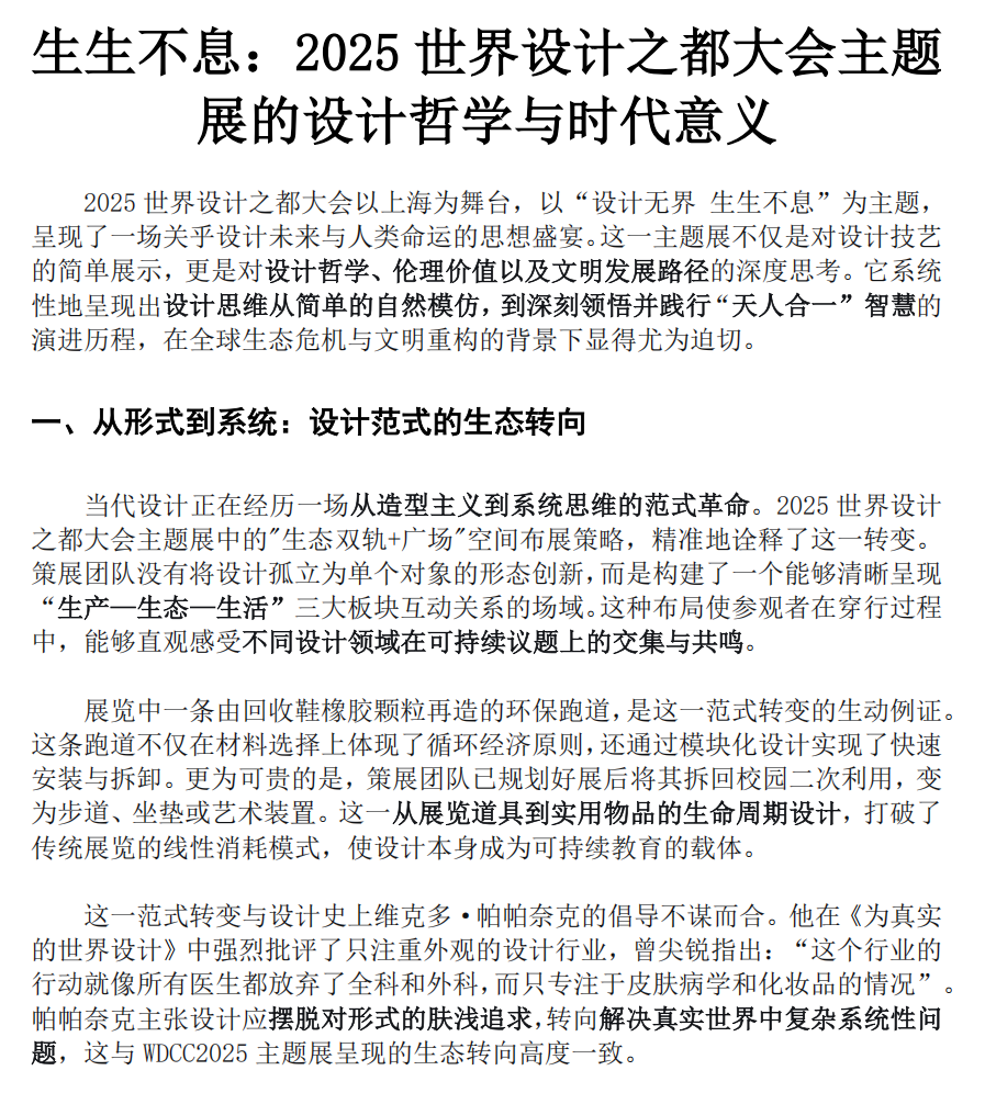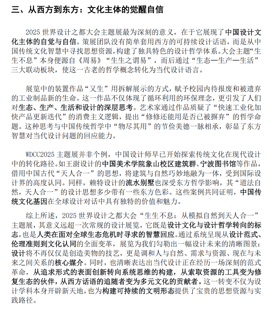 三、从西方到东方: 文化主体的觉醒自信 2025世界设计之都大会主题展最为深刻的意义,在于它展现了中国设计文 化主体的自觉与自信。策展团队没有简单套用西方的可持续设计话语,而是从中 国传统文化智慧中寻找思想资源,构建了独具特色的设计哲学体系。大会主题“生 生不息”本身便源自《周易》 “生生之谓易”,而后通过“生态一生产-生活” 三大联动板块,使这一古老的哲学概念转化为当代设计语言。 展览中的装置作品“又生”用拆解展示的方式,赋予校园内待报废和被遗弃 的工业制品新的生命。这一作品不仅体现了循环利用的环保理念,更引发了人们 对生态、生产、生活和设计的深层思考。艺术家通过作品质疑了“快速工业化加 快产品更新迭代”的消费主义逻辑,提出“修修还能用是否已被摒弃”的哲学命 题。这种思考与中国传统哲学中“物尽其用”的节俭美德一脉相承,彰显了东方 智慧对当代设计问题的回应能力。 WDCC2025主题展并非个例,中国设计师早已开始探索传统文化在现代设计 中的转化路径。如王澍设计的中国美术学院象山校区建筑群、宁波图书馆等作品, 借用中国古代“天人合一”的思想,将建筑与自然巧妙地融为一体,受到国际设 计界的高度认同。同样,赖特设计的流水别墅也深受东方哲学影响,其“道法自 然,天人合一”的设计思想多少带有一些东方色彩。这些案例共同证明,中国传 统文化基因在全球设计对话中具有独特的价值和魅力。 综上所述,2025世界设计之都大会“生生不息:从模拟自然到天人合一” 主题展,其意义远超一次常规的设计展览,它既是设计文化与设计哲学转向的标 志,也是人类在面对全球生态危机时寻求的智慧回应。通过系统呈现从设计范式、 伦理准则到文化认同的全面变革,展览为我们勾勒出一幅设计未来的清晰图景: 设计将不再仅仅是创造美物的技艺,更是调和人与自然、需求与资源、现在与未 来之间关系的核心媒介。同时,也清晰表达出当代设计正在经历一场深刻的范式 革命,从追求形式的表面创新转向系统思维的构建,从索取资源的工具变为修 复生态的伙伴,从西方话语的追随者变为多元文化的贡献者。这一转变不仅为设 计学科本身开辟新天地,也为构建可持续的文明形态提供了宝贵的思想资源与实 践路径。