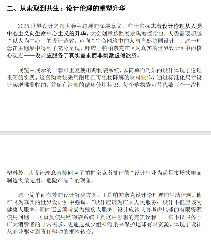 二、从索取到共生:设计伦理的重塑升华 2025世界设计之都大会主题展的深层意义,在于它标志着设计伦理从人类 中心主义向生命中心主义的升华。大会创意总监娄永琪教授指出,人类需要超越 “以人为中心”的设计范式,迈向“生命网络中的人与自然协同设计”。这一理 念在主题展中得到了充分呈现,呼应了帕帕奈克在《为真实的世界设计》中的核 心观点--设计应服务于真实需求而非刺激虚假欲望。 展览中展示的一套可重复使用购物袋系统,以简单而巧妙的设计体现了伦理 重塑的实践。这套购物袋采用耐用且可生物降解的材料制作,通过标准化尺寸设 计实现堆叠收纳,并配有清晰的循环使用标识。每个购物袋可替代数百个一次性 塑料袋,其设计理念直接回应了帕帕奈克所批评的“设计行业为满足市场欲望而 制造大量无用、危险产品”的现象。 这一简单而有效的设计解决方案,正是帕帕奈克设计伦理观的生动体现。他 在《为真实的世界设计》中强调,"设计应该为广大人民服务;设计不但应该为 健康人服务,同时还必须考虑为残疾人服务;设计应该认真考虑地球的有限资源 使用问题”。可重复使用购物袋系统正是这种思想的完美诠释- --它不仅服务于 广大消费者的日常需求,更通过减少塑料污染来保护地球有限资源,体现了设计 从商业驱动到责任驱动的根本转变。