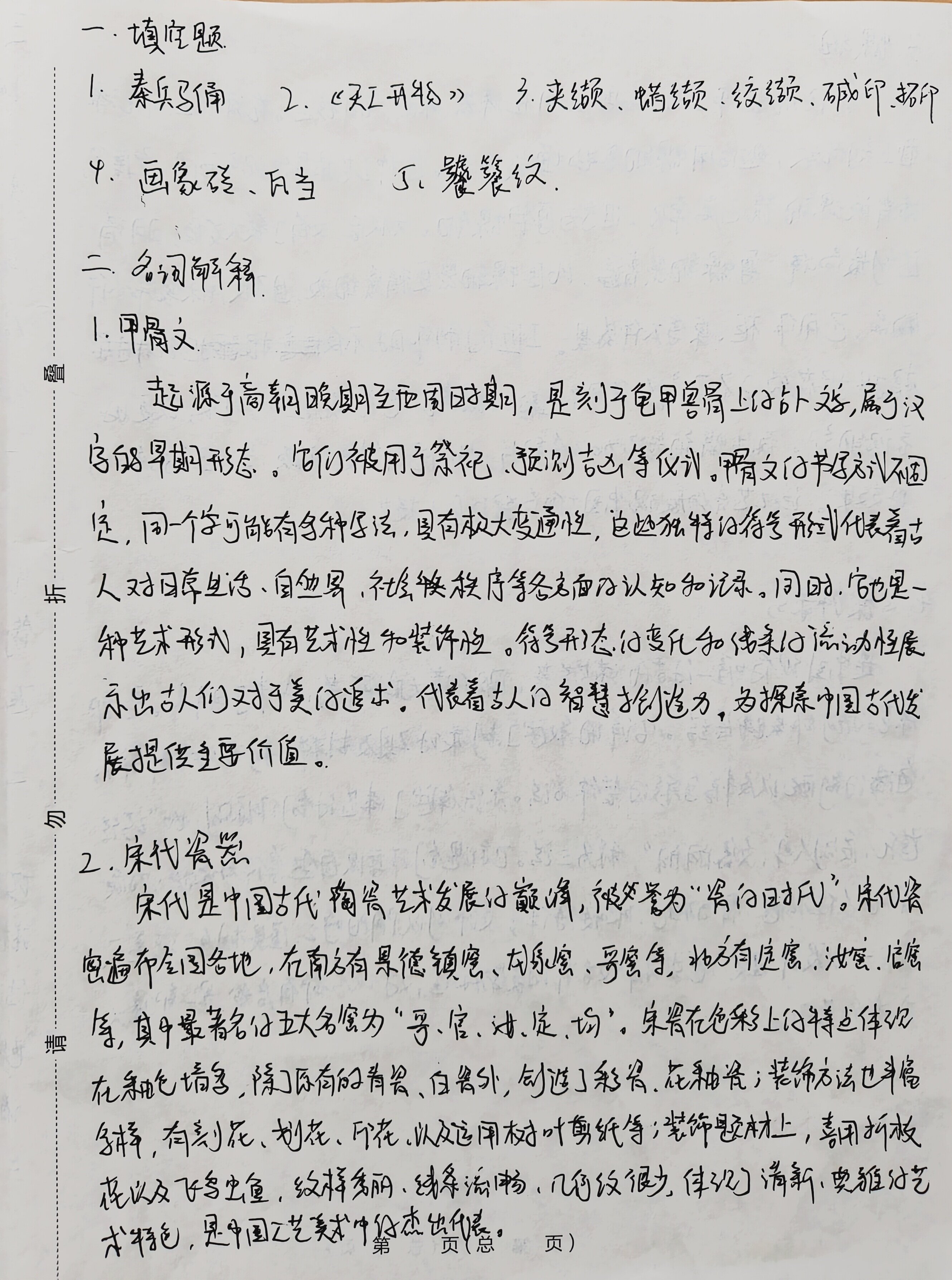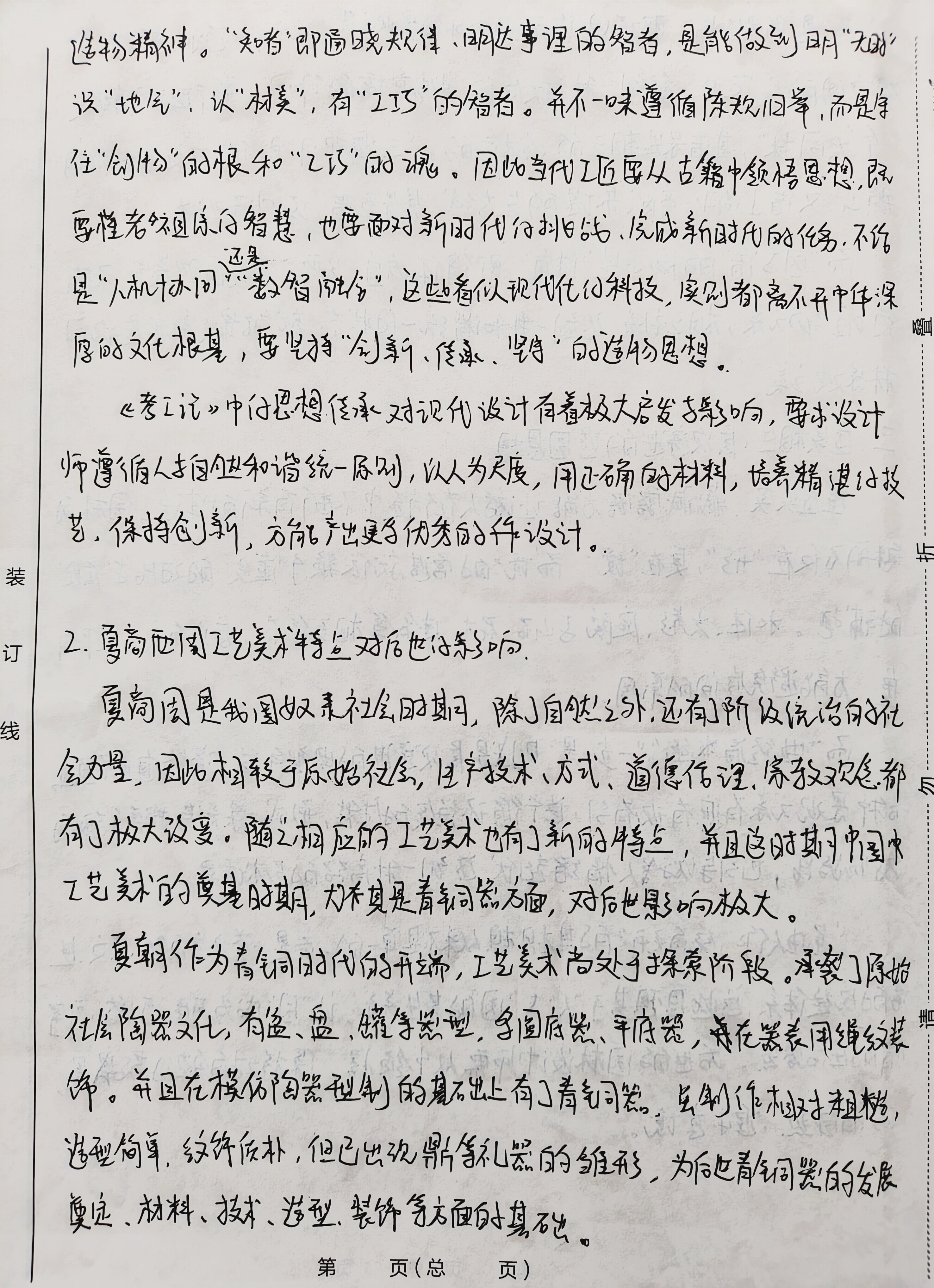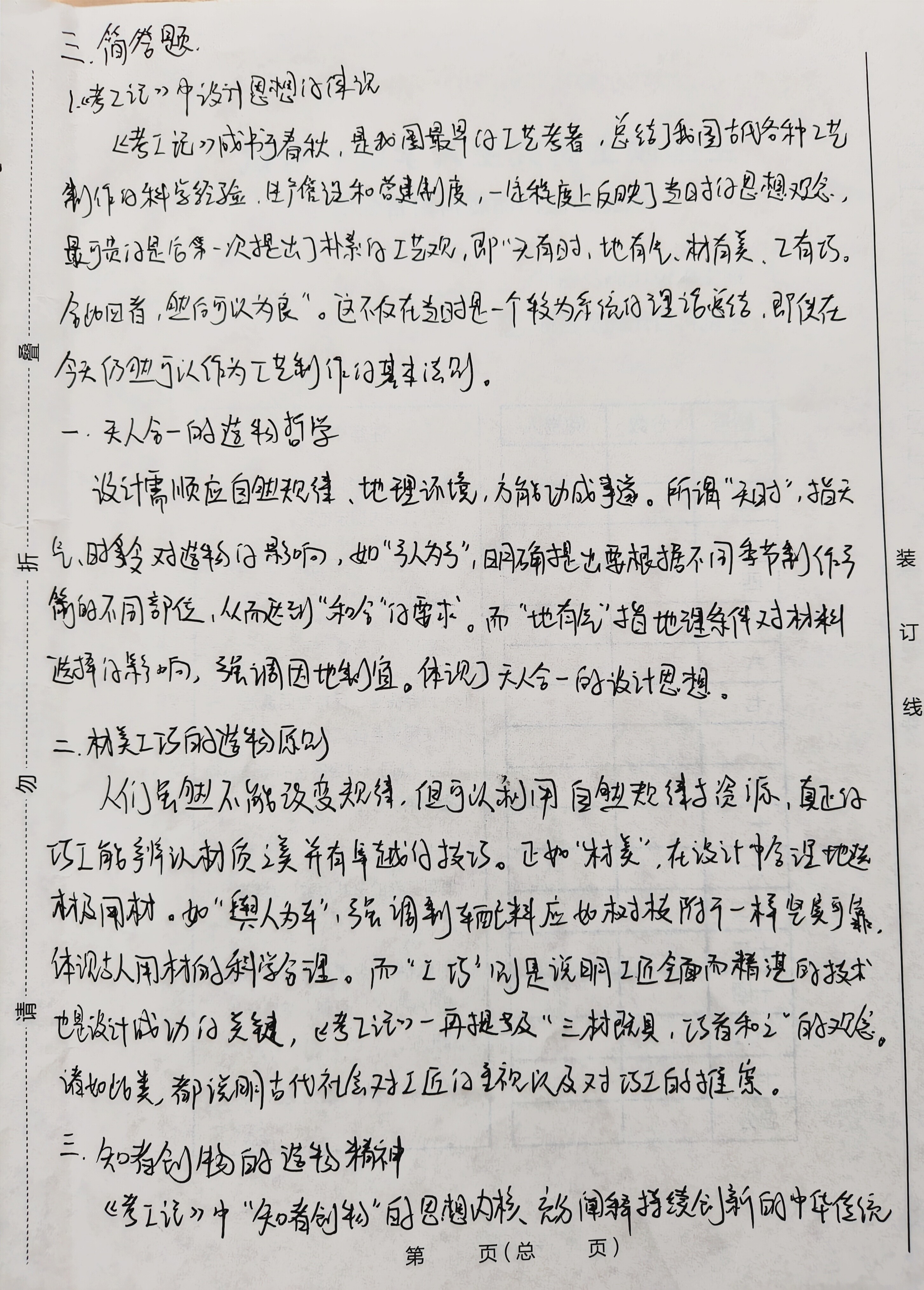 一.填空题 1.秦兵马俑 2、《天工开物》 3.夹缬、蜡缬、绞缬、碱印、拓印 4. 画象砖、瓦当 5.饕餮纹 二、名词解释 1.甲骨文 起源于商朝晚期至西周时期,是刻于龟甲兽骨上仔外文字,属于汉 字的早期形态。它们被用了祭祀,预测吉凶等仪式。甲骨文化节字方式不固 足,同一个字可能有多种写法,具有极大变通性,这些独特的符号形式代表着古 人对日常生活、自然界、社会秩序等各方面的认知和记录。同时,它也是一 种艺术形式,具有艺术性和装饰性。符号形态的变化和线条的流动性展 示出古人们对于美追求代表着与人的智慧创造力,为探索中国古代发 展提供主要价值 2.宋代瓷器 宋代是中国古代陶瓷艺术发展的巅峰,被誉为“瓷白时代”。宋代瓷 密遍布全国各地,在南方有景德镇密、龙泉密、哥密等,北方有定密、汝窑、启密 等,其中最著名仔五大名窖为“哥、宫、汝、定、均”。宋瓷在色彩上的特点体现 在采色增多,除了原有的脊瓷、白瓷外,创造了彩瓷、花釉瓷;装饰方法也丰富 多样,有刻花、划花、印花、以及运用树叶剪纸等;装饰题材上,喜用折枝 花以及飞鸟虫鱼、这样秀丽、线条流畅、几何纹很少,体现了清新、典雅仔艺 术特色,是中国工艺美术中的杰出代表。 第 页(总 页) 3.螺钢 一种传统装饰工艺,主要应用在漆器、然、铜镜上。在添要上,即在 面上刻花纹,然后用螺细等物填嵌进去。这种工艺最早出现于两周,至 漆背嵌螺细镜已属常见,但多为厚螺锢。元以后,又有了较大发展,明清 达到最高峰,薄螺钮器普遍,比厚螺细器更精密细致,且不仅用来装饰小 物品,还用作柜、桌等大件家具。工匠们制作时,不仅拒不同 根据据花纹的不同部分使用不包彩的螺钮,还在嵌片上加划痕,以更好 表现细部。有些螺钮器还加以金银片,此外还有衬色细嵌,呈现五彩改改 的效果。该工艺充分展现中国与代向超的后人技艺。 4.《髹饰录》 是中国现存唯一门古代添艺专著。明代黄大成所著,成书于明末。是一部 艺仔创作实践总结。它详细叙述了制漆的工具及材料、制漆仔各种弊病 色漆的制配以及丰富多彩的装饰方法。系统阐述了添艺的创作原则,如“巧法 造化、质别人身、文象阴阳”,称为三法。也就是创作要以自然条件为依据;内质 犹如人体构造,骨肉相连,肥疫待体;文饰则以阴阳呼之,虚实相互。涵盖天 人合一份设计理念,追求精致古朴的美学标准,对现今都有启发,是一部集大 戊式仔著作。 结物精神。“知者”即通晓规律、明达事理的智者,是能做到明“无时” 识“地气”,认“材美”,有“工巧”的智者。并不一味遵循陈规旧举,而是守 任“创物”的根和“工巧”的魂。因此当代工匠要从古籍中领悟思想,既 要懂老祖练的智慧,也要面对新时代的挑战、完成新时代的任务,不论 还是 是“人机协同 “数智融合”,这些看似现代化的科技,实则都离不开中华深 厚的文化根基,要坚持“创新、传承、坚守”的造物思想。 m 《考工记》中仔思想传承对现代设计有着极大启发与影响,要求设计 师遵循人与自然和谐统一原则,以人为尺度,用正确的材料,培养精湛技 艺,保持创新,方能产出更多优秀的设计。 装 订 2.夏商西周工艺美术特点对后世纪影响 线 复商周是我国奴隶社会时期,除了自然之外,还有]阶级统治的社 会力量,因此相较于原始社会,生产技术、方式、道德伦理、宗教观念都 有了极大改变。随之相应的工艺美术 也有了新的特点,并且这时期中国中 工艺美术的奠基时期,灯其是青铜器方面,对后世影响极大。 夏朝作为青铜时代的开端,工艺美术尚处于探索阶段。承裂了原始 社会陶器文化,有盆、盘、罐等器型、多圆底器、平底器,在器表用绳纹装 饰。并且在模仿陶器型制的基础上有了青铜器,虽制作相对粗糙, 造型简单,纹饰质朴,但已出现鼎片等礼器的雏形,为后世青铜器的发展 奠定、材料、技术、造型、装饰等方面的基础。 第 页(总 页) 四.论述题 .如何理解中国古代造园中“虽由人作、宛自天开”的基本思想。 破 “虽由人作、宛自天开”是《园治》中的核心理念。而《园冶》是世界上 最早的系统造园专著之一,由明代计成编著,书中不仅有对造园独特的见 解和精妙的叙述,也有对中国古典造园艺术的总结。 一、虽由人作,宛自天开的核心理念。 m 强调天人合一,充分利用人造及自然景观塑造园林。以自然为范本,避免 刻意雕琢的生硬感。让人工造物与自然环境和谐共生,而非对立,就像巾 固传统山水画,讲究写意而不是写实,在园林设计方面交注重将大自然意境融入 整个园林设计中。 聿铭设计的苏州博物馆很好地体现了这一点,整个健筑里白灰色色 调,符合苏州粉墙黛瓦仔古建筑特色,同时入口为中式圆形玻璃大门框、中庭顶 上,建筑侧面都开了几何形壳窗,让外面的景色成为建筑的装饰,很好地 释了天人合一、顺应自然的设计思想, 二、巧用因“借”、得体合宜的造圆原则。 “因”与“借”是重要的造园思想。“因”是“因势利导”,即顺应场地的 自然条件与人文环境,按照自然规律与环境进行有机融合。如承德避 青山丘就因势”构园,寺庙亭台依山就势,隐藏于山林之中,别有一番意境,而 原有的沼泽洼地就开凿湖泊岛,模仿江南水乡。各种景色相互融合,相互 依靠,呈现和谐统一状态。 第 页(总 页) “借”是借景迁情”,即巧妙借用园内外的景