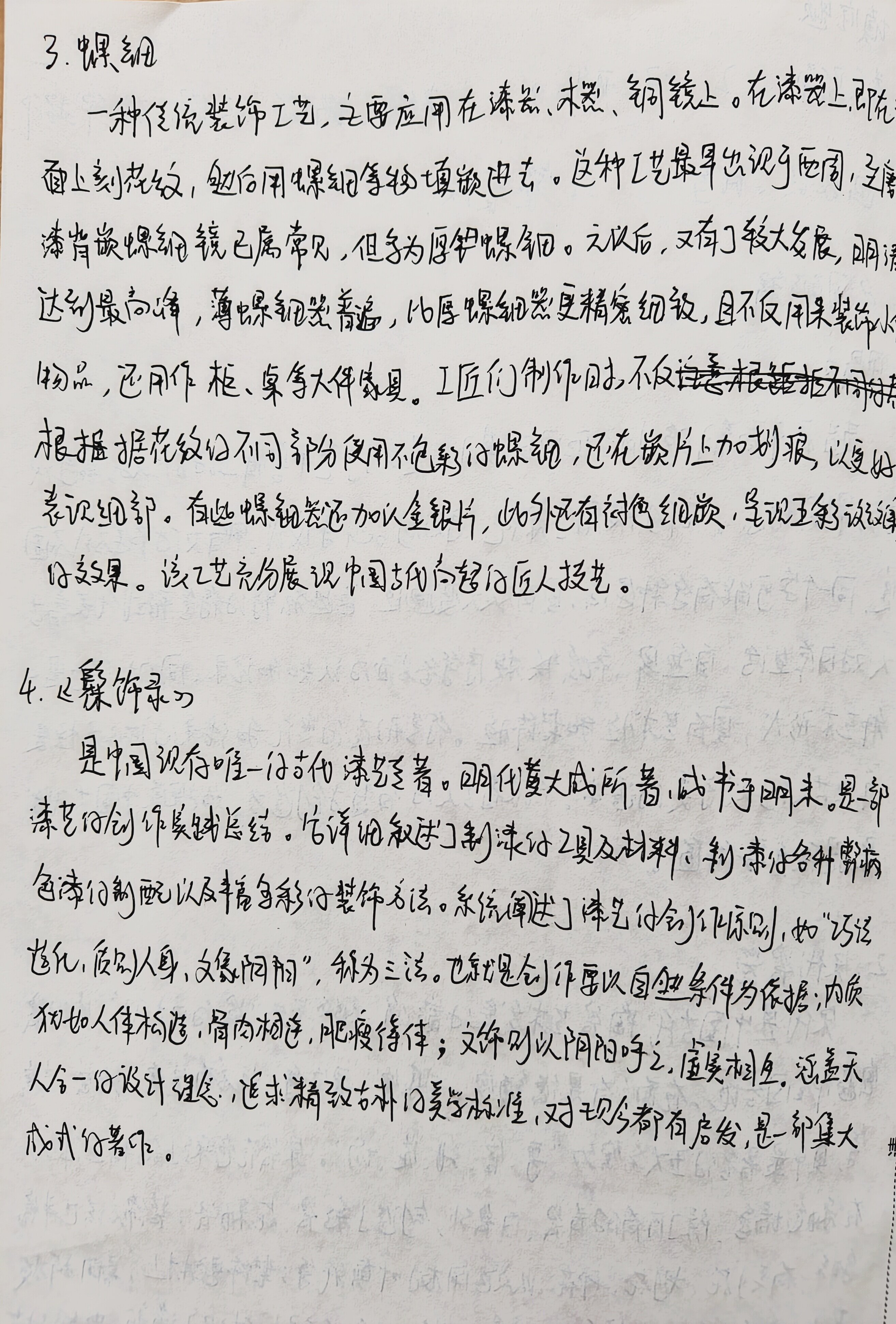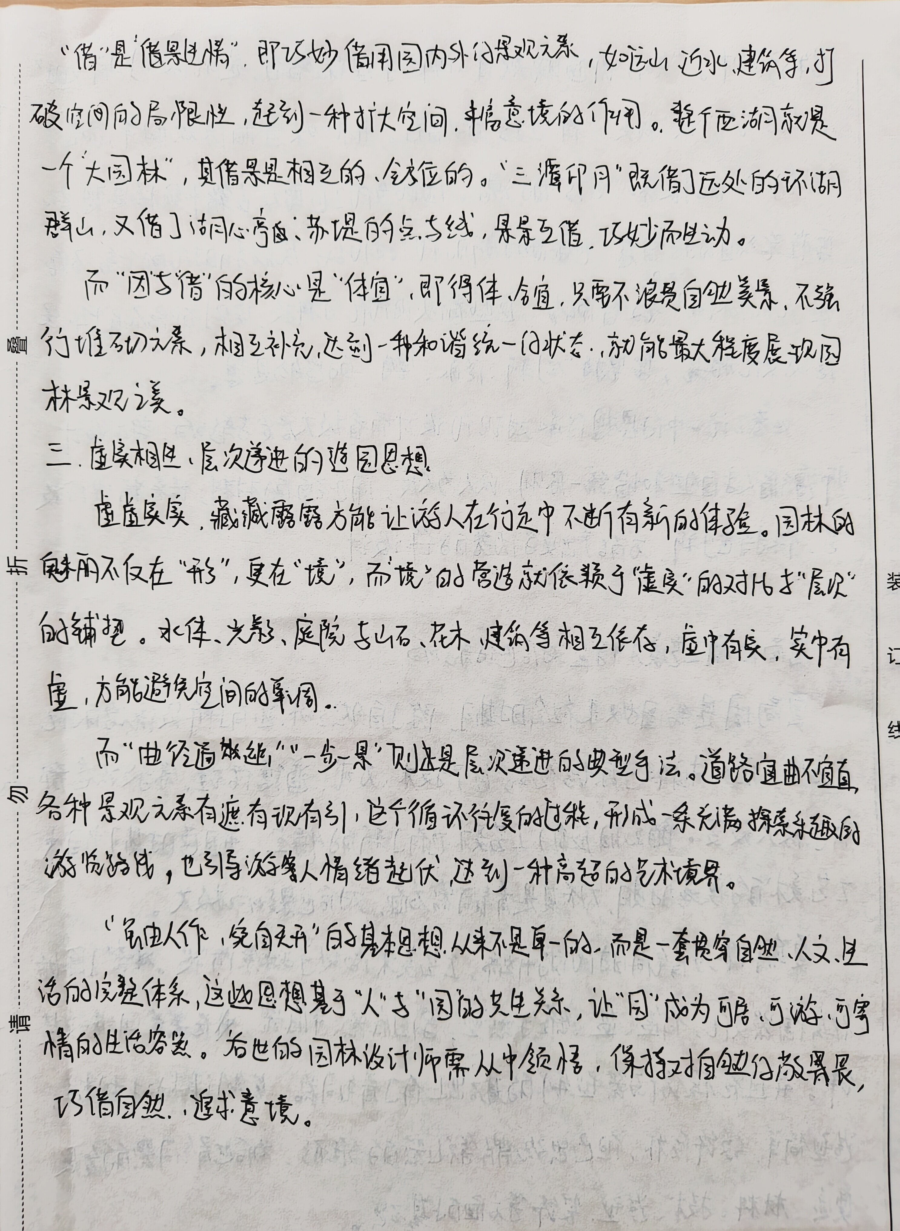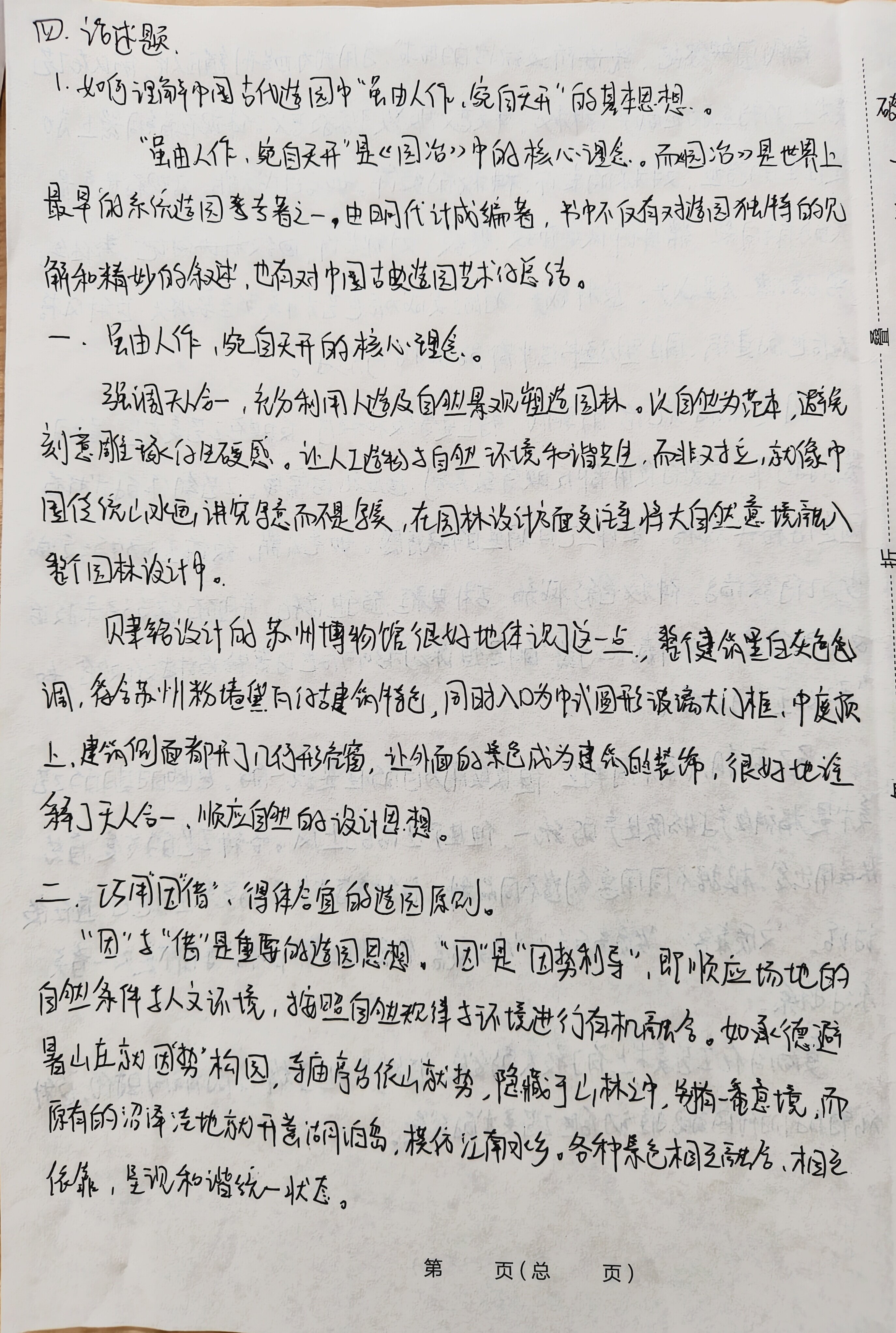 一.填空题 1.秦兵马俑 2、《天工开物》 3.夹缬、蜡缬、绞缬、碱印、拓印 4. 画象砖、瓦当 5.饕餮纹 二、名词解释 1.甲骨文 起源于商朝晚期至西周时期,是刻于龟甲兽骨上仔外文字,属于汉 字的早期形态。它们被用了祭祀,预测吉凶等仪式。甲骨文化节字方式不固 足,同一个字可能有多种写法,具有极大变通性,这些独特的符号形式代表着古 人对日常生活、自然界、社会秩序等各方面的认知和记录。同时,它也是一 种艺术形式,具有艺术性和装饰性。符号形态的变化和线条的流动性展 示出古人们对于美追求代表着与人的智慧创造力,为探索中国古代发 展提供主要价值 2.宋代瓷器 宋代是中国古代陶瓷艺术发展的巅峰,被誉为“瓷白时代”。宋代瓷 密遍布全国各地,在南方有景德镇密、龙泉密、哥密等,北方有定密、汝窑、启密 等,其中最著名仔五大名窖为“哥、宫、汝、定、均”。宋瓷在色彩上的特点体现 在采色增多,除了原有的脊瓷、白瓷外,创造了彩瓷、花釉瓷;装饰方法也丰富 多样,有刻花、划花、印花、以及运用树叶剪纸等;装饰题材上,喜用折枝 花以及飞鸟虫鱼、这样秀丽、线条流畅、几何纹很少,体现了清新、典雅仔艺 术特色,是中国工艺美术中的杰出代表。 第 页(总 页) 3.螺钢 一种传统装饰工艺,主要应用在漆器、然、铜镜上。在添要上,即在 面上刻花纹,然后用螺细等物填嵌进去。这种工艺最早出现于两周,至 漆背嵌螺细镜已属常见,但多为厚螺锢。元以后,又有了较大发展,明清 达到最高峰,薄螺钮器普遍,比厚螺细器更精密细致,且不仅用来装饰小 物品,还用作柜、桌等大件家具。工匠们制作时,不仅拒不同 根据据花纹的不同部分使用不包彩的螺钮,还在嵌片上加划痕,以更好 表现细部。有些螺钮器还加以金银片,此外还有衬色细嵌,呈现五彩改改 的效果。该工艺充分展现中国与代向超的后人技艺。 4.《髹饰录》 是中国现存唯一门古代添艺专著。明代黄大成所著,成书于明末。是一部 艺仔创作实践总结。它详细叙述了制漆的工具及材料、制漆仔各种弊病 色漆的制配以及丰富多彩的装饰方法。系统阐述了添艺的创作原则,如“巧法 造化、质别人身、文象阴阳”,称为三法。也就是创作要以自然条件为依据;内质 犹如人体构造,骨肉相连,肥疫待体;文饰则以阴阳呼之,虚实相互。涵盖天 人合一份设计理念,追求精致古朴的美学标准,对现今都有启发,是一部集大 戊式仔著作。 结物精神。“知者”即通晓规律、明达事理的智者,是能做到明“无时” 识“地气”,认“材美”,有“工巧”的智者。并不一味遵循陈规旧举,而是守 任“创物”的根和“工巧”的魂。因此当代工匠要从古籍中领悟思想,既 要懂老祖练的智慧,也要面对新时代的挑战、完成新时代的任务,不论 还是 是“人机协同 “数智融合”,这些看似现代化的科技,实则都离不开中华深 厚的文化根基,要坚持“创新、传承、坚守”的造物思想。 m 《考工记》中仔思想传承对现代设计有着极大启发与影响,要求设计 师遵循人与自然和谐统一原则,以人为尺度,用正确的材料,培养精湛技 艺,保持创新,方能产出更多优秀的设计。 装 订 2.夏商西周工艺美术特点对后世纪影响 线 复商周是我国奴隶社会时期,除了自然之外,还有]阶级统治的社 会力量,因此相较于原始社会,生产技术、方式、道德伦理、宗教观念都 有了极大改变。随之相应的工艺美术 也有了新的特点,并且这时期中国中 工艺美术的奠基时期,灯其是青铜器方面,对后世影响极大。 夏朝作为青铜时代的开端,工艺美术尚处于探索阶段。承裂了原始 社会陶器文化,有盆、盘、罐等器型、多圆底器、平底器,在器表用绳纹装 饰。并且在模仿陶器型制的基础上有了青铜器,虽制作相对粗糙, 造型简单,纹饰质朴,但已出现鼎片等礼器的雏形,为后世青铜器的发展 奠定、材料、技术、造型、装饰等方面的基础。 第 页(总 页) 四.论述题 .如何理解中国古代造园中“虽由人作、宛自天开”的基本思想。 破 “虽由人作、宛自天开”是《园治》中的核心理念。而《园冶》是世界上 最早的系统造园专著之一,由明代计成编著,书中不仅有对造园独特的见 解和精妙的叙述,也有对中国古典造园艺术的总结。 一、虽由人作,宛自天开的核心理念。 m 强调天人合一,充分利用人造及自然景观塑造园林。以自然为范本,避免 刻意雕琢的生硬感。让人工造物与自然环境和谐共生,而非对立,就像巾 固传统山水画,讲究写意而不是写实,在园林设计方面交注重将大自然意境融入 整个园林设计中。 聿铭设计的苏州博物馆很好地体现了这一点,整个健筑里白灰色色 调,符合苏州粉墙黛瓦仔古建筑特色,同时入口为中式圆形玻璃大门框、中庭顶 上,建筑侧面都开了几何形壳窗,让外面的景色成为建筑的装饰,很好地 释了天人合一、顺应自然的设计思想, 二、巧用因“借”、得体合宜的造圆原则。 “因”与“借”是重要的造园思想。“因”是“因势利导”,即顺应场地的 自然条件与人文环境,按照自然规律与环境进行有机融合。如承德避 青山丘就因势”构园,寺庙亭台依山就势,隐藏于山林之中,别有一番意境,而 原有的沼泽洼地就开凿湖泊岛,模仿江南水乡。各种景色相互融合,相互 依靠,呈现和谐统一状态。 第 页(总 页) “借”是借景迁情”,即巧妙借用园内外的景