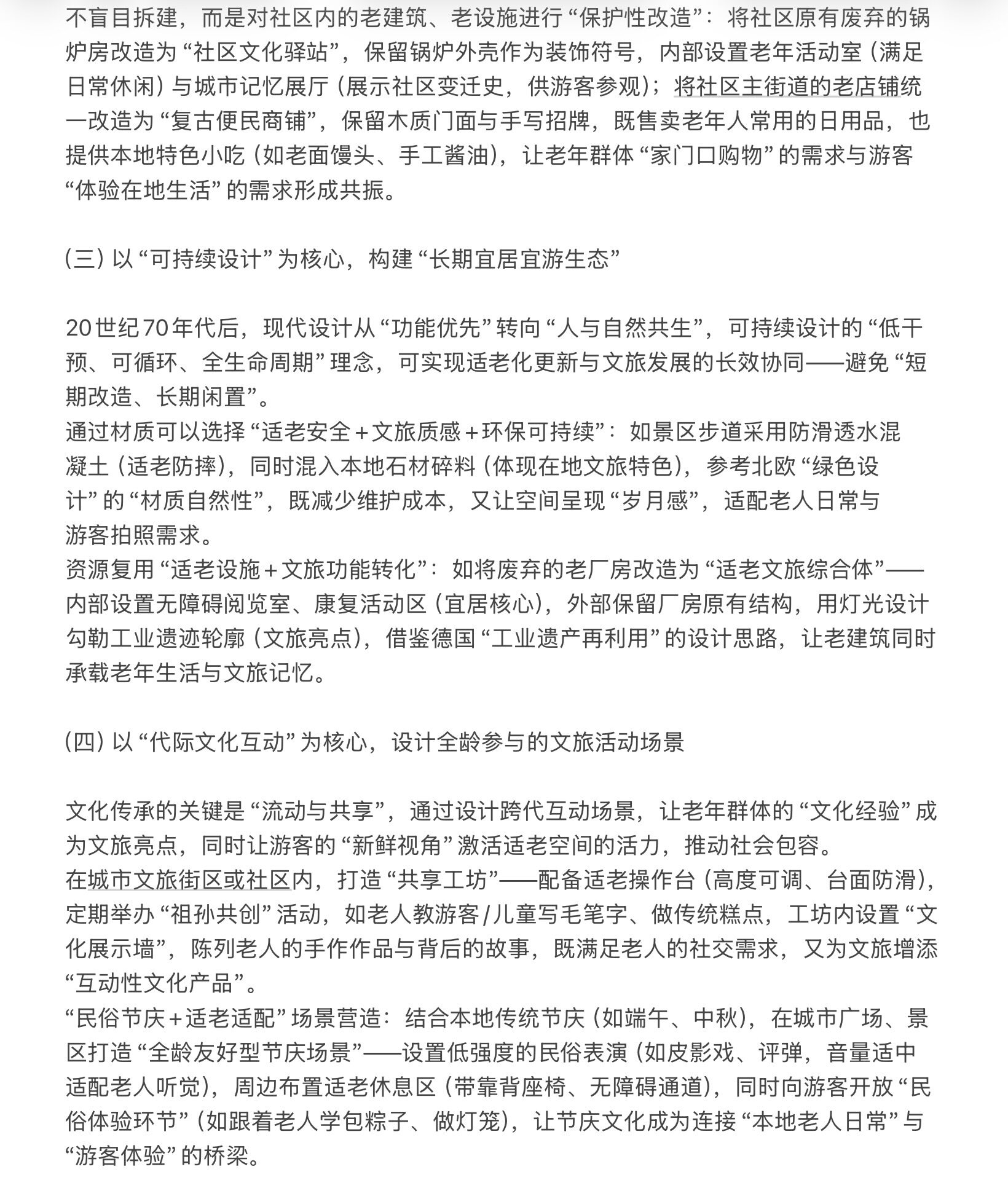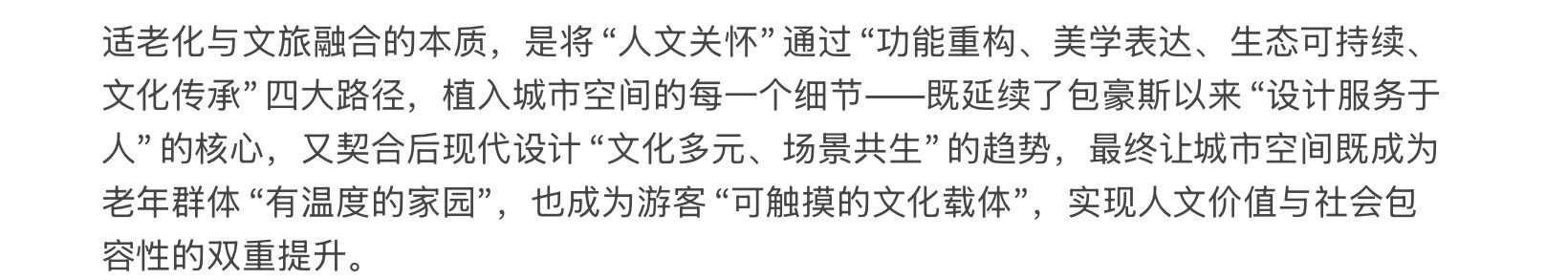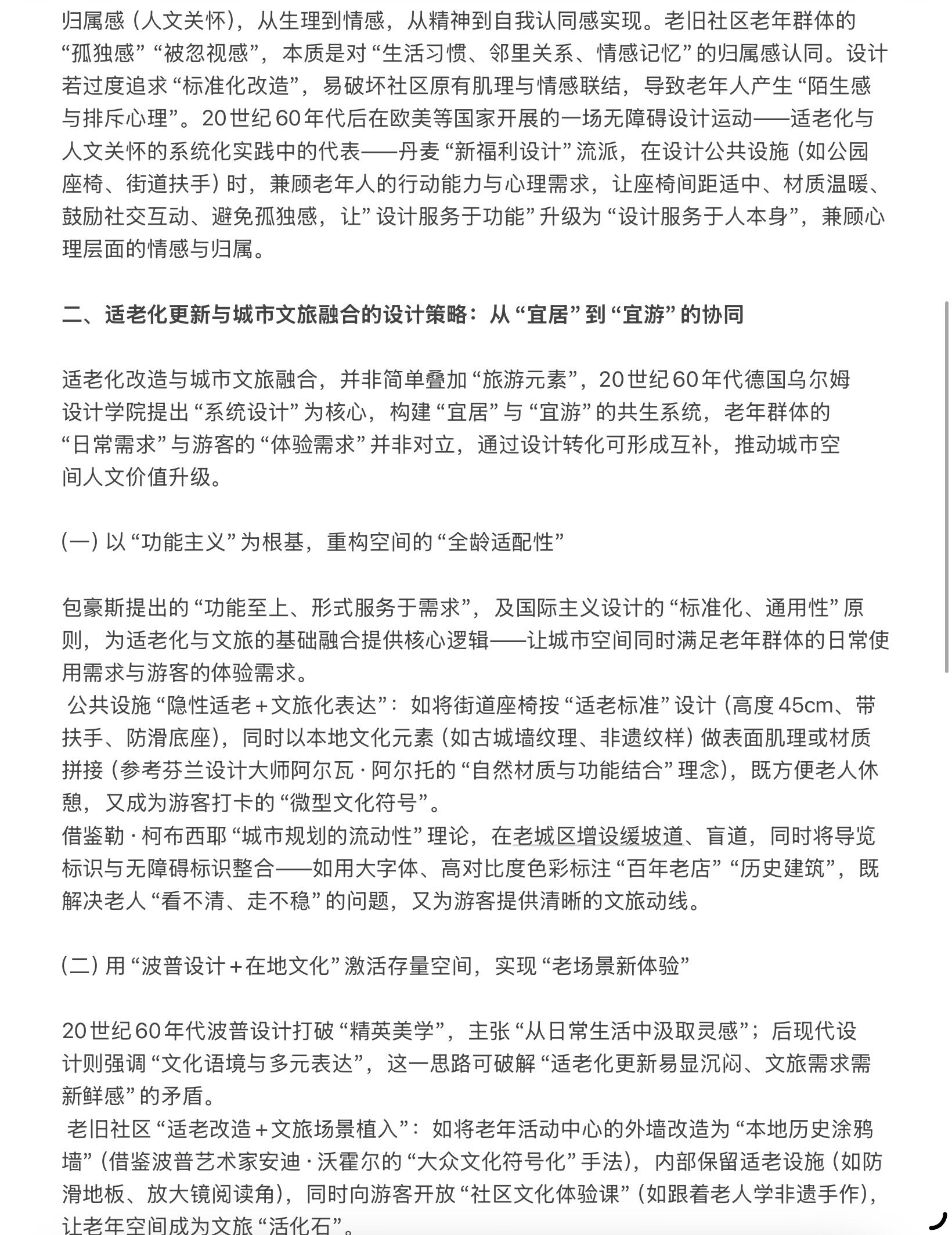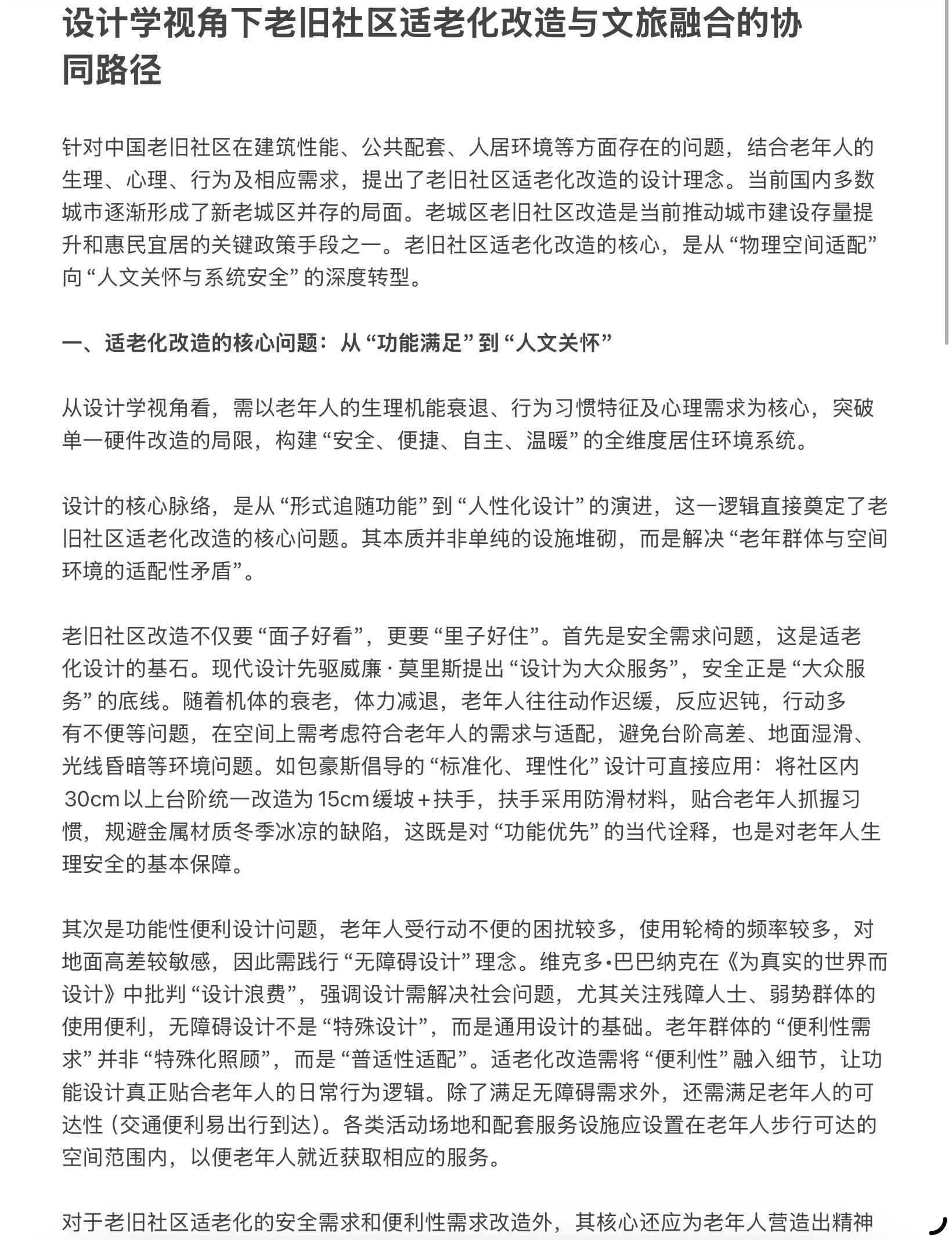 设计学视角下老旧社区适老化改造与文旅融合的协 同路径 针对中国老旧社区在建筑性能、公共配套、人居环境等方面存在的问题,结合老年人的 生理、心理、行为及相应需求,提出了老旧社区适老化改造的设计理念。当前国内多数 城市逐渐形成了新老城区并存的局面。老城区老旧社区改造是当前推动城市建设存量提 升和惠民宜居的关键政策手段之一。老旧社区适老化改造的核心,是从“物理空间适配” 向“人文关怀与系统安全”的深度转型。 一、适老化改造的核心问题:从“功能满足”到“人文关怀” 从设计学视角看,需以老年人的生理机能衰退、行为习惯特征及心理需求为核心,突破 单一硬件改造的局限,构建“安全、便捷、自主、温暖”的全维度居住环境系统。 设计的核心脉络,是从“形式追随功能”到“人性化设计”的演进,这一逻辑直接奠定了老 旧社区适老化改造的核心问题。其本质并非单纯的设施堆砌,而是解决“老年群体与空间 环境的适配性矛盾”。 老旧社区改造不仅要“面子好看”,更要“里子好住”。首先是安全需求问题,这是适老 化设计的基石。现代设计先驱威廉·莫里斯提出“设计为大众服务”,安全正是“大众服 务”的底线。随着机体的衰老,体力减退,老年人往往动作迟缓,反应迟钝,行动多 有不便等问题,在空间上需考虑符合老年人的需求与适配,避免台阶高差、地面湿滑、 光线昏暗等环境问题。如包豪斯倡导的“标准化、理性化”设计可直接应用:将社区内 30cm以上台阶统一改造为15cm缓坡+扶手,扶手采用防滑材料,贴合老年人抓握习 惯,规避金属材质冬季冰凉的缺陷,这既是对“功能优先”的当代诠释,也是对老年人生 理安全的基本保障。 其次是功能性便利设计问题,老年人受行动不便的困扰较多,使用轮椅的频率较多,对 地面高差较敏感,因此需践行“无障碍设计”理念。维克多·巴巴纳克在《为真实的世界而 设计》中批判“设计浪费”,强调设计需解决社会问题,尤其关注残障人士、弱势群体的 使用便利,无障碍设计不是“特殊设计”,而是通用设计的基础。老年群体的“便利性需 求”并非“特殊化照顾”,而是“普适性适配”。适老化改造需将“便利性”融入细节,让功 能设计真正贴合老年人的日常行为逻辑。除了满足无障碍需求外,还需满足老年人的可 达性(交通便利易出行到达)。各类活动场地和配套服务设施应设置在老年人步行可达的 空间范围内,以便老年人就近获取相应的服务。 对于老旧社区适老化的安全需求和便利性需求改造外,其核心还应为老年人营造出精神 归属感(人文关怀),从生理到情感,从精神到自我认同感实现。老旧社区老年群体的 “孤独感”“被忽视感”,本质是对“生活习惯、邻里关系、情感记忆”的归属感认同。设计 若过度追求“标准化改造”,易破坏社区原有肌理与情感联结,导致老年人产生“陌生感 与排斥心理”。20世纪60年代后在欧美等国家开展的一场无障碍设计运动-适老化与 人文关怀的系统化实践中的代表-丹麦“新福利设计”流派,在设计公共设施(如公园 座椅、街道扶手)时,兼顾老年人的行动能力与心理需求,让座椅间距适中、材质温暖、 鼓励社交互动、避免孤独感,让”设计服务于功能”升级为“设计服务于人本身”,兼顾心 理层面的情感与归属。 二、适老化更新与城市文旅融合的设计策略:从“宜居”到“宜游”的协同 适老化改造与城市文旅融合,并非简单叠加“旅游元素”,20世纪60年代德国乌尔姆 设计学院提出“系统设计”为核心,构建“宜居”与“宜游”的共生系统,老年群体的 “日常需求”与游客的“体验需求”并非对立,通过设计转化可形成互补,推动城市空 间人文价值升级。 (一)以“功能主义”为根基,重构空间的“全龄适配性” 包豪斯提出的“功能至上、形式服务于需求”,及国际主义设计的“标准化、通用性”原 则,为适老化与文旅的基础融合提供核心逻辑-让城市空间同时满足老年群体的日常使 用需求与游客的体验需求。 公共设施“隐性适老+文旅化表达”:如将街道座椅按“适老标准”设计(高度45cm、带 扶手、防滑底座),同时以本地文化元素(如古城墙纹理、非遗纹样)做表面肌理或材质 拼接(参考芬兰设计大师阿尔瓦·阿尔托的“自然材质与功能结合”理念),既方便老人休 憩,又成为游客打卡的“微型文化符号”。 借鉴勒·柯布西耶“城市规划的流动性”理论,在老城区增设缓坡道、盲道,同时将导览 标识与无障碍标识整合--如用大字体、高对比度色彩标注“百年老店”“历史建筑”,既 解决老人“看不清、走不稳”的问题,又为游客提供清晰的文旅动线。 (二)用“波普设计+在地文化”激活存量空间,实现“老场景新体验” 20世纪60年代波普设计打破“精英美学”,主张“从日常生活中汲取灵感”;后现代设 计则强调“文化语境与多元表达”,这一思路可破解“适老化更新易显沉闷、文旅需求需 新鲜感”的矛盾。 老旧社区“适老改造+文旅场景植入”:如将老年活动中心的外墙改造为“本地历史涂鸦 墙”(借鉴波普艺术家安迪·沃霍尔的“大众文化符号化”手法),内部保留适老设施(如防 滑地板、放大镜阅读角),同时向游客开放“社区文化体验课”(如跟着老人学非遗手作), 让老年空间成为文旅“活化石”。 不盲目拆建,而是对社