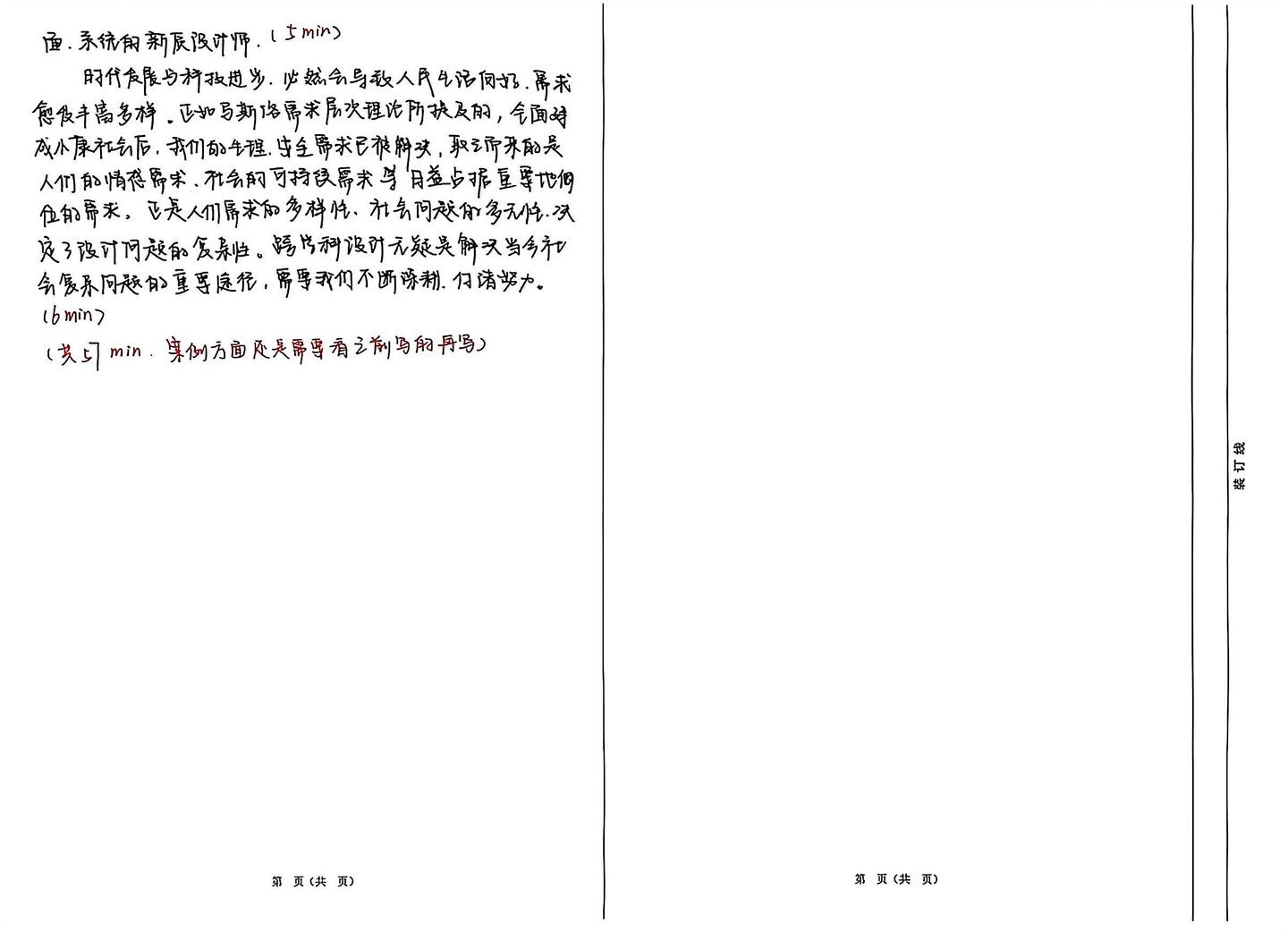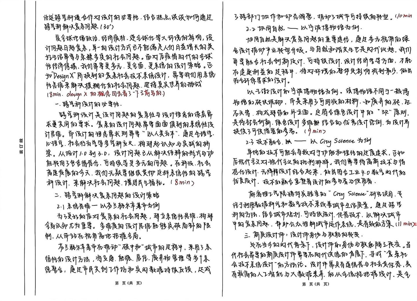 面,系统的新质设计师。(5min) 时代发展与科技进步,必然会导致人民生活向好,需求 愈发丰富多样。正如马斯洛需求层次理论所提及的,全面建 成小康社会后,我们的生理,安全需求已被解决,取而来的是 人们的情感需求,社会的可持续需求等日益占据重要地制 位的需求,正是人们需求的多样性,社会问题的多元性,决 定了设计问题的复杂性。跨学科设计无疑是解决当今社 会复尽问题的重要途径,需要我们不断深耕,付诸努力。 (6min) (共57min. 果例方面还是需要看之前写的再写) 第! 页(共页) 第页(共页)