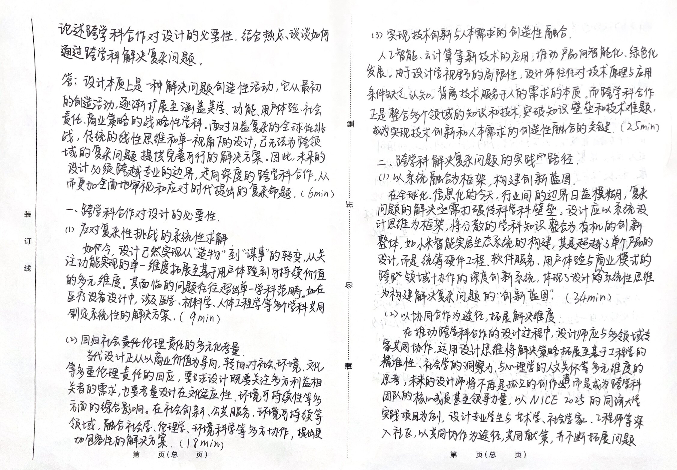 论述跨学科合作对设计的必要性,结合热点谈谈如何 (3)实现技术创新与人本需求的创造性融合. 通过跨学科解决复杂问题。 人工智能、云计算等新技术的应用,推动产品向智能化、绿色化 发展。由于设计学视野的局限性,设计师往往对技术原理与应用 答:设计,本质上是一种解决问题创造性活动,它从最初 的本质 的 条件缺乏认知,自技术服技术突破知识壁垒和技术难题, 知识禾 皮知识 主题, 责任.商业策略的战略性学科。面对日益复杂的全球性挑 m 成为实现技术创新和人本需求的创造性融合的关键.(25min) 或性思维和单一视角下的设 域 因此, 设计必须跨越专业的边界,走向深度的跨学科合作从 二、跨学科解决复杂问题的实践路径 . 界,走向深度的跨学 二从 (1)以系统融合为框架,构建创新蓝图. 而更加全面地审视和应对时代提出的复杂命题。(6min) 在全球化、信息化的今天,行业间的边界日益模糊,复杂 装 一、跨学科合作对设计的必要性. 问题的解决亟需打破传科学科壁垒。设计应以系统设 (1)应对复杂性挑战的系统性求解 整体,如小米智能实居生态系统的构建,其是超越了单个产品的 汁思维为框架,将分散的学科知识整合为有机的创新 订 如今 线 注功能实现的单一维度拓展至其于田户体验到可持续价值 设计,而是统筹硬件工程、软件服务、用户体验与商业模式的 难度。其面儿 有 跨领域协作的深度创新系统,体现了设计系统性思维 医疗设备设计中,的问题往往超出单一学样范畴,如在 为构建解决复杂问题的“创新蓝图”。(34min) 及医学 体工 共同 制定系统性的解决方案。(9min) (2)以协同合作为途径,拓展解决维度. 在推动跨学科合作的设计过程中,设计师应与多领域专 (2)回归 的多元化考量 共同 当代设计正 精准性,运用设计思维将解决策略拓展至基于工程学的 向对社会 等多重伦理责任的回应,要求设计既要关注多方利益相 思考,未来的设计师将不再是孤立的创作者,而是成为跨学科 理学的人 的 关 量 在文化 适应 、环境可持续性 团队的核心成员甚至领导力量,以NICE2025的同济大学 方面 。在社会创亲 领域,融合社会学,伦理学环境科学等守续导 实践项目为例,设计专业学生与艺术学、社会学家、工程师等深 学、伦理崇 协作,提出更 入社区,以共同协作为途径,共同献策,并不断拓展问题 加包容性的解决方案.(18min) 第 页(总 页) 第 页(总 页)
