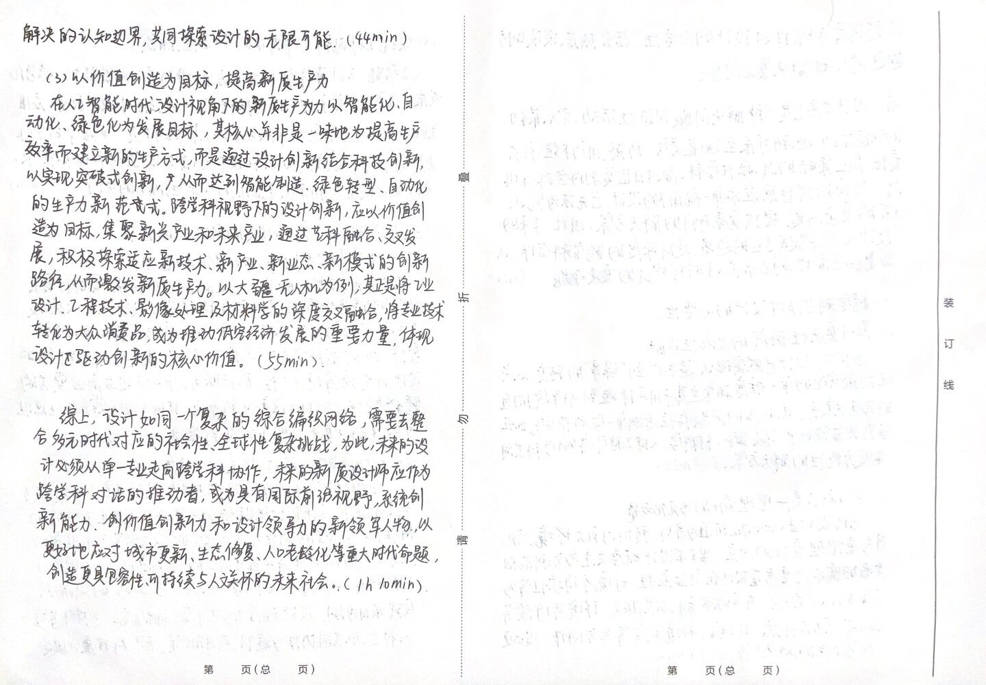 解决的认知边界,共同探索设计的无限可能.(44min) 18 (3)以价值创造为目标,提高新质生产力 在人工智能 动化、绿色化为代设计的新质生产为力以智能化、自 生产 效率而建立新的生产方式,而是通过设计创新结合科技创新, 以实 现突破式创新,从 的生产力新范术跨学科视下制造、绿色转型、自动化 下的设 造为目标,集聚新兴产业和未来产业,通过艺科融合、交叉发 路径应新技术、新产业、新业态、新模式的创新 泼新质生产力。 机为例,其工 工业 设计、工程技术、影像处理及材料学的深度交叉融合,将专业技术 装 转化为大众消费品,成为推动低空经济发展的重要力量,体现 订 设计区驱动创新的核心价值。(55min) 线 综上,设计如同一个复杂的综合编织网络,需要去整 R 合多元时代对应的社会性、全球性复杂挑战,为此,未来的设 计必须从单一专业走向跨学科协作,未来的新质设计师应作为 跨学科对话的推动者,成为具有国际前治视野,系统创 新能力、创价值创新力和设计领导力的新领军人物,以 更好地应对城市更新、生态修复、人口老龄化等重大时代命题, 创造更具包容性、可持续与人文关怀的未来社会。(1h10min) 第 页(总 页) 第 页(总 页)