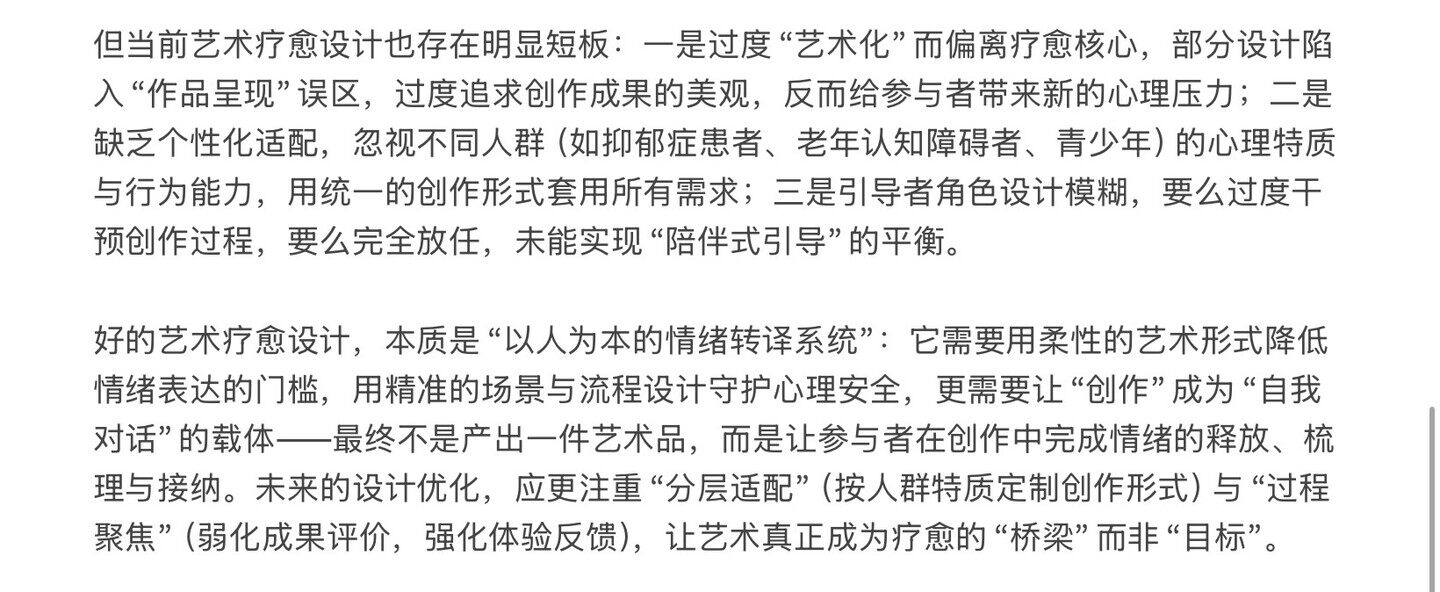 但当前艺术疗愈设计也存在明显短板: 一是过度“艺术化”而偏离疗愈核心,部分设计陷 入“作品呈现”误区,过度追求创作成果的美观,反而给参与者带来新的心理压力; ; 二是 缺乏个性化适配,忽视不同人群(如抑郁症患者、老年认知障碍者、青少年)的心理特质 与行为能力,用统一的创作形式套用所有需求; 三是引导者角色设计模糊,要么过度干 预创作过程,要么完全放任,未能实现“陪伴式引导”的平衡。 好的艺术疗愈设计,本质是“以人为本的情绪转译系统”: 它需要用柔性的艺术形式降低 情绪表达的门槛,用精准的场景与流程设计守护心理安全,更需要让“创作”成为“自我 对话”的载体-最终不是产出一件艺术品,而是让参与者在创作中完成情绪的释放、梳 理与接纳。未来的设计优化,应更注重“分层适配”(按人群特质定制创作形式)与“过程 聚焦”(弱化成果评价,强化体验反馈),让艺术真正成为疗愈的“桥梁”而非“目标”。