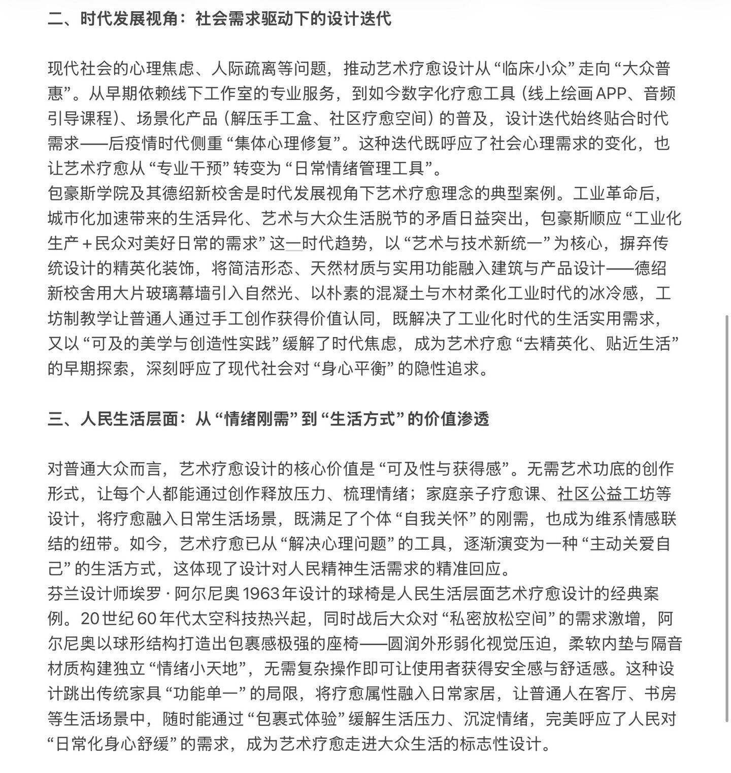 二、时代发展视角: 社会需求驱动下的设计迭代 现代社会的心理焦虑、人际疏离等问题, 推动艺术疗愈设计从“临床小众”走向“大众普 惠”。从早期依赖线下工作室的专业服务,到如今数字化疗愈工具(线上绘画APP、音频 引导课程)、场景化产品(解压手工盒、社区疗愈空间)的普及,设计迭代始终贴合时代 需求-后疫情时代侧重“集体心理修复”。这种迭代既呼应了社会心理需求的变化,也 让艺术疗愈从“专业干预”转变为“日常情绪管理工具”。 包豪斯学院及其德绍新校舍是时代发展视角下艺术疗愈理念的典型案例。工业革命后, 城市化加速带来的生活异化、艺术与大众生活脱节的矛盾日益突出,包豪斯顺应“工业化 生产+民众对美好日常的需求”这一时代趋势,以“艺术与技术新统-”为核心,摒弃传 统设计的精英化装饰,将简洁形态、天然材质与实用功能融入建筑与产品设计-德绍 新校舍用大片玻璃幕墙引入自然光、以朴素的混凝土与木材柔化工业时代的冰冷感,工 坊制教学让普通人通过手工创作获得价值认同,既解决了工业化时代的生活实用需求, 又以“可及的美学与创造性实践”缓解了时代焦虑,成为艺术疗愈“去精英化、贴近生活” 的早期探索,深刻呼应了现代社会对“身心平衡”的隐性追求。 三、人民生活层面: :从“情绪刚需”到“生活方式”的价值渗透 对普通大众而言,艺术疗愈设计的核心价值是“可及性与获得感”。无需艺术功底的创作 形式,让每个人都能通过创作释放压力、梳理情绪;家庭亲子疗愈课、社区公益工坊等 设计,将疗愈融入日常生活场景,既满足了个体“自我关怀”的刚需,也成为维系情感联 结的纽带。如今,艺术疗愈已从“解决心理问题”的工具,逐渐演变为一种“主动关爱自 已”的生活方式,这体现了设计对人民精神生活需求的精准回应。 芬兰设计师埃罗·阿尔尼奥1963年设计的球椅是人民生活层面艺术疗愈设计的经典案 例。20世纪60年代太空科技热兴起,同时战后大众对“私密放松空间”的需求激增,阿 尔尼奥以球形结构打造出包裹感极强的座椅-圆润外形弱化视觉压迫,柔软内垫与隔音 材质构建独立“情绪小天地”,无需复杂操作即可让使用者获得安全感与舒适感。这种设 计跳出传统家具“功能单一”的局限,将疗愈属性融入日常家居,让普通人在客厅、书房 等生活场景中,随时能通过“包裹式体验”缓解生活压力、沉淀情绪,完美呼应了人民对 “日常化身心舒缓”的需求,成为艺术疗愈走进大众生活的标志性设计。