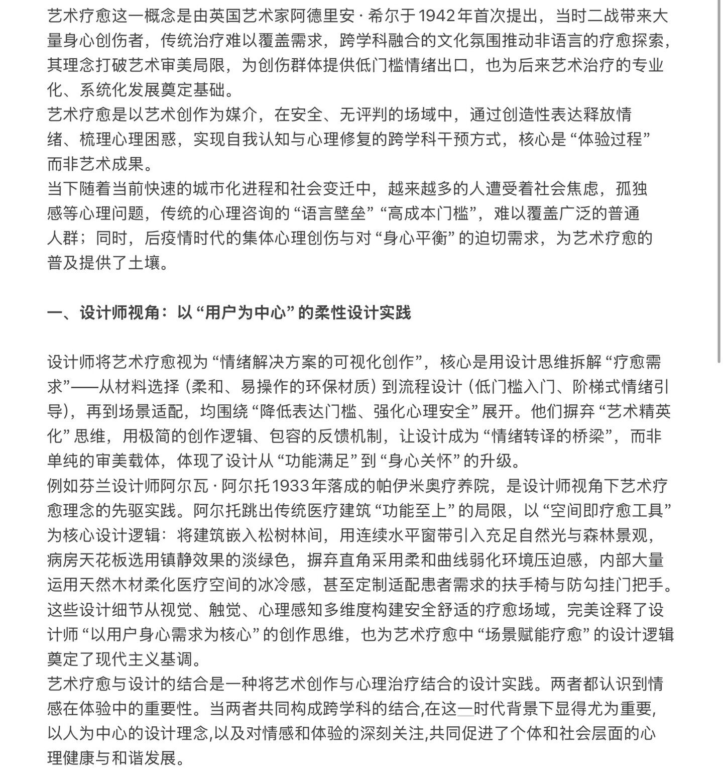 艺术疗愈这一概念是由英国艺术家阿德里安·希尔于1942年首次提出,当时二战带来大 量身心创伤者,传统治疗难以覆盖需求,跨学科融合的文化氛围推动非语言的疗愈探索, 其理念打破艺术审美局限,为创伤群体提供低门槛情绪出口,也为后来艺术治疗的专业 化、系统化发展奠定基础。 艺术疗愈是以艺术创作为媒介,在安全、无评判的场域中,通过创造性表达释放情 绪、梳理心理困惑,实现自我认知与心理修复的跨学科干预方式,核心是“体验过程” 而非艺术成果。 当下随着当前快速的城市化进程和社会变迁中,越来越多的人遭受着社会焦虑,孤独 感等心理问题,传统的心理咨询的“语言壁垒”“高成本门槛”,难以覆盖广泛的普通 人群; 同时,后疫情时代的集体心理创伤与对“身心平衡”的迫切需求,为艺术疗愈的 普及提供了土壤。 一、设计师视角: 以“用户为中心”的柔性设计实践 设计师将艺术疗愈视为“情绪解决方案的可视化创作”,核心是用设计思维拆解“疗愈需 求”从材料选择(柔和、易操作的环保材质)到流程设计(低门槛入门、阶梯式情绪引 导),再到场景适配,均围绕“降低表达门槛、强化心理安全”展开。他们摒弃“艺术精英 化”思维,用极简的创作逻辑、包容的反馈机制,让设计成为“情绪转译的桥梁”,而非 单纯的审美载体,体现了设计从“功能满足”到“身心关怀”的升级。 例如芬兰设计师阿尔瓦·阿尔托1933年落成的帕伊米奥疗养院,是设计师视角下艺术疗 愈理念的先驱实践。阿尔托跳出传统医疗建筑“功能至上”的局限,以“空间即疗愈工具” 为核心设计逻辑: 将建筑嵌入松树林间,用连续水平窗带引入充足自然光与森林景观, 病房天花板选用镇静效果的淡绿色,摒弃直角采用柔和曲线弱化环境压迫感,内部大量 运用天然木材柔化医疗空间的冰冷感,甚至定制适配患者需求的扶手椅与防勾挂门把手。 这些设计细节从视觉、触觉、心理感知多维度构建安全舒适的疗愈场域,完美诠释了设 计师“以用户身心需求为核心”的创作思维,也为艺术疗愈中“场景赋能疗愈”的设计逻辑 奠定了现代主义基调。 艺术疗愈与设计的结合是一种将艺术创作与心理治疗结合的设计实践。两者都认识到情 感在体验中的重要性。当两者共同构成跨学科的结合,在这一时代背景下显得尤为重要, 以人为中心的设计理念,以及对情感和体验的深刻关注,共同促进了个体和社会层面的心 理健康与和谐发展。