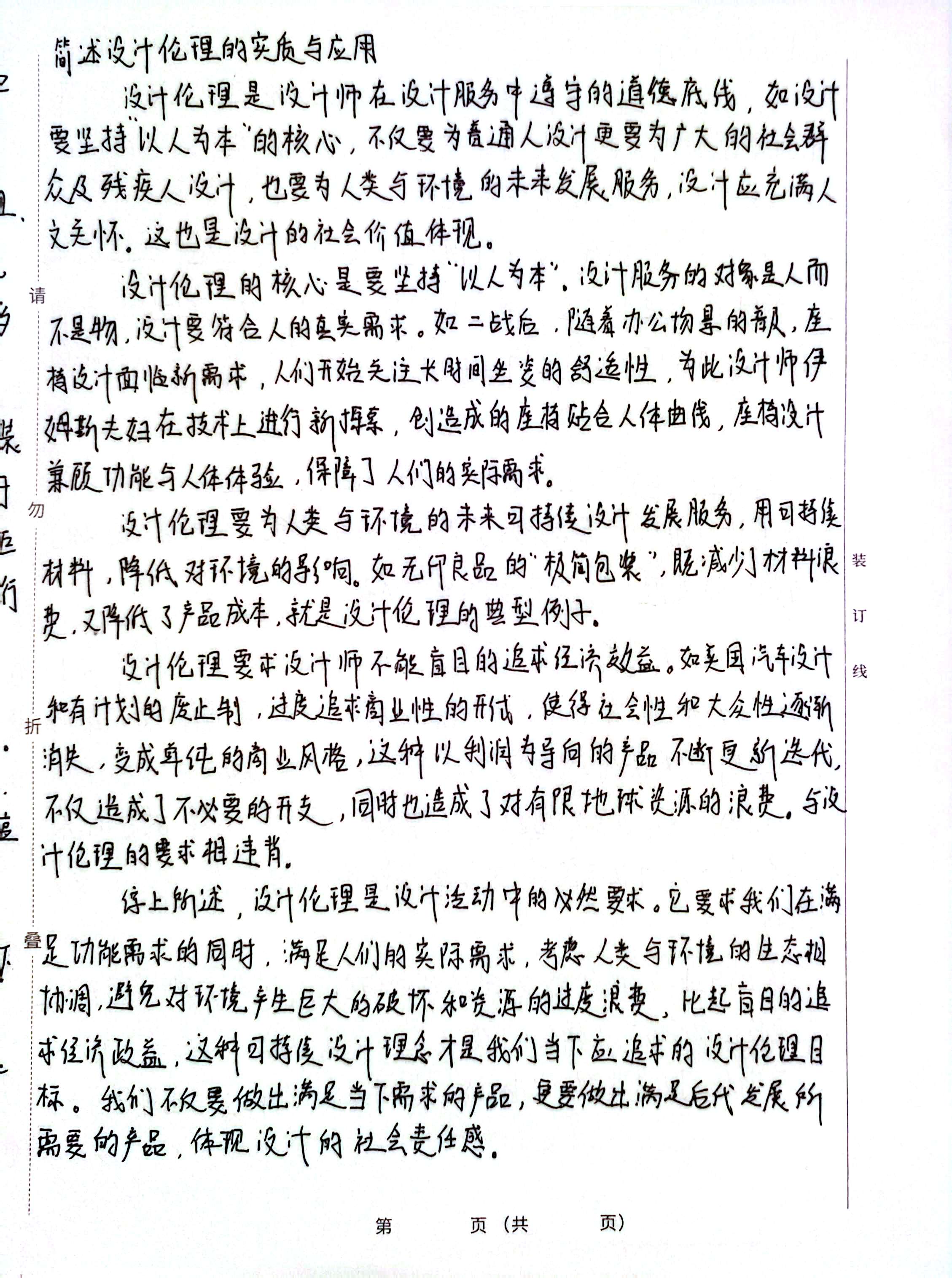 简述设计伦理的实质与应用 2 设计伦理是设计师在设计服务中遵守的道德底线,如设计 要坚持“以人为本”的核心,不仅要为普通人设计更要为广大的社会群 2. 众及残疾人设计,也要为人类与环境的未来发展服务,设计应充满人 文关怀。这也是设计的社会价值体现。 请 设计伦理的核心是要坚持“以人为本”。设计服务的对象是人而 夕 不是物,设计要符合人的真实需求。如二战后,随着办公场景的普及,座 持设计面临新需求,人们开始关注长时间生姿的舒适性,为此设计师伊 装 姆斯夫妇在技术上进行新探索,创造成的座椅贴合人体曲线,座椅设计 兼顾功能与人体体验,保障了人们的实际需求。 勿 巨 设计伦理要为人类与环境的未来可持续设计 发展服务,用可持续 行 材料,降低对环境的影响。如无印良品的“极筒包装”,既减少了材料浪 装 费,又降低了产品成本,就是设计伦理的典型例子. 订 设计伦理要求设计师不能盲目的追求经济效益。如美国汽车设计 线 折 和有计划的废止制,过度追求商业性的形式,使得社会性和大众性逐渐 消失,变成单纯的商业风格,这种以利润为导向的产品不断更新迭代, 高 不仅造成了不必要的开支,同时也造成了对有限地球资源的浪费。与没 计伦理的要求相违背。 综上所述,设计伦理是设计活动中的必然要求。它要求我们在满 下. 足功能需求的同时,满足人们的实际需求,考虑人类与环境的生态相 协调,避免对环境产生巨大的破坏和资源的过度浪费,比起盲目的追 求经济政益,这种可持续设计理念才是我们当下应追求的设计伦理目 标。我们不仅要做出满足当下需求的产品,更要做出满足后代发展所 需要的产品,体现设计的社会责任感。 第 页(共 页)