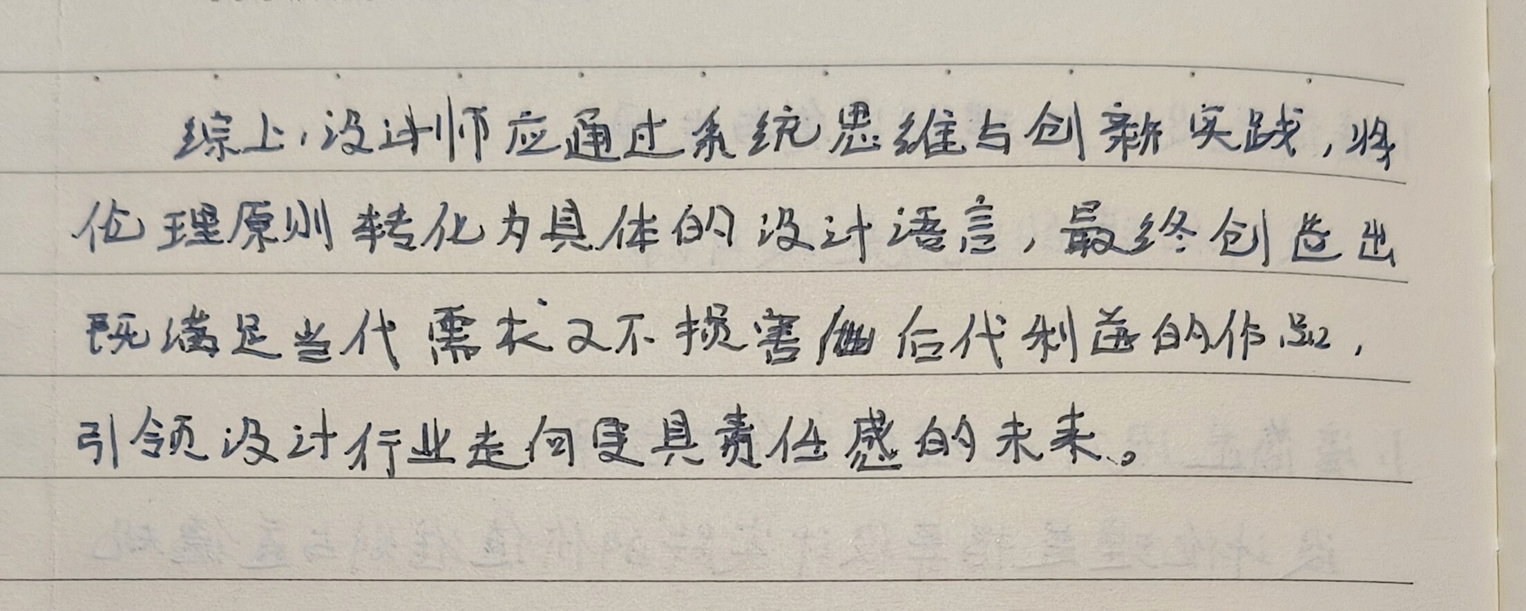 综上,设计师应通过系统思维与创新 实践,将 伦理原则转化为具体的设计语言,最终创造出 既满足当代需求又不损害他后代利益的作品 引领设计行业走向更具责任感的未来。