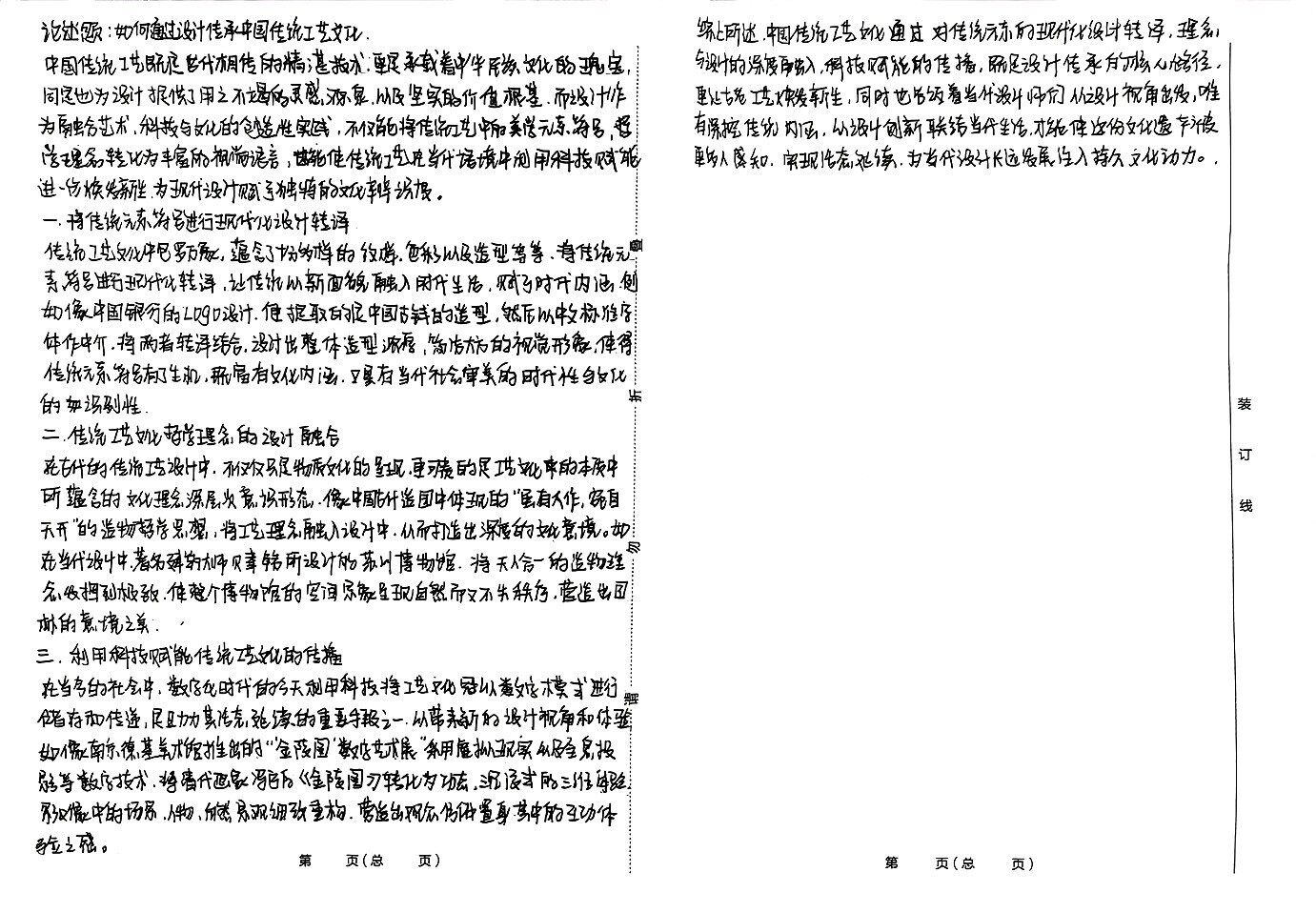 论述题:如何通过设计传承中国传统工艺文化。 综上所述,中国传统工艺文化通过对传统元素的现代化设计转译,理念 中国传统工艺既是世代相传的精;湛技术,更是承载着中华民族文化的瑰宝, 与设计的深度融入,科技赋能的传播,既足设计传承的核心路径, 同定也为设计提供了用之不竭的灵感源泉,以及坚实的价值根基,而设计作 更让古老工艺焕发新生,同时也告诉着当代设计师们从设计视角出发,唯 为融合艺术,科技与文化的创造性实践,不仅能将传统工艺中的美学元素符号, 有深挖传统内涵,认识4创新联结当代生活,才能使这份文化遗产被 学理念转化为丰富的视觉语言,能使传统工艺在当代语境中利用科技赋能 更多人感知,实现活态延续,为当代设计长远发展注入持久文化动力。, 进一步焕发新生,为现代设计赋予独特的文化辨识度. 一、将传统元素符号进行现代化设计转译 传统工艺文化中包罗方象,蕴念了十分多样的纹样,色彩以及造型等等,将传统无 素符号进行现代化转译,让传统以新面貌融入时代生活,赋予时代内涵,例 如像中国银行的LDgD设计,便捷取的是中国古钱的造型,然后以文标准学 体作中介,将两者转译结合,设计出整体造型浓厚,简洁大方的视觉形象,使得 传统元素符号有了生机,既富有文化内涵,又具有当代社会审美的时代性与文化 的知识别性. 装 二,传统工艺文化哲学理念的设计融合 在古代的传统工艺设计中,不仅仅只是物质文化的呈现,更可贵的是工艺文化的本质中 订 所蕴含的文化理念深层次意识形态,像中国古代造国中体现的“虽有人作,宛自 线 天开”的造物哲学思想,将工艺理念融入设计中,从而打造出深度的文化意境。如 在当代级4中,著名建筑大师贝章铭所设计的苏州博物馆,将天合一的造物理 尽 念发挥到极致,使整个博物馆的空间景象呈现自然而又不失秩序,营造出国 林的意境之美。 三、利用科技赋能传统工艺文化的传播 在当名的社会中,数字化时代的今天利用科技将工艺文化冠以数字模式进行 储存和传递,是助力其活态,延续的重要手段之一,以带来新的设计视角和体验 如像南京德基美术馆推出的"金陵图"数字艺术展"采用虚拟现实以及全息投 影等数字技术.将清代画家冯它的《金陵国》转化为功态,沉流式的三维体验 影像中的场景、人物、自然景观细改重构,营造出观众仿体置身,其中的互动体 验之感。 第 页(总 D 页) 第 页(总 页)