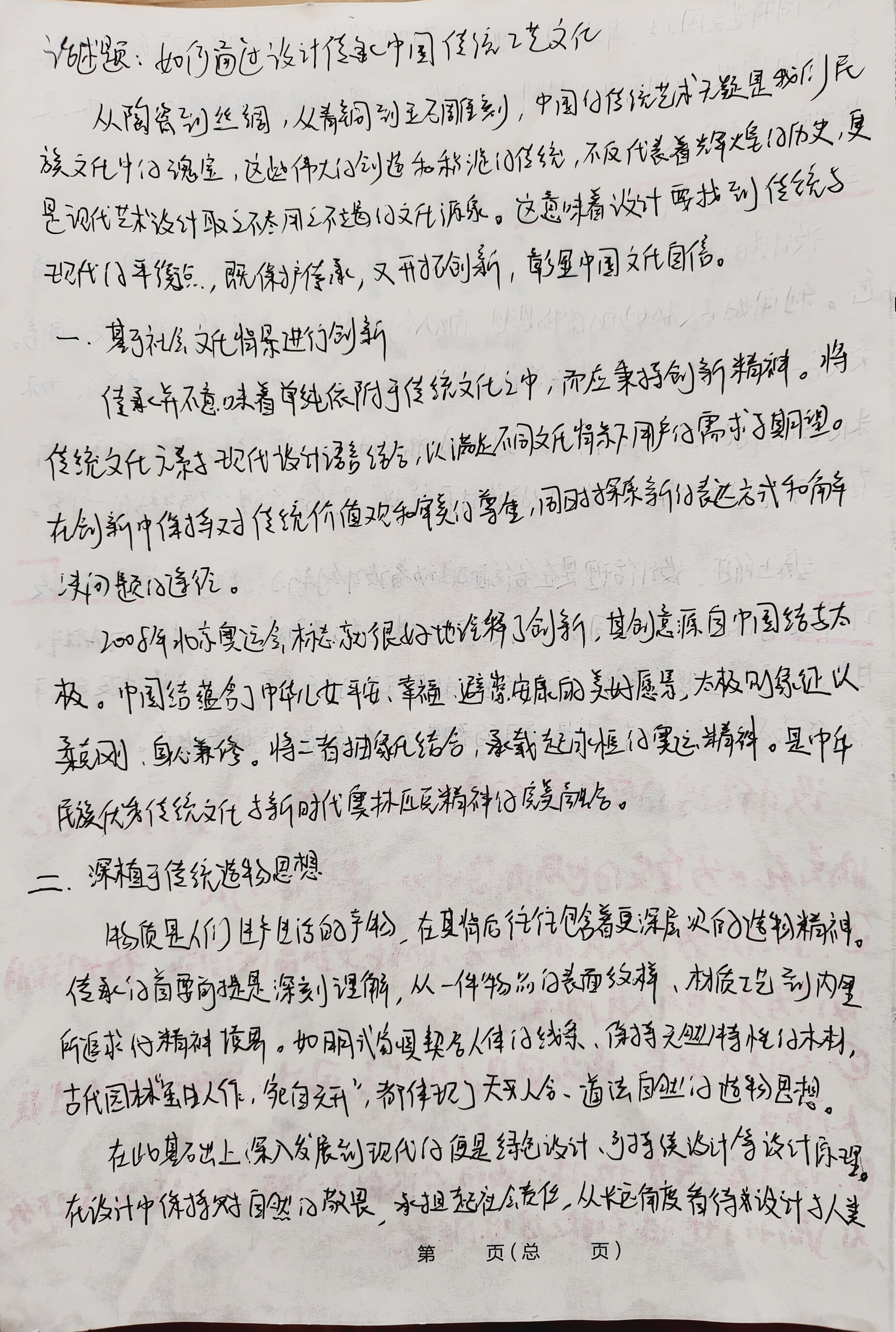 论述题:如何通过设计传承中国传统工艺文化 从陶瓷到丝绸,从青铜到立石雕刻,中国的传统艺术无疑是我们民 族又化中的魂宝,这些伟大的创造和积淀的传统,不仅代表着辉煌的历史,更 是现代艺术设计取之不尽用之不竭的文化源泉。这意味着设计要找到传统文 现代的平衡点,既保护传承,又开拓创新,彰显中国文化自信。 一、基于社会文化背景进行创新 0 传承并不意味着单纯依附于传统文化之中,而应秉持创新精神。将 传统文化元素与现代设计语言结合,以满足不同文化背景下用户的需求子期望。 在创新中保持对传统价值观和审美的尊重,同时探索新的表达方式和解 决问题的途径。 2008年北京奥运会,标志就很好地诠释了创新,其创意源自中国结与太 极。中国结蕴含了中华儿女平安、幸福、避崇安康的美好愿素,太极则象征以 克刚、身心兼修。将二者抽像化结合,承载起永恒的奥运精神。是中华 民族优秀传统文化与新时代奥林匹克精神的完美融合。 二.深植于传统造物思想 物质是人们生产生活的产物,在其背后往往包含着更深层次的造物精神。 传承的首要向提是深刻理解,从一件物品的表面纹样、材质工艺到内里 所追求仔精神境。如明式家具契合人体的线条、保持天然特性的木材, 古代园林“虽生人作,家自天开”,都体现了天人合、道法自然的造物思想。 在此基础上、深入发展到现代的便是绿色设计、可持续设计等设计原理 在设计中保持对自然的敬畏,承担起社会责任,从长远角度看待设计与人类 第 页(总 页)