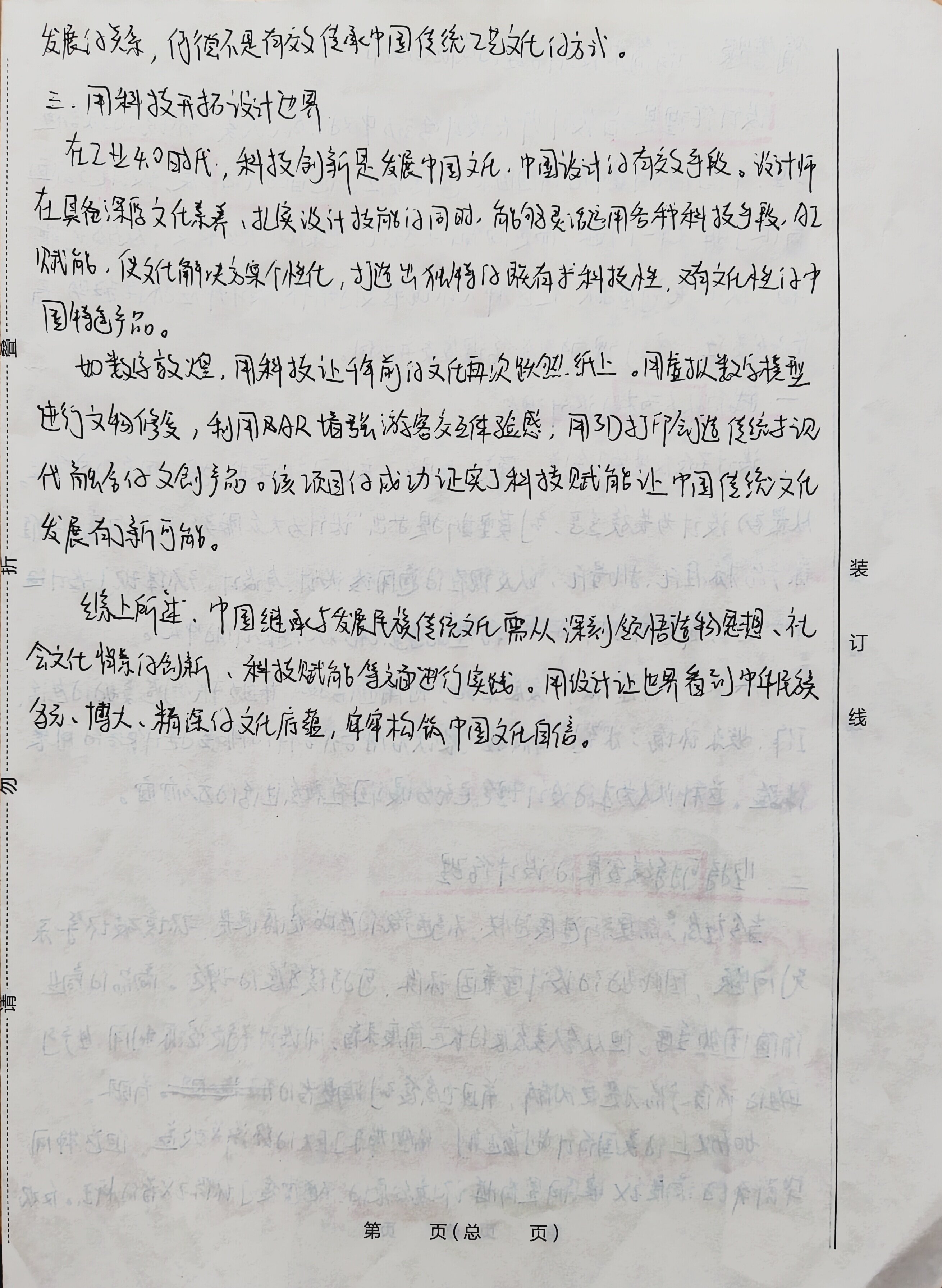 发展的关系,何德不是有效传承中国传统工艺文化的方式。 三.用科技开拓设计边界 在工业4.0时代,科技创新是发展中国文化,中国设计的有效手段。设计师 任具备深厚文化素养、扎实设计技能的同时,能够灵活运用各种科技手段,AI 赋能,使文化解决方案个性化,打造出独特的既有科技性,又有文化性仔中 国特色产品。 恤 如数字敦煌,用科技让千年前的文化再次跃然纸上。用虚拟数字模型 进行文物修复,利用AR增强游客交互体验感,用3D打印创造传统寸现 代触合文创产品。该项目的成功证实了科技赋能让中国传统文化 发展有了新可能。 州 装 综上所述,中国继承与发展民族传统文化需从深刻领悟造物思想、礼 订 会文化背景仔创新 7、科技赋能等方面进行实践。用设计让世界看到中华民族 多元、博大、精深仔文化底蕴,牢牢构筑中国文化自信。 线 区618 4561 8 10 第 页(总 页)