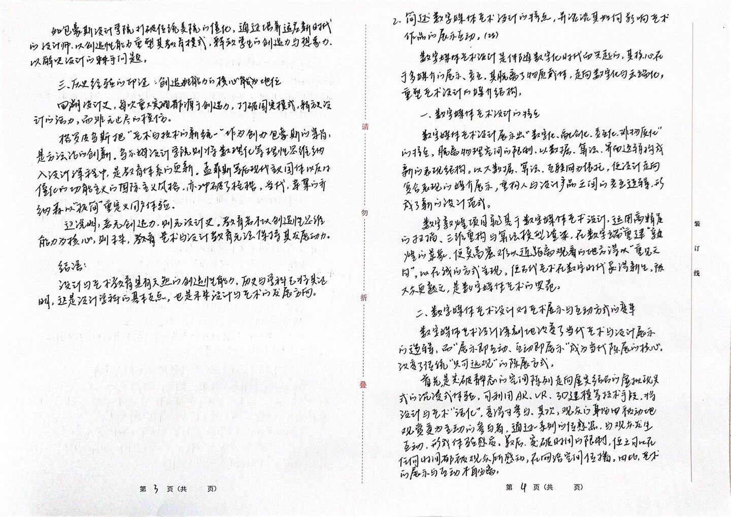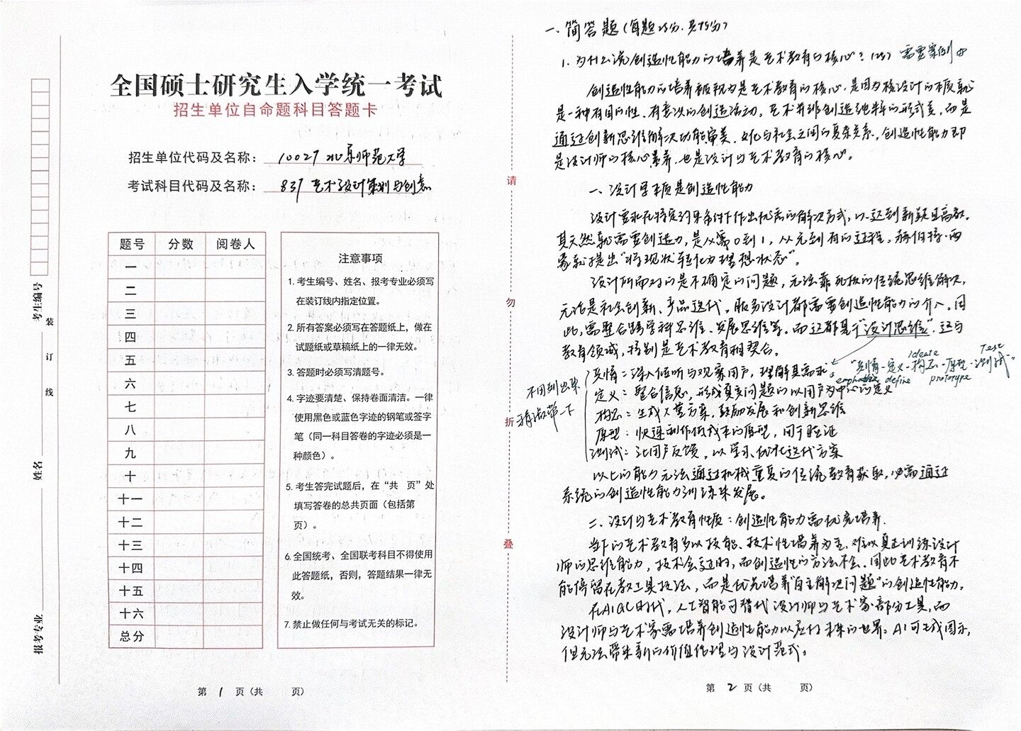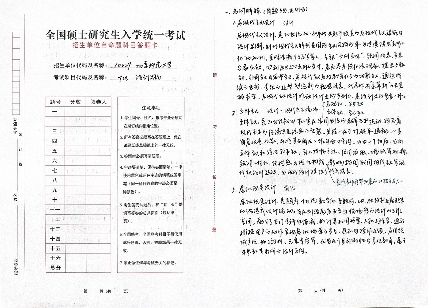 一、名词解释(每题5分,共(45分) 1.后现代主义设计 设计 全国硕士研究生入学统一考试 后现代主义设计,是20世纪60-80年代兴起于欧美的反现代主义建筑与 招生单位自命题科目答题卡 设计思潮,针对现代主义特别是国际主义风格的单一与冷漠提出去中心 招生单位代码及名称: 10027 北京师范大学 化”的批判。真理论源干上匠里等人,主张“少则乏味”,强调折衷,夏杂 与象征主义,回到历史与大众文化当中。詹克思系统化该理念.提出文脉 考试科目代码及名称: 728 设计史论 请 主义、引喻主义与装饰主义。后现代主义反对教条似的功能主义,通过戏 滤的色彩,合张的造型塑造新的视觉语言,代表作有“孟菲斯”的天其 题号 分数 阅卷人 顾书架,后现代主义设计推动设计走向多元化,是设计义的重要一环。 注意事项 了表现主义,未来主义 2.立体主义 设计一现代艺术流旅 二 1.考生编号、姓名、报考专业必须写 立体主义,至主义 在装订线内指定位置。 三 勿 立体主义,是20世纪初由毕加索在法国创立的光锋不运动,标志着 装 四 2.所有答案必须写在答题纸上,做在 现代艺术与传统写变绘画的决裂。其核心在于打破单一透视,从多 订 试题纸或草稿纸上的一律无效。 五 角度观察对象,并将其分解在=维平面中重构,分为=T阶段:分析 3.答题时必须写清题号。 六 立体主义和综合立体主义。引入拼帖手法,使用报低、墙纸等材料, 线 七 4.字迹要清楚、保持卷面清洁。一律 强调几何化、结构感与理性构成,影响国俄国构成主义等现 使用黑色或蓝色字迹的钢笔或签字 八 5 代主义设计运动,为现代设计提供了形式语言。 笔(同一科目答卷的字迹必须是一 九 3.虚拟现实设计 前沿 其代表作有毕加索的《格尔尼卡》 种颜色)。 十 5.考生答完试题后,在“共页”处 十一 虚拟现实设计,是随着11世纪数字化、互联网、VR、AR技术发展起来 填写答卷的总共页面(包括第 十二 11 的沉浸式设计活动。旨民创造高度交互与临场感的设计的三维 页)。 十三 空间,融合了多门学科与领域,如计算机图形学、人机工程学,通过 叠 十四 6.全国统考、全国联考科目不得使用 捕捉用户的动作实现虚拟场景的交互、感知与操作反馈。应用领 此答题纸,否则,答题结果一律无 十五 效。 域广泛,如游戏、元宇宙等。优势在于其即时性与直观数率。属于 一 十六 未来数字时代的设计方向。 7.禁止做任何与考试无关的标记。 总分 第 页(共 页) 第 页(共 页)