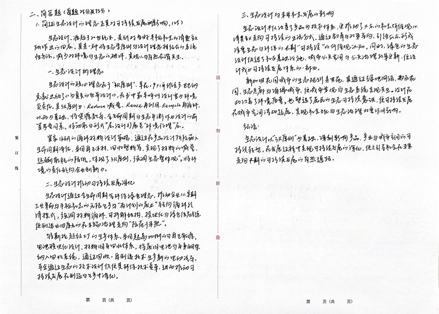 二、简答题(每题25分头75分) 三、生态设计对未来社会发展的影响 1、简述生态设计的理念及其对可持续发展的影响。(25) 生态设计不仅改变了产品与技术体系,更推动了大众的社会价值观从 生态设计。源起于20世纪末,是针对当时丰裕社会的消费主义 所作出的回应。其是一种将生态学原则与设计理念相结合的系统 消费主义走向可持该的生活方式。通过教育与政策导向,引领公众形成 性方法,减少对环境与生态的破坏,实现人与自然合谐共生。 A L 设计促进了社区基础设施.城市公共空间与公共治理政策更新,使没 注重生态与环保的长期“可持续”的价值观认知。同时,绿色的生态 一、生态设计的理念 计成为可持续发展体系的一部分, 生态设计的核心理念在于“原则”,早民1971年维至多,巴也纳 新加坡花园城市的生态规划是典范,其通过绿地网络.雨水花 克就出版了《为夏美的世界设计》,在书中最早呼吁设计要为环境 国,生态走廊与海绵城市,便城市景观与生态系统实现共生。设计在 负责任。其3R原则为:Reduce减量.Reuse再利用,Recycle再循环, 此改善了环境质量,也塑造了居民的生态可持续意识,便可持续发展 以此为基础,将资源效率,全生命同期与生态平衡作为设计的前 在城市空间得此延展,实现社会文化与生态治理双重作用影响。 置考量同素。将“功能与形式”层设计扩展至“环境伦理”层。 装 宜家1kEA的循环材料设计策略,通过在产品设计阶段嵌入 勿 绍语: 生态设计以3R原则”为基础,深刻影响产品、产业与城市空间的可 订 生命同期评估,采用再生环材,回收塑料等,实现了材料的减量. 持续转型。在发展过程中实现可持续发展的深化,便之引导社会在未来 运输能耗的降低。体现了32原则,强调“生态整体观”,将环 线 境的责任转向企业创新力。 走向天期的可持续发展的自然道路。 二、生态设计推动可持续发展深化 折 生态设计通过全生命同期等环保绿色理念,推动企业从早期 工业革命与手裕社会的无限生产与“有计划的废止”转向循环款 济模式,强调材料循环、可折解结构,换坏化与绿色供应链, 便利造业由原元的在端治理走向“防范于未然”。 特斯拉超级工厂的生产体系,采用超高比例的可再生能源, 叠 电池模决化设计、材料旧车回收体系,将废旧电池当身钢架 纳入回收系统,通过回收一再制造技术生产新的电动汽车, 车企通过生态的技术设计促使其环保技术变革,进而推动 持续发展在制造与生产中深化。 第 页(共 页) 第 页(共 页)