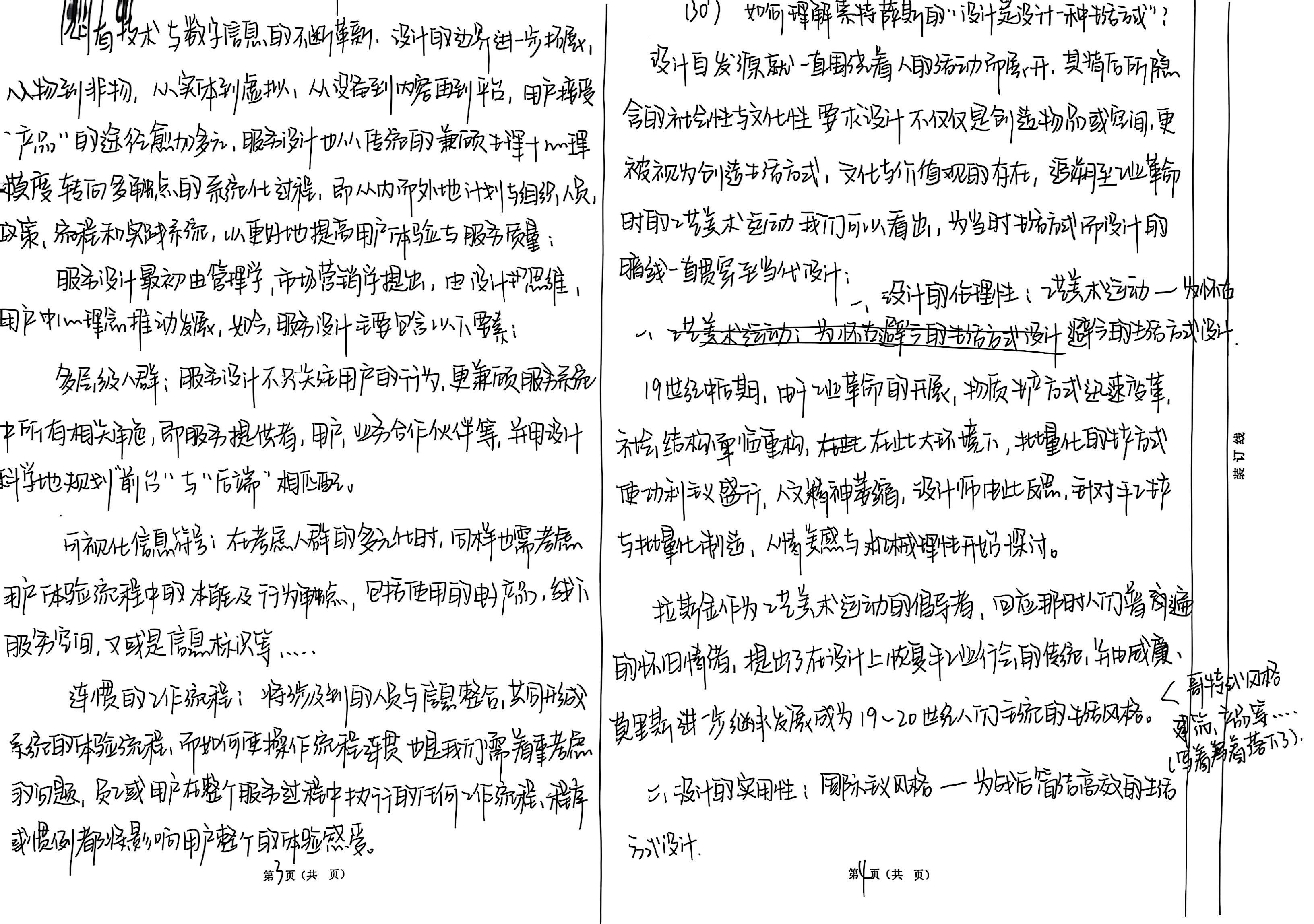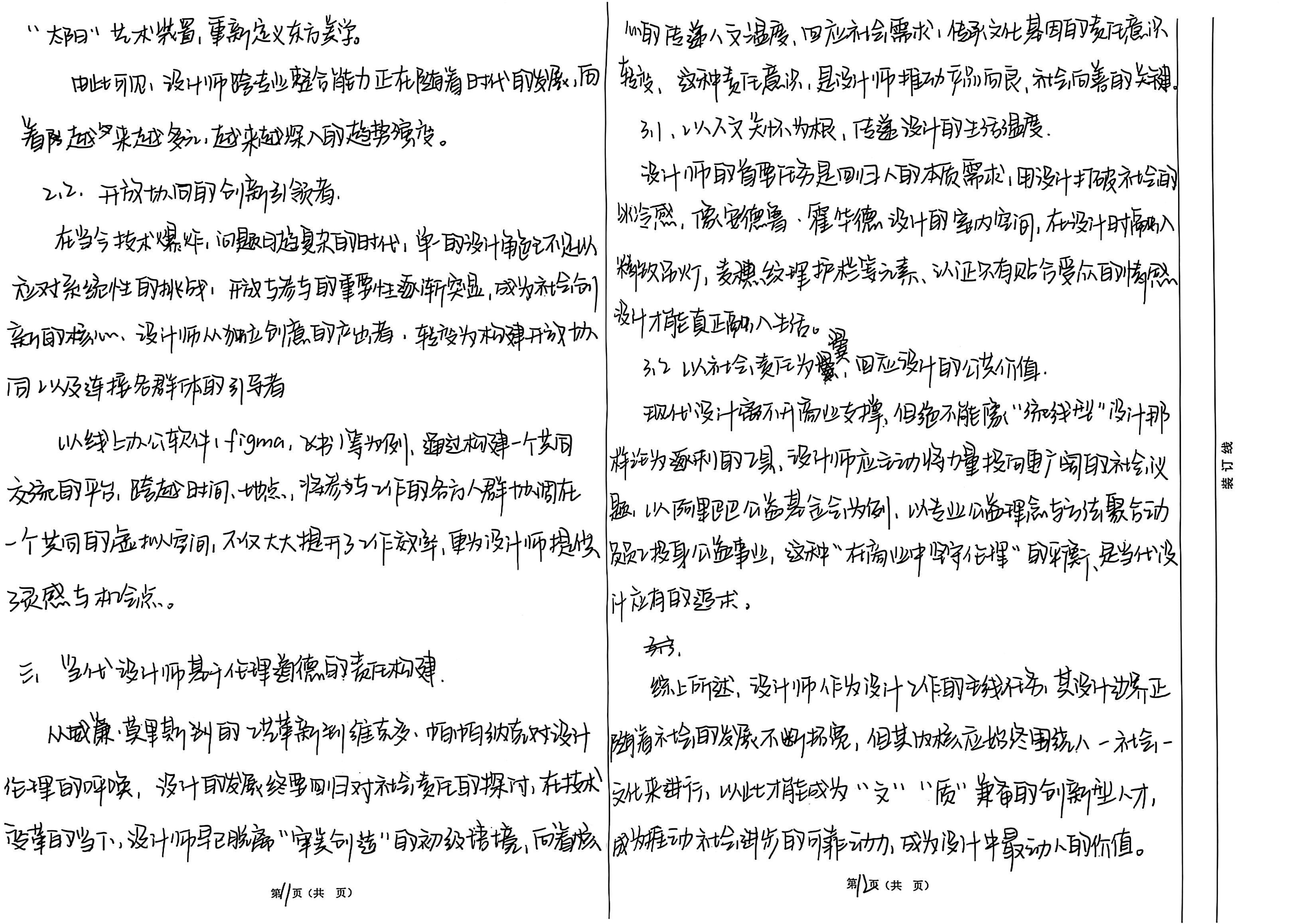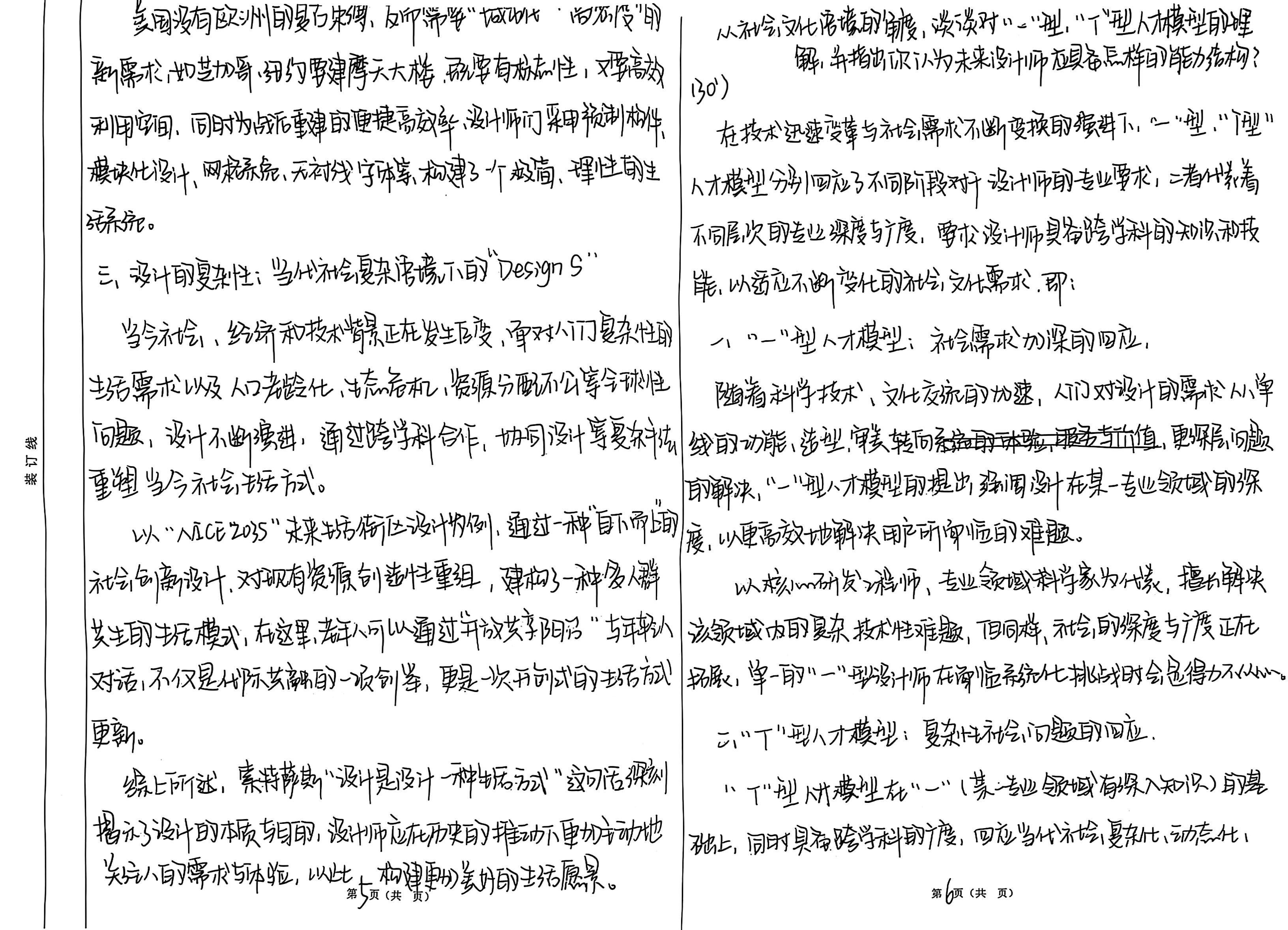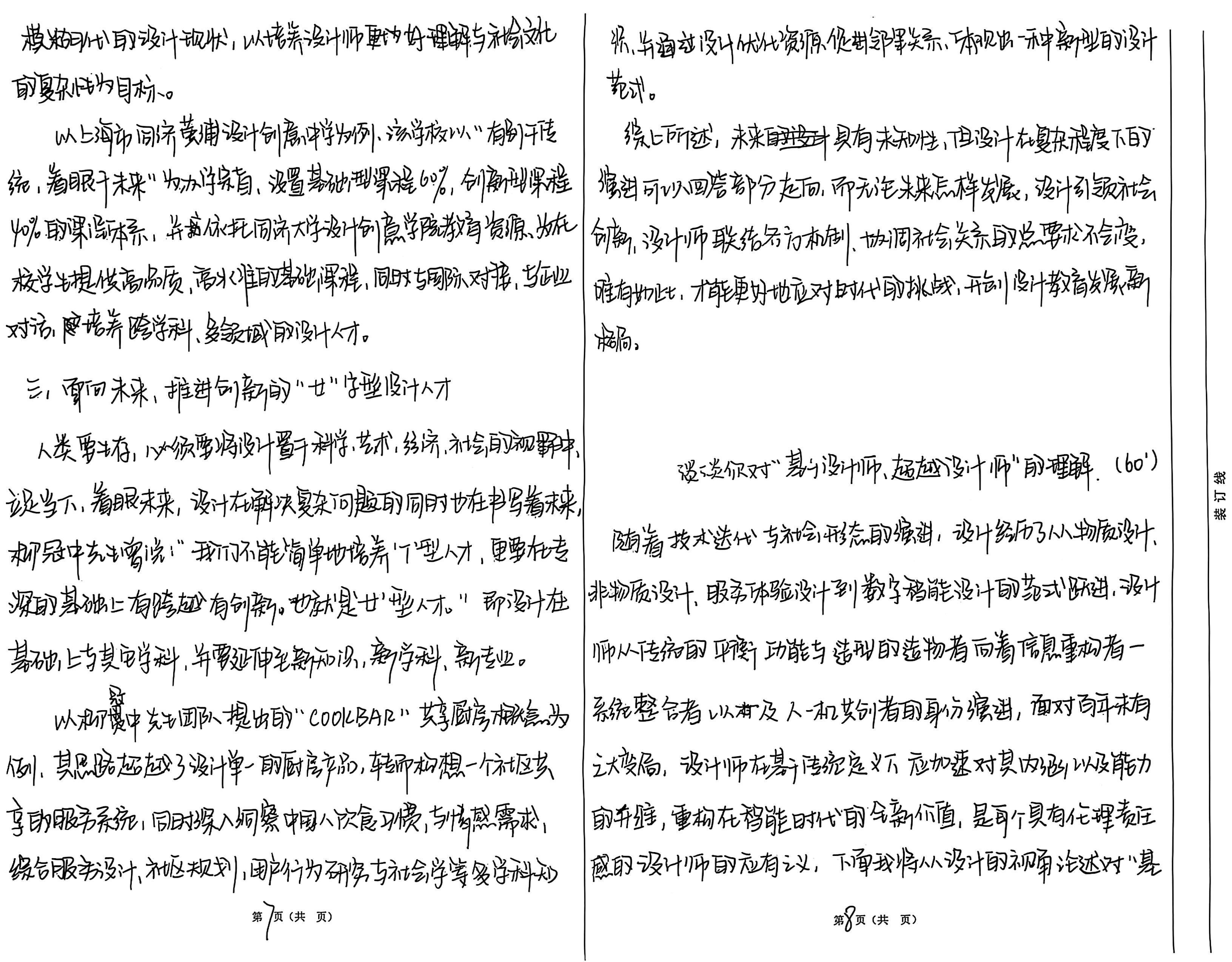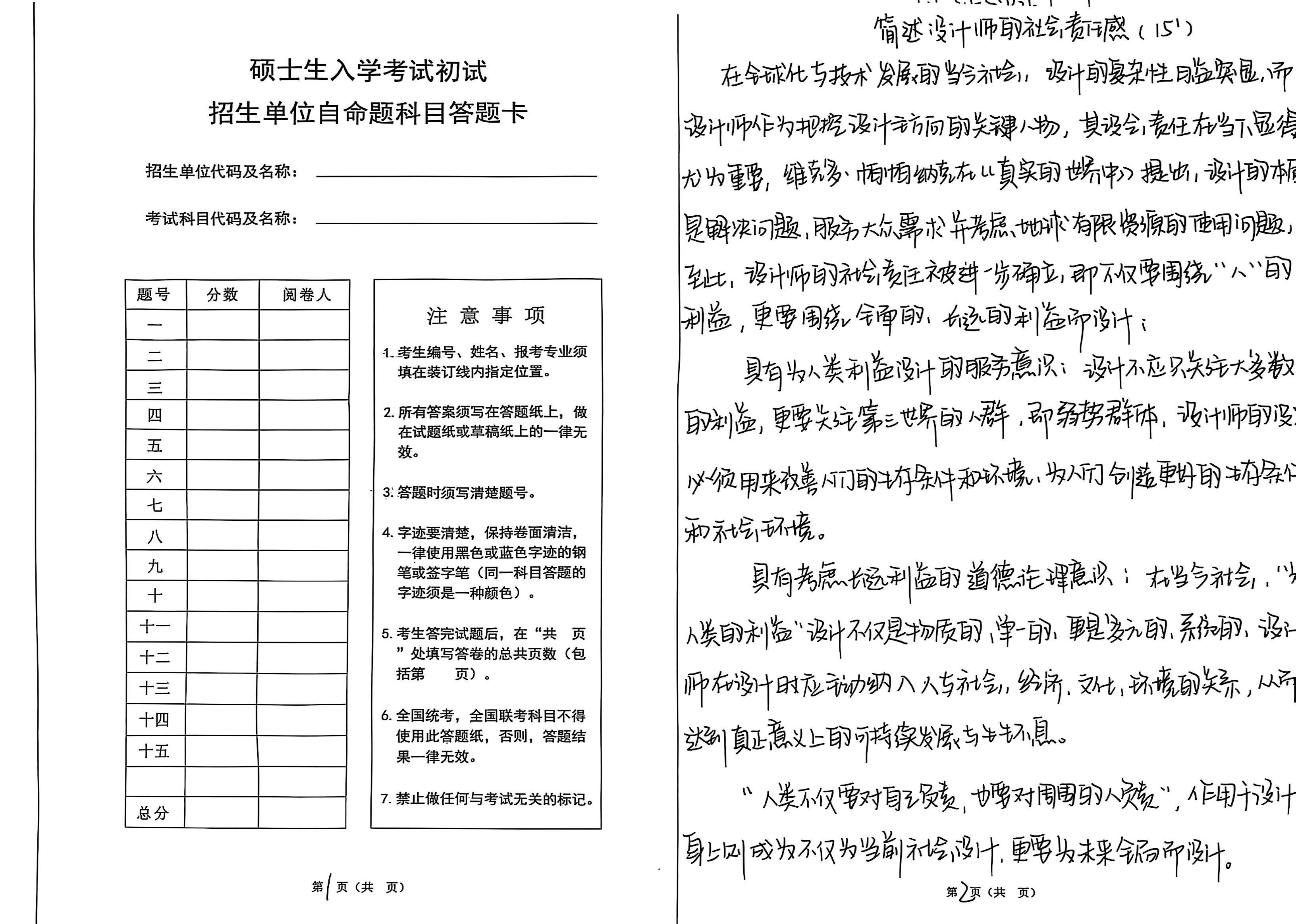简述设计师的社会责任感(151) 硕士生入学考试初试 在全球化与技术发展的当今社会,设计的复杂性日益突显,而 招生单位自命题科目答题卡 设计师作为把控设计主方向的关键人物,其设会,责任在当下显得 招生单位代码及名称: 尤为重要,维克多,帕帕纳克在《真实的世界中》提出,设计的本质 考试科目代码及名称: 是解决问题,服务大众需求并考虑地球有限资源的使用问题, 题号 分数 阅卷人 至此,设计师的社会责任被进一步确立,即不仅要围绕“人”的 注意事项 利益,更要围绕全面的,长远的利益而设计; 1.考生编号、姓名、报考专业须 填在装订线内指定位置. 三 具有为人类利益设计的服务意识:设计不应只关注大多数 四 2.所有答案须写在答题纸上,做 在试题纸或草稿纸上的一律无 五 的利益,更要关注第三世界的人群,即弱势群体,设计师的设 效。 六 3.答题时须写清楚题号。 必须用来改善人们的生存条件和环境,为人们创造更好的生存条件 七 八 4.字迹要清楚,保持卷面清洁, 和社会环境。 一律使用黑色或蓝色字迹的钢 九 笔或签字笔(同一科目答题的 十 字迹须是一种颜色)。 具有考虑长远利益的道德论理意识: 在当今社会, 十一 5.考生答完试题后,在“共 :页 十二 ”处填写答卷的总共页数(包 人类的利益”设计不仅是物质的,单一的,更是多元的,系统的,设计 括第 页)。 十三 师在设计时应主动纳入人与社会,经济、文化、环境的关系,从而 十四 6.全国统考,全国联考科目不得 使用此答题纸,否则,答题结 十五 果一律无效。 达到真正意义上的可持续发展与生生不息。 7.禁止做任何与考试无关的标记。 11 总分 人类不仅要对自己负责,也要对周围的人负责”,作用于设计 身上则成为不仅为当前社会设计,更要为未来全面而设计。 第页(共页) 第页(共页) 美国没有欧洲的复古束缚,反而需要“城市化 . 高密度”的 从社会文化语境的角度,淡谈对“-”型,“T”型人才模型的理 新需求,如芝加哥,纽约要建摩天大楼,既要有标志性,又要高效 解,并指出你认为未来设计师应具备怎样的能力结构? (30) 利用空间,同时为战后重建的便捷高效率,设计师门采用预制构件 在技术迅速变革与社会需求不断变换的强进下,“-”型,“T型” 模块化设计、网格系统,无衬线字体等、构建了一个极简,理性的生 人才模型分别回应了不同阶段对于设计师的专业要求,二者代表着 活系统。 不同层次的专业深度与广度,要求设计师具备跨学科的知识和技 三、设计的复杂性:当代社会复杂语境下的"Designs" 能,以适应不断变化的社会文化需求,即 当今社会,经济和技术背景正在发生存变,面对人们复杂性的 、“一”型人才模型:社会需求加深的回应, 生活需求以及人口老龄化、生态危机、资源分配不公等全球性 随着科学技术、文化交流的加速,人们对设计的需求从单 问题,设计不断演进,通过跨学科合作,协同设计等复科法 线的功能,造型,审美转向价值,更深层问题 重塑当今社会生活方式。 的解决,“-”型人才模型的提出强调设计在某一专业领域的深 以"人ICE"2035”未来生活街区设计为例,通过一种“自下而上的 度,以更高效地解决用户所面临的难题。 社会创新设计,对现有资源创造性重组,建构了一种多人群 以核心研发工程师、专业领域科学家为代表,擅长解决 共生的生活模式,在这里,老年人可以通过开放共享阳台”与年轻人 该领域内的复杂技术性难题,但同样、社会的深度与广度正在 对话,不仅是代际共融的一项创举,更是一次开创式的生活方式 拓展,单一的“一”型设计师在面临系统化挑战时会显得力不从心。 更新。 二、“个”型人才模型: :复杂性社会问题的回应。 综上所述,索特萨斯”设计是设计一种生活方式”这句话深刻 “T”型人才模型在“-”(某专业领域有深入知识)的基 揭示了设计的本质与目的,设计师应在历史的推动下更加主动地 础上,同时具备跨学科的广度,回应当代社会、复杂化、动态化、 关注人的需求与体验,以此,构建更加美好的生活愿景。 第页(共页) 第6倾(共页) 模糊代的设计现状,以培养设计师更好理解与社会文化 识,并通过设计优化资源,促进邻果关系,体现出一种新型的设计 的复杂性为目标。 范式。 以上海市同济黄埔设计创意中学为例,该学校以“有别干传 综上所述,未来具有未知性,但设计在复杂程度下的 统,看眼于未来”为办学宗旨,设置基础型课程60%,创新型课程 强进可以回答部分走向,而无论未来怎样发展,设计引领社会 10%的课呈体系,并依托同济大学设计创意学院教育资源,为在 创新,设计师联结各方机制, 协调社会关系的点要求不会变, 校学生提供高品质,高水准的基础课程,同时与国际对接,与企业 唯有如此,才能更好地应对时代的挑战,开创设计教育发展新 对话,培养跨学科,多领域的设计人才。 格局。 三、面向未来,推进创新的“廿”字型设计人才 人类要生存,必须要将设计置于科学、艺术、经济、社会的视罪野中、 谈谈你对“基于设计师、超越设计师”的理解。 (60') 立足当下,着眼未来,设计在解决复杂问题的同时也在书写着未来, 柳冠中先生曾说:“我们不能简单地培养个型人才,重要在专1 随着技术迭代与社会形态的强进,设计经历了人物质设计, 深的基础上有跨越有创新,也就是“廿型人才。”即设计在 非物质设计,服务体验设计到数字