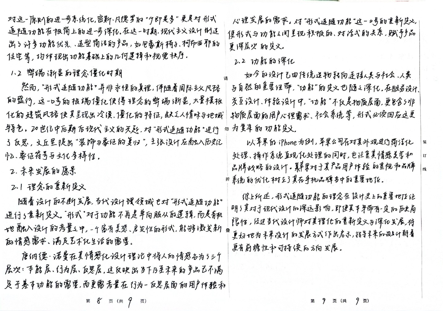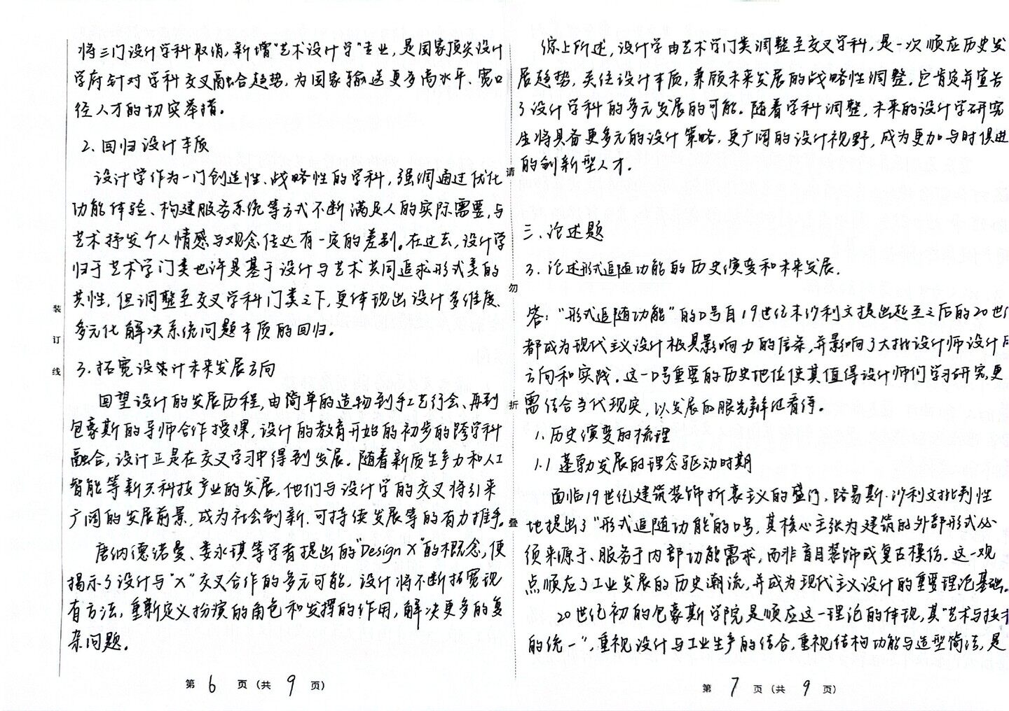 将三门设计学科取消,新增“艺术设计学”专业,是国家顶尖设计 综上所述,设计学由艺术学门类调整至交叉学科,是一次顺应历史发 学府针对学科交叉融合趋势,为国家输送更多高水平、宽口 展趋势,关注设计本质,兼顾未来发展的战略性调整。它肯定并宣告 径人才的切实举措。 了设计学科的多元发展的可能。随着学科调整,未来的设计学研究 2.回归设计本质 生将具备更多元的设计策略,更广阔的设计视野,成为更加与时俱进 设计学作为一门创造性,战略性的学科,强调通过优化请 的创新型人才. 功能体验、构建服务系统等方式不断满足人的实际需要,与 艺术抒发个人情感与观念传达有一定的差别。在过去,设计学 三.论述题 归于艺术学门类也许是基于设计与艺术共同追求形式美的 3.论述形式追随功能的历史演变和未来发展, 勿 装 共性,但调整至交叉学科门类之下,更体现出设计多维度, 答:“形式追随功能”的口号自19世纪末沙利文提出起至之后的20世纪 订 多元化解决系统问题本质的回归。 都成为现代主义设计极具影响力的信条,并影响了大批设计师设计后 线 3。拓宽设计未来发展方向 方向和实践。这一口号重要的历史地位使其值得设计师们学习研究,更 回望设计的发展历程,由简单的造物到手工艺行会、再到 折 需结合当代现实,以发展的眼光辩证看待。 包豪斯的导师合作授课,设计的教育开始的初步的跨学科 1、历史演变的梳理 融合,设计正是在交叉学习中得到发展。随着新质生产力和人工 1.1蓬勃发展的理念驱动时期 智能等新兴科技产业的发展,他们与设计学的交叉将引来 面临19世纪建筑装饰折衷主义的盛行,路易斯.沙利文批判性 广阔的发展前景,成为社会创新,可持续发展等的有力推手。 地提出了“形式追随功能”的口号,其核心主张为建筑的外部形式必 唐纳德诺曼、娄永琪等学者提出的“DesignX”的概念,便 须来源于、服务于内部功能需求,而非盲目装饰或复古模仿。这一观 揭示了设计与“×”交叉合作的多元可能,设计将不断拓宽现 点顺应了工业发展的历史潮流,并成为现代主义设计的重要理论基础。 有方法,重新定义扮演的角色和发挥的作用,解决更多的复 20世纪初的包豪斯学院是顺应这一理论的体现,其“艺术与技术 杂问题。 的统一”,重视设计与工业生产的结合,重视结构功能与造型简洁,是 第 6 页(共 9 页) 第 7 页(共 页)