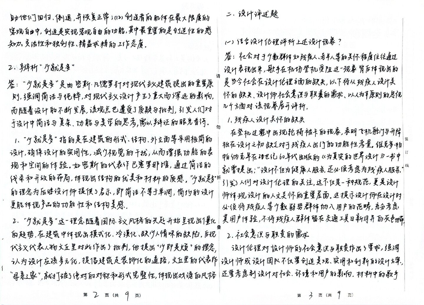 助他们回归,倒退,并恢复正常;(12)创造者的肌体在最大限度的 二.设计评述题 客观自由中,创造是实现客观自由的功能,其中最重要的是创造性的感 知力,灵活性和独创性、精益求精的工作态度。 (一)结合设计伦理评析上述设计现象? 答:社会对于少数群体如残疾人、老年人等的关怀程度往往通过 2、辨析“少就是多” 设计表现出来,歌手在机场登机受阻这一现象背后体现出的 请 答: “少就是多”是由密斯.凡德罗针对现代主义建筑提出的重要原 是当今社会在设计伦理方面的缺失,以下将从残疾人设计关 则,强调简洁与纯粹,对现代主义设计产生了重大而深远的影响, 怀的缺失,设计师社会意识与职责的需求,以人为本原则的忽视 而随着设计的不断发展,该观点也遭受了质疑与批判,引发人们对 几个方面对该现象展开评析. 于设计中简洁与复杂、功能与美学的思考,需以辩证的眼光看待。 1、残疾人设计关怀的缺失 勿 在登机过程中出现轮椅被卡的现象,表明飞机舱门与升降 1. “少就是多”指的是在建筑的形式、结构、外立面等采用极简的 装 板在设计之初缺乏对于残疾人出行的功能性考量。维克多帕 设计,确保设计的实用性,减少视觉的干扰,从而增强功能的表 帕纳克早在20世纪60年代出版的《为真实的世界设计》一书中 订 现和空间的体验。如密斯的代表作巴塞罗那馆,通过简洁的 就曾提出:“设计不但为健康人服务,还必须考虑为残疾人服务。” 线 戈条和开放的布局,体现出结构的优美和材料的质感。“少就是多 折 引发了人们对设计伦理的关注,这不仅是一种规范,更是设计 的理念为后继设计师提供了启示,即简洁不等于单调,简约的设计 师体现设计的人文关怀的重要层面。这提示设计师在设计时 更能体现产品的功能性和结构美感。 必须将残疾人等少数弱势群体纳入用户的范畴,充分考虑 2. 1 少就是多”这一理念随着国际主义风格的兴起开始呈现出僵化 其用户体验,不将残疾人群体留在交通工具日新月异的灰色地带。 叠 的趋势,在建筑中体现出模式化,冷漠化、缺少人情味的缺陷。后现 2.社会意识与职责的需求 代主义代表人物文丘里对此作出了批判,他提出“少即是烦”的理念, 设计伦理对设计师的社会意识与职责作出了要求,强调 认为设计应该多元化,提倡建筑走装饰化的道路,文丘里的代表作设计师或设计团队不仅要创造美观,实用和创新的设计方案, 1 母亲之家”,就打破了绝对的对称和形式完整性,体现出戏谑的风格 还要考虑到设计对社会、环境和用户的影响。材料中的歌手 第 2 页(共 9 页) 第 3 页 (共 页)