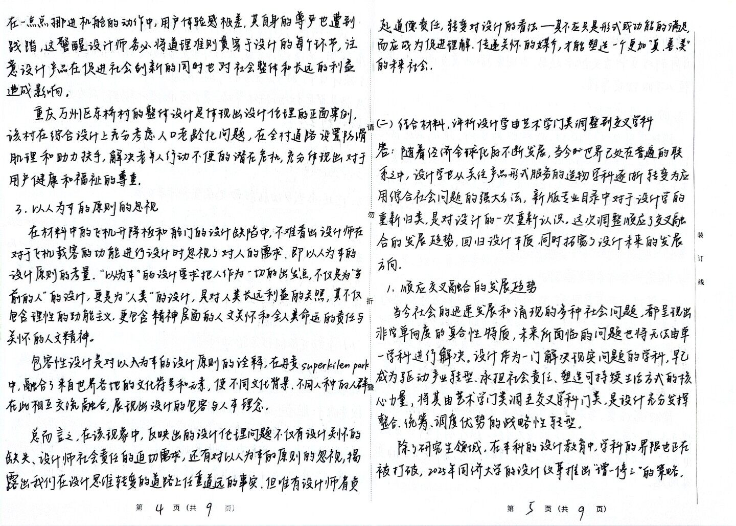 在一点点挪进机舱的动作中,用户体验感极差,其自身的尊严也遭到 起道德责任,转变对设计的看法--其不应只是形式或功能的满足, 践踏,这警醒设计师务必将道理准则贯穿于设计的每个环节,注 而应成为促进理解,传递关怀的媒介,才能塑造一个更加“真、善、美” 意设计产品在促进社会创新的同时也对社会整体和长远的利益 的未来社会. 造成影响。 重庆万州区东桥村的整体设计是体现出设计伦理的正面案例, (二)结合材料,评析设计学由艺术学门类调整到交叉学科 该村在综合设计上充分考虑人口老龄化问题,在全村道路设置防滑 肌理和助力扶手,解决老年人行动不便的潜在危机,充分体现出对于 答:随着经济全球化的不断发展,当今世界已处在普遍的联 用户健康和福祉的尊重。 系之中,设计学也从关注产品形式服务的造物学科逐渐转变为应 3,以人为本的原则的忽视 用综合社会问题的强大方法,新版专业目录中对于设计学的 勿 重新归类,是对设计的一次重新认识。这次调整顺应了交叉融 在材料中的飞机升降板和舱门的设计缺陷中,不难看出设计师在 合的发展趋势,回归设计本质,同时拓宽了设计未来的发展 装 对于飞机载客的功能进行设计时忽视了对人的需求,即以人为本的 方向。 订 设计原则的考量。“以人为本”的设计要求把人作为一切的出发点,不仅是为“当 1.顺应交叉融合的发展趋势 线 前的人”的设计,更是为“人类”的设计,是对人类长远利益的关照,其不仅 折 包含理性的功能主义,更包含精神层面的人文关怀和全人类命运的责任与 当今社会的迅速发展和涌现的多种社会问题,都呈现出 关怀的人文精神。 非单向度的复合性特质,未来所面临的问题也将无法由单 包容性设计是对以人为本的设计原则的诠释,在丹麦superkilenpark 一学科进行解决。设计作为一门解决现实问题的学科,早已 中,融合了来自世界各地的文化符号和元素,使不同文化背景.不同人种的人群 成为驱动产业转型、承担社会责任,塑造可持续生活方式的核 在此相互交流融合,展现出设计的包容与人本理念。 心力量,将其由艺术学门类调至交叉学科门类,是设计充分发挥 总而言之,在该现象中,反映出的设计伦理问题不仅有设计关怀的 整合、统筹、调度优势的战略性转型。 缺失,设计师社会责任的迫切需求,还有对以人为本的原则的忽视,揭 余了研究生领域,在本科的设计教育中,学科的界限也正在 露出我们在设计思维转变的道路上任重道远的事实,但唯有设计师肩负 被打破,2025年同济大学的设计改革推出“增一停三”的策略, 第 4 1 页(共 页) 第 5 页(共 9 页)