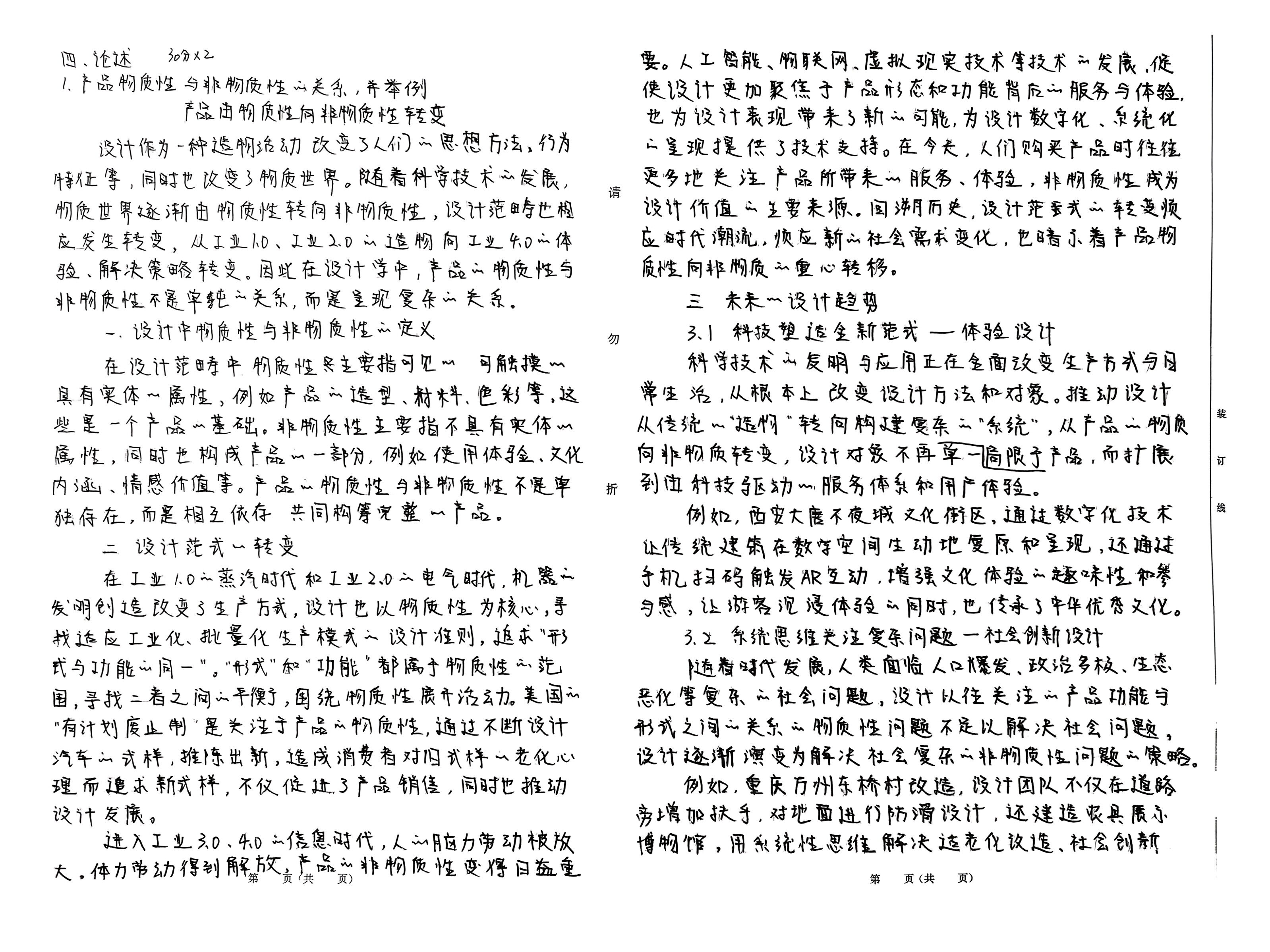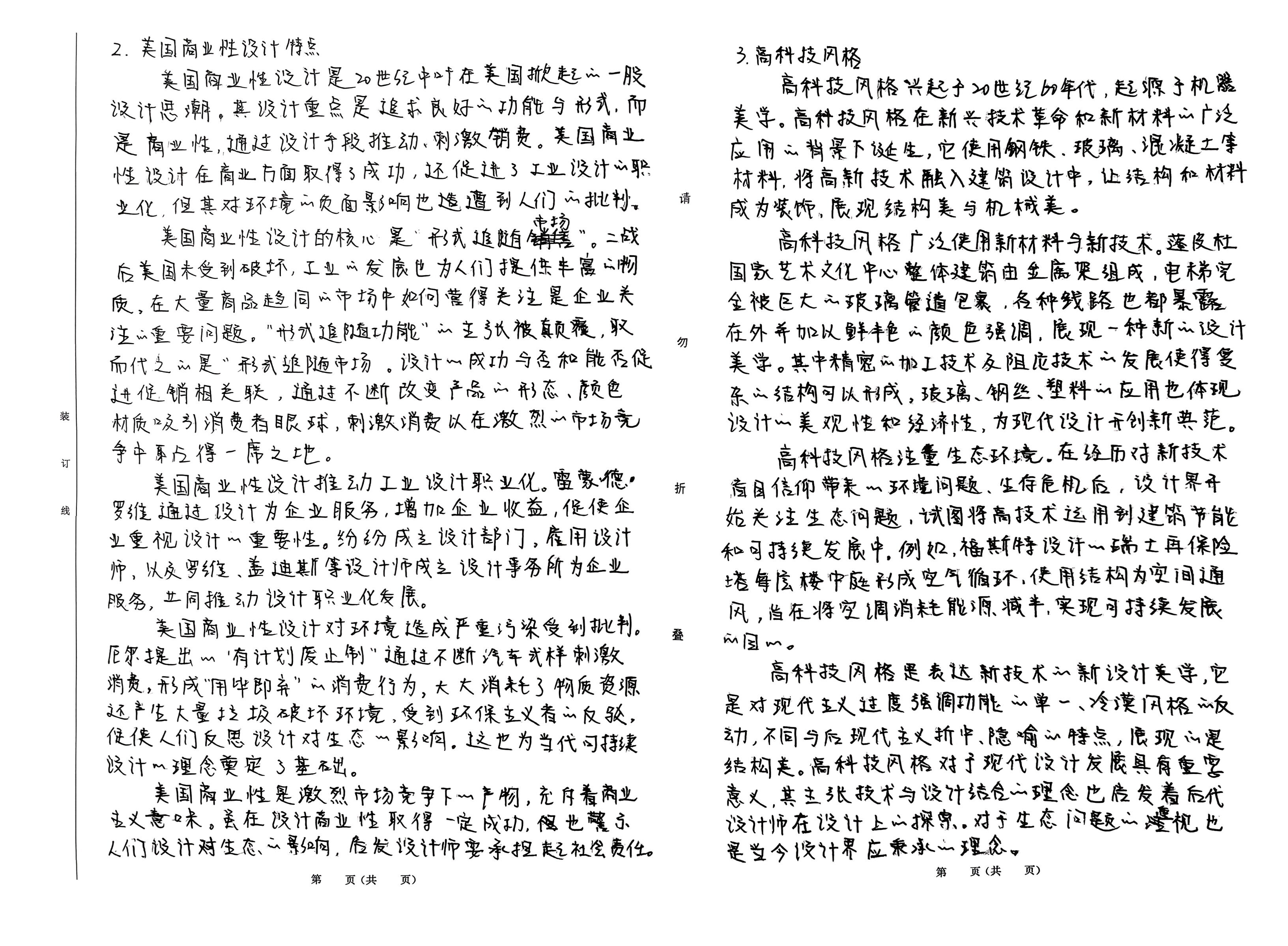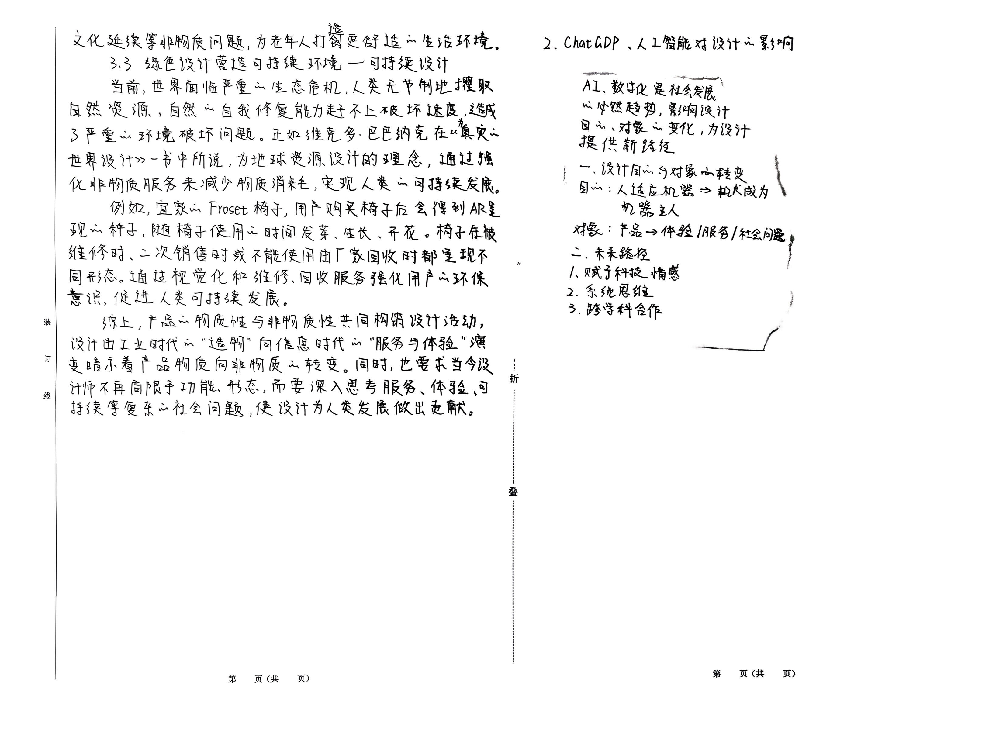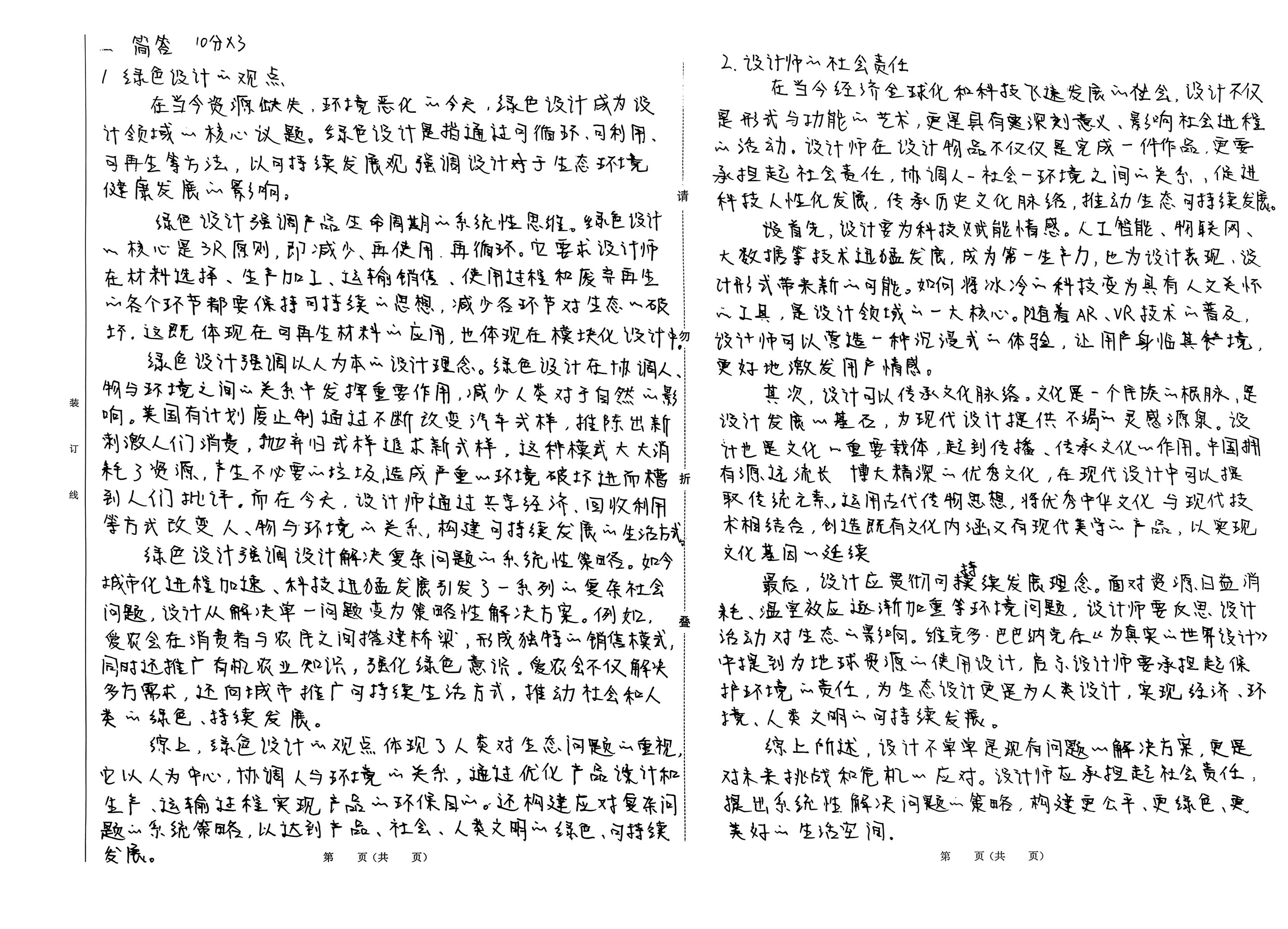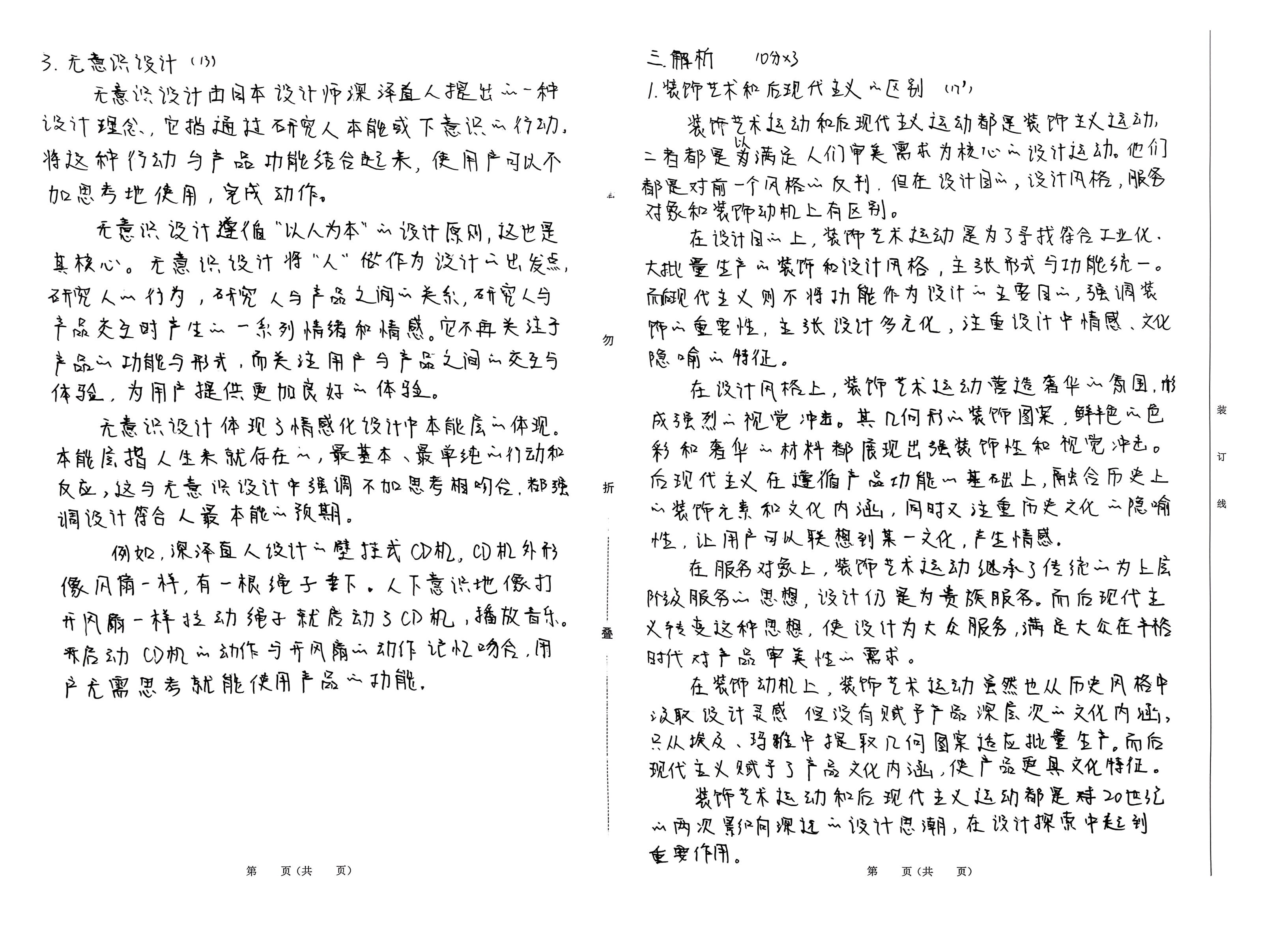 一 简答 10分×3 3 绿色设计的观点 2.设计师的社会责任 在当今资源缺失,环境恶化的今天,绿色设计成为设 在当今经济全球化和科技飞速发展的社会,设计不仅 计领域的核心议题。绿色设计是指通过可循环,可利用, 是形式与功能的艺术,更是具有深刻意义,影响社会进程 心活动。设计师在设计物品不仅仅是完成一件作品,更要 可再生等方法,以可持续发展观强调设计对于生态环境 健康发展的影响。 承担起社会责任,协调人一社会一环境之间的关系,促进 请 科技人性化发展,传承历史文化脉络,推动生态可持续发展。 绿色设计强调产品生命周期的系统性思维。绿色设计 首先,设计要为科技赋能情感。人工智能、物联网、 ~核心是3R原则,即减少、再使用,再循环。它要求设计师 大数据等技术迅猛发展,成为第一生产力,也为设计表现,设 在材料选择、生产加工、运输销售、使用过程和废弃再生 计形式带来新的可能。如何将冰冷的科技变为具有人文关怀 的各个环节都要保持可持续的思想,减少谷环节对生态的破 的工具,是设计领域的一大核心。随着AR、VR技术的普及, 坏。这既体现在可再生材料的应用,也体现在模块化设计中物 设计师可以营造一种沉浸式的体验,让用户身临其境, 绿色设计强调以人为本的设计理念。绿色设计在协调人、 更好地激发用户情感。 装 物与环境之间的关系中发挥重要作用,减少人类对于自然的影 其次,设计可以传承文化脉络。文化是一个民族的根脉,是 响。美国有计划废止制通过不断改变汽车式样,推陈出新 设计发展心基石,为现代设计提供不竭的灵感源泉。设 订 刺激人们消费,抛弃旧式样追求新式样,这种模式大大消 计也是文化的重要载体,起到传播、传承文化的作用。中国拥 耗了资源,产生不必要的垃圾,造成严重心环境破坏进而槽 有源远流长博大精深的优秀文化,在现代设计中可以提 线 到人们批评。而在今天,设计师通过共享经济,回收利用 取传统元素,运用古代传物思想,将优秀中华文化与现代技 等方式改变人、物与环境的关系,构建可持续发展的生活方式 术相结合,创造既有文化内涵又有现代美学的产品,以实现 绿色设计强调设计解决复杂问题的系统性策略。如今 文化基因一延续 城市化进程加速、科技迅猛发展引发了一系列的复杂社会 最后,设计应贯彻可持续发展理念。面对资源日益消 问题,设计从解决单一问题变为策略性解决方案。例如, 耗、温室效应逐渐加重等环境问题,设计师要反思设计 爱农会在消费者与农民之间管建桥梁,形成独特的销售模式, 活动对生态心影响。维克多,巴巴纳克在《为真实的世界设计》 同时还推广有机农业知识,强化绿色意识。爱农会不仅解决 中提到为地球资源的使用设计,启示设计师要承担起保 多方需求,还向城市推广可持续生活方式,推动社会和人 护环境的责任,为生态设计更是为人类设计,实现经济、环 类的绿色,持续发展。 境、人类文明的可持续发展。 综上,绿色设计的观点体现了人类对生态问题的重视, 综上所述,设计不单单是现有问题的解决方案,更是 它以人为中心,协调人与环境的关系,通过优化产品设计和 对未来挑战和危机心应对。设计师应承担起社会责任, 生产、运输过程实现产品的环保目的。还构建应对复杂问 提出系统性,解决问题的策略,构建更公平、更绿色、更 题的系统策略,以达到产品、社会、人类文明的绿色,可持续 美好的生活空间。 发展。 第 页(共 页) 第 页(共 页) 3.无意识设计(13) 三.解析 10分×3 无意识设计由国本设计师深泽直人提出的一种 1.装饰艺术和后现代主义的区别 (17, 设计理念,它指通过研究人本能或下意识的行动, 装饰艺术运动和后现代主义运动都是装饰主义运动, 将这种行动与产品功能结合起来,使用户可以不 二者都是为满足人们审美需求为核心的设计运动。他们 加思考地使用,完成动作。 都是对前一个风格的反判,但在设计目的,设计风格,服务 无意识设计遵循 自“以人为本”的设计原则,这也是 对象和装饰动机上有区别。 在设计国的上,装饰艺术运动是为了寻找符合工业化。 其核心。无意识设计将“人”作为设计的出发点, 大批量生产的装饰和设计风格,主张形式与功能统一。 研究人心行为,研究人与产品之间的关系,研究人与 而后现代主义则不将功能作为设计的主要目的,强调装 产品交互时产生的一系列情绪和情感。它不再关注于 勿 饰的重要性,主张设计多元化,注重设计中情感、文化 产品的功能与形式,而关注用户与产品之间的交互与 隐喻的特征. 体验,为用户提供更加良好的体验。 在设计风格上,装饰艺术运动营造奢华的氛围,形 无意识设计体现了情感化设计中本能层的体现。 成强烈的视觉冲击。其几何形的装饰图案,鲜艳的色 装 本能层指人生来就存在~,最基本、最单纯的行动和 彩和奢华的材料都展现出强装饰性和视觉冲击。 订 反应,这与无意识设计中强调不加思考相吻合,都强 折 后现代主义在遵循产品功能的基础上,融合历史上 调设计符合人最本能的预期. 心装饰元素和文化内涵,同时又注重历史文化的隐喻 线 例如,深泽直人设计的壁技式CD机,CD机外形 性,让用户可以联想到某一文化,产生情感。 像风扇一样,有一根绳子垂下。人下意识地像打 在服务对象上,装饰艺术运动继承了传统的为上层 开风扇一样拉动