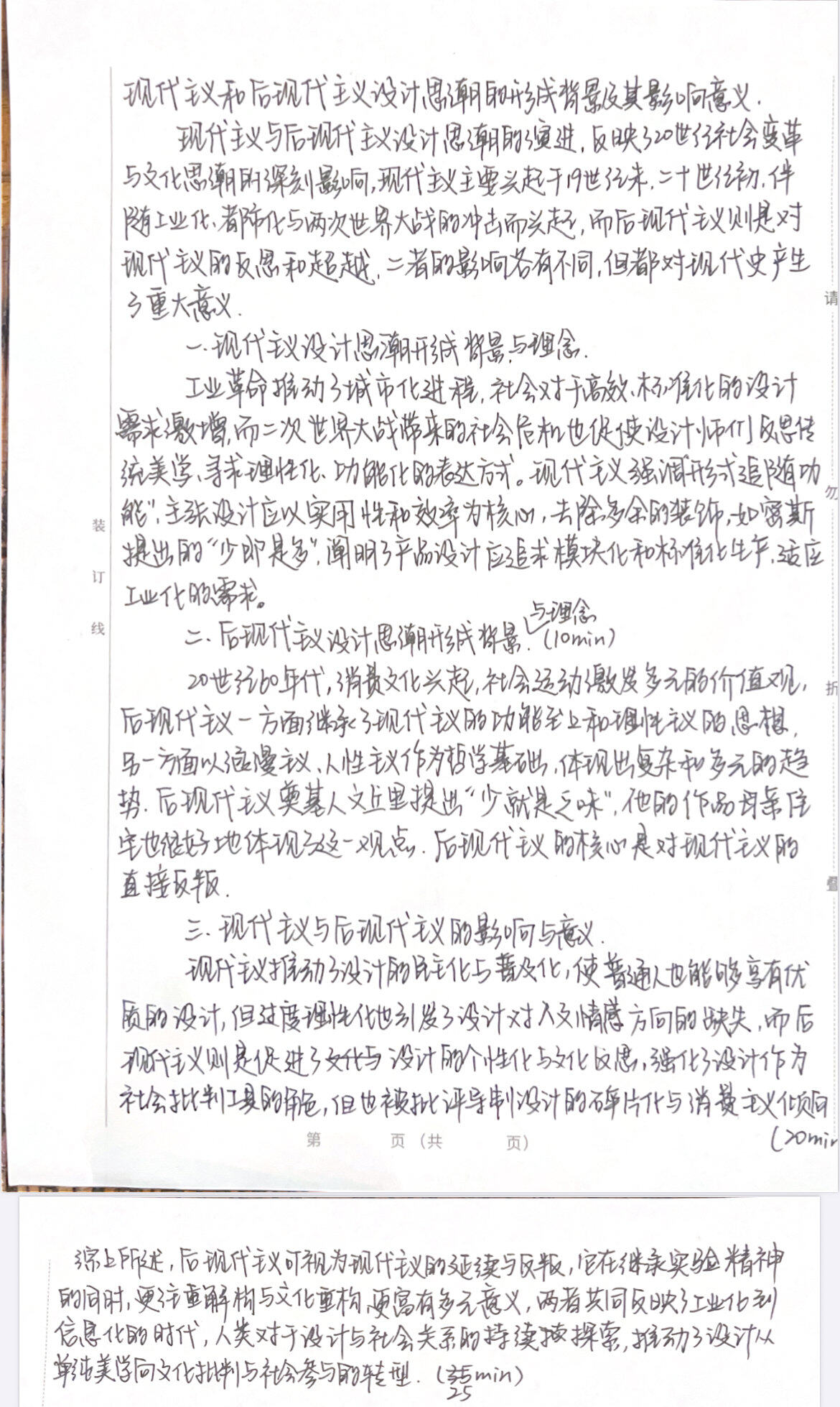 现代主义和后现代主义设计思潮的形成背景及其影响意义, 现代主义与后现代主义设计思潮的演进,反映了20世纪社会变革 与文化思潮的深刻影响,现代主义主要兴起于19世纪末,二十世纪初,伴 随工业化,都市化与两次世界大战的冲击而兴起,而后现代主义则是对 现代主义的反思和超越,二者的影响各有不同,但都对现代史产生 了重大意义. 请 一.现代主义设计思潮形成背景,与理念. 工业革命推动了城市化进程,社会对于高效、标准化的设计 需求激增,而二次世界大战带来的社会危机也促使设计师们反思传 统美学,寻求理性化、功能化的表达方式。现代主义强调形式追随力 装 能”,主张设计应以实用性和效率为核心,去除多余的装饰,如密斯 勿 订 提出的“少即是多”,阐明了产品设计应追求模块化和标准化生产,适应 工业化的需求。 线 二.后现代主义设计思潮形成背景,(omin) 与理念 20世纪60年代,消费文化兴起,社会运动激发多元的价值观, 折 后现代主义一方面继承了现代主义的功能至上和理性主义的思想, 另一方面以浪漫主义、人性主义作为哲学基础,体现出复杂和多元的趋 势.后现代主义奠基人文丘里提出“少就是乏味”,他的作品母亲住 宅也很好地体现了这一观点.后现代主义的核心是对现代主义的 直接反半叛. 三、现代主义与后现代主义的影响与意义. 现代主义推动了设计的民主化与普及化,使普通人也能够享有优 质的设计,但过度理性化也引发了设计对人文情感方向的缺失,而后 现代主义则是促进了与设计的个性化与文化反思,强化了设计作为 社会批判工具的角色,但也被批评导制设计的碎片化与消费主义倾向 第 页(共 页) 120mir 综上所述,后现代主义可视为现代主义的延续与反叛,它在继承实验精神 的同时,更注重解构与文化重构,更富有多元意义,两者共同反映了工业化到 信息化的时代,人类对于设计与社会关系的持续探索,推动了设计从 单纯美学向文化批判与社会参与的转型.(min) 25