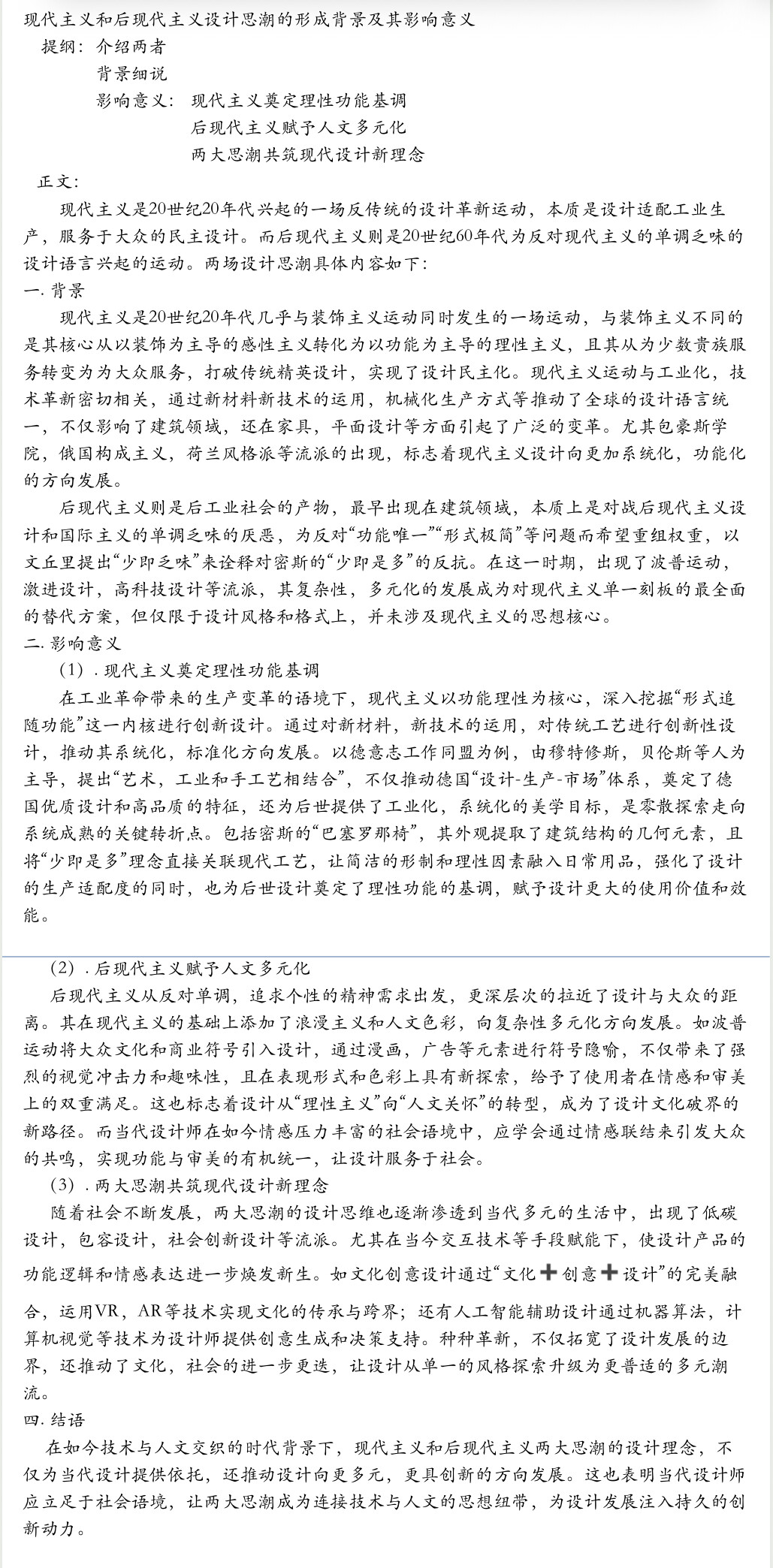现代主义和后现代主义设计思潮的形成背景及其影响意义 提纲:介绍两者 背景细说 影响意义: 现代主义奠定理性功能基调 后现代主义赋予人文多元化 两大思潮共筑现代设计新理念 正文: 现代主义是20世纪20年代兴起的一场反传统的设计革新运动,本质是设计适配工业生 产,服务于大众的民主设计。而后现代主义则是20世纪60年代为反对现代主义的单调乏味的 设计语言兴起的运动。两场设计思潮具体内容如下: 一.背景 现代主义是20世纪20年代几乎与装饰主义运动同时发生的一场运动,与装饰主义不同的 是其核心从以装饰为主导的感性主义转化为以功能为主导的理性主义,且其从为少数贵族服 务转变为为大众服务,打破传统精英设计,实现了设计民主化。现代主义运动与工业化,技 术革新密切相关,通过新材料新技术的运用,机械化生产方式等推动了全球的设计语言统 一,不仅影响了建筑领域,还在家具,平面设计等方面引起了广泛的变革。尤其包豪斯学 院,俄国构成主义,荷兰风格派等流派的出现,标志着现代主义设计向更加系统化,功能化 的方向发展。 后现代主义则是后工业社会的产物,最早出现在建筑领域,本质上是对战后现代主义设 计和国际主义的单调乏味的厌恶,为反对“功能唯一”“形式极简”等问题而希望重组权重,以 文丘里提出“少即乏味”来诠释对密斯的“少即是多”的反抗。在这一时期,出现了波普运动, 激进设计,高科技设计等流派,其复杂性,多元化的发展成为对现代主义单一刻板的最全面 的替代方案,但仅限于设计风格和格式上,并未涉及现代主义的思想核心。 二.影响意义 (1).现代主义奠定理性功能基调 在工业革命带来的生产变革的语境下,现代主义以功能理性为核心,深入挖掘“形式追 随功能”这一内核进行创新设计。通过对新材料,新技术的运用,对传统工艺进行创新性设 计,推动其系统化,标准化方向发展。以德意志工作同盟为例,由穆特修斯,贝伦斯等人为 主导,提出“艺术,工业和手工艺相结合”,不仅推动德国“设计-生产-市场”体系,奠定了德 国优质设计和高品质的特征,还为后世提供了工业化,系统化的美学目标,是零散探索走向 系统成熟的关键转折点。包括密斯的“巴塞罗那椅”,其外观提取了建筑结构的几何元素,且 将“少即是多”理念直接关联现代工艺,让简洁的形制和理性因素融入日常用品,强化了设计 的生产适配度的同时,也为后世设计奠定了理性功能的基调,赋予设计更大的使用价值和效 能。 (2).后现代主义赋予人文多元化 后现代主义从反对单调,追求个性的精神需求出发,更深层次的拉近了设计与大众的距 离。其在现代主义的基础上添加了浪漫主义和人文色彩,向复杂性多元化方向发展。如波普 运动将大众文化和商业符号引入设计,通过漫画,广告等元素进行符号隐喻,不仅带来了强 烈的视觉冲击力和趣味性,且在表现形式和色彩上具有新探索,给予了使用者在情感和审美 上的双重满足。这也标志着设计从“理性主义”向“人文关怀”的转型,成为了设计文化破界的 新路径。而当代设计师在如今情感压力丰富的社会语境中,应学会通过情感联结来引发大众 的共鸣,实现功能与审美的有机统一,让设计服务于社会。 (3).两大思潮共筑现代设计新理念 随着社会不断发展,两大思潮的设计思维也逐渐渗透到当代多元的生活中,出现了低碳 设计,包容设计,社会创新设计等流派。尤其在当今交互技术等手段赋能下,使设计产品的 功能逻辑和情感表达进一步焕发新生。如文化创意设计通过“文化+创意+设计”的完美融 合,运用VR,AR等技术实现文化的传承与跨界;还有人工智能辅助设计通过机器算法,计 算机视觉等技术为设计师提供创意生成和决策支持。种种革新,不仅拓宽了设计发展的边 界,还推动了文化,社会的进一步更迭,让设计从单一的风格探索升级为更普适的多元潮 流。 四.结语 在如今技术与人文交织的时代背景下,现代主义和后现代主义两大思潮的设计理念,不 仅为当代设计提供依托,还推动设计向更多元,更具创新的方向发展。这也表明当代设计师 应立足于社会语境,让两大思潮成为连接技术与人文的思想纽带,为设计发展注入持久的创 新动力。