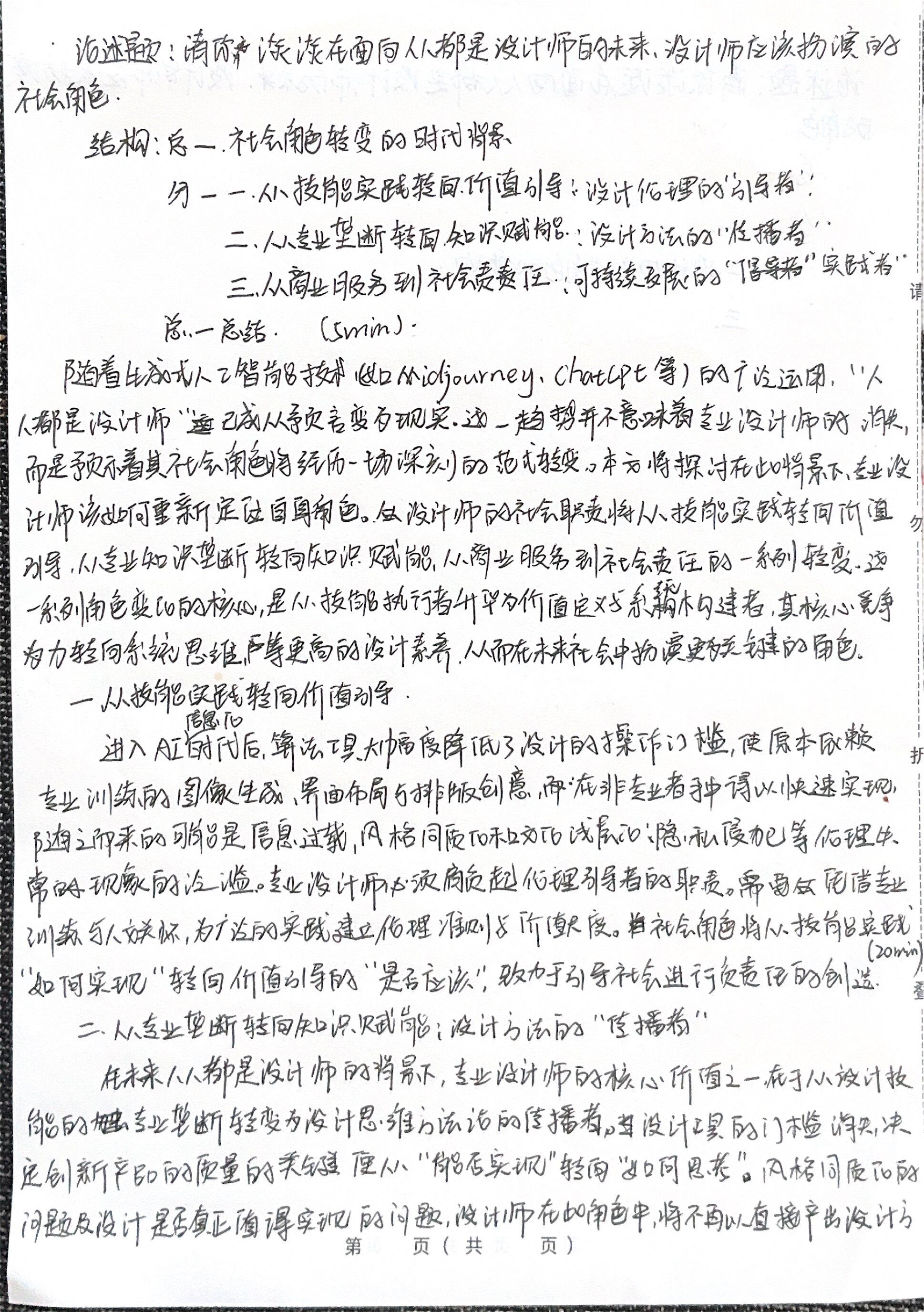 论述题:请你谈谈在面向从都是设计师的未来,设计师应该扮演的 社会角色. 结构:总一.社会角色转变的时代背景 分一一.从技能实践转向.价值引导:设计伦理的“引导者”: 二、人人专业垄断转向知识赋能:设计方法的传播者 三.从商业服务到社会责责任:可持续发展的“导”实践者” 请 总.-总结. 5mimJ. 随着生成式人工智能技术,(如Midjourney,chatcpt等)的广泛运用,“人 人都是设计师“已成从预言变为现实。这一趋势并不意味着专业设计师的消失, 而是预示着其社会角色将经历一场深刻的范式转变。。本方将探讨在此背景下、专业设 计师该如何重新定自身角色。设计师的社会职责将从技能实践转向价值 引导,从专业知识垄断转向知识赋能,从商业服务到社会责任的一系列转变。这 一系列角色变化的核心,是从技能执行者升华为价值定义与系箱构建者,其核心竞争 为力转向系统思维,等更高的设计素养.从而在未来社会中扮演更为关键的角色。 一.从技能实践转向价值引导 、信息化 进入AI时代后,算法工具大幅度降低了设计的操作门槛,使原本辰赖 专业训练的图像生成、界面布局与排版创意,而在非专业者手中得以快速实现, 随之而来的可能是信息过载,风格同质T化和文化浅层化:隐私侵犯等伦理失 常现象的泛滥。专业设计师必须肩负起伦理引导者的职责。需要凭借专业 训练与人文关怀,为广泛的实践建立伦理准则与价值大度。将社会角色将从技能实践 ’如何实现“转向价值引导的“是否应该”,致力于引导社会进行负责任的创造 (20min) 叠 二.从专业垄断转向知识赋能;设计方法的“传播者” 在未来人人都是设计师的背景下,专业设计师的核心价值之一,在于从设计技 能的专业垄断转变为设计思维方法论的传播者。设计具的门槛消失,决 定创新产品的质量的关键便从“能否实现“转向“如何思考”。风格同质化的 问题及设计是否真正值得实现的问题,设计师在此角色中,将不再以直接产出设计方 第 页(共 页)