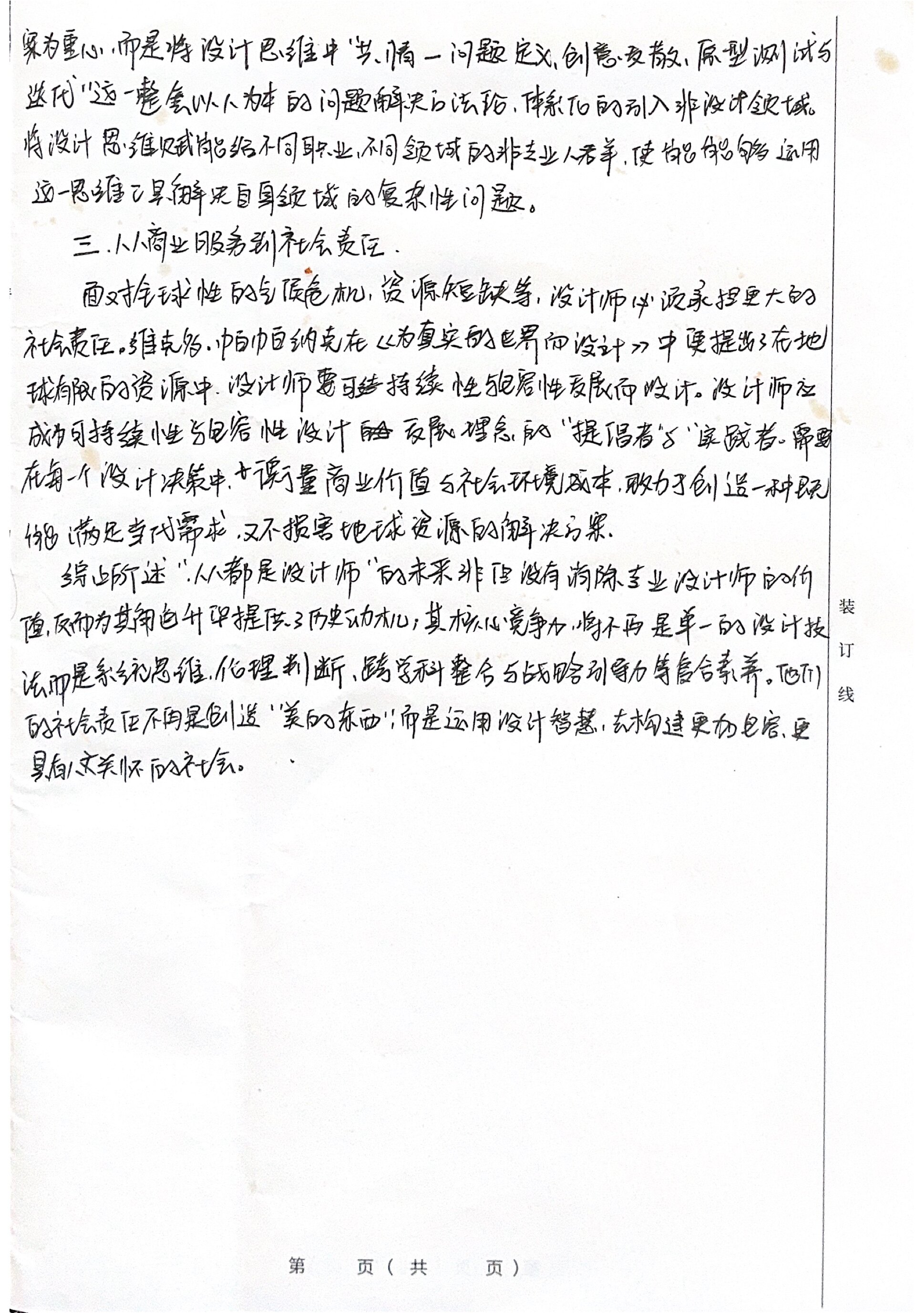 案为重心,而是将设计思维中“共情一问题定义、创意反散、原型测试与 迭代“这一整套以人为本的问题解决的法论.体系化的引入非设计领域。 将设计思维赋能给不同职业,不同领域的非专业人群,使能能够运用 这一思维工具解决自身领域的复杂性问题。 三.从商业服务到社会责任. 面对全球性的气候危机,资源短缺等,设计师必须承担更大的 社会责任。维克多。帕帕纳克在《为真实的世界而设计》中便提出了在地 球有限的资源中.设计师要可结持续性与包容性发展而设计。设计师应 成为可持续性与包容性设计发展理念的“提倡者”与”实践者。需要 在每一个设计决策中、衡量商业价值与社会环境成本,致力于创造一种既 能满足当代需求,又不损害地球资源的解决方案。 综上所述“从都是设计师”的未来非但没有消除专业设计师的价 值,反而为其角色升华提供了历史动机;其核心竞争力,将不再是单一的设计技 装 法而是系统思维,伦理判断、跨学科整合与战略引导力等复合素养。他们) 订 线 的社会责任不再是创造“美的东西”;而是运用设计智慧,去构建更加包容,更 具有人关怀的社会。 第 页(共 页)