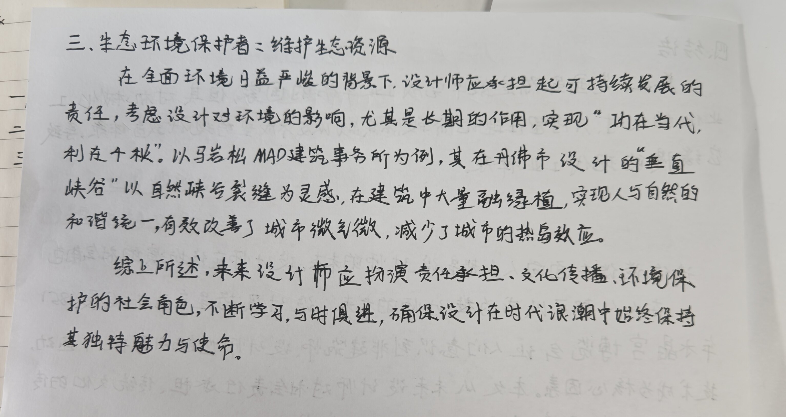 三、生态环境保护者二维护生态资源 在全面环境日益严峻的背景下,设计师应承担起可持续发展的 责任,考虑设计对环境的影响,尤其是长期的作用,实现“功在当代. 利在千秋”。以马岩松MAD建筑事务所为例,其在丹佛市设计的“垂直 峡谷”以自然峡谷裂缝为灵感,在建筑中大量融绿植,实现人与自然的 和谐统一,有效改善了城市微气微,减少了城市的热岛效应。 综上所述,未来设计师应扮演责任承担、文化传播、环境保 护的社会角色,不断学习,与时俱进,确保设计在时代浪潮中始终保持 其独特魅力与使命。