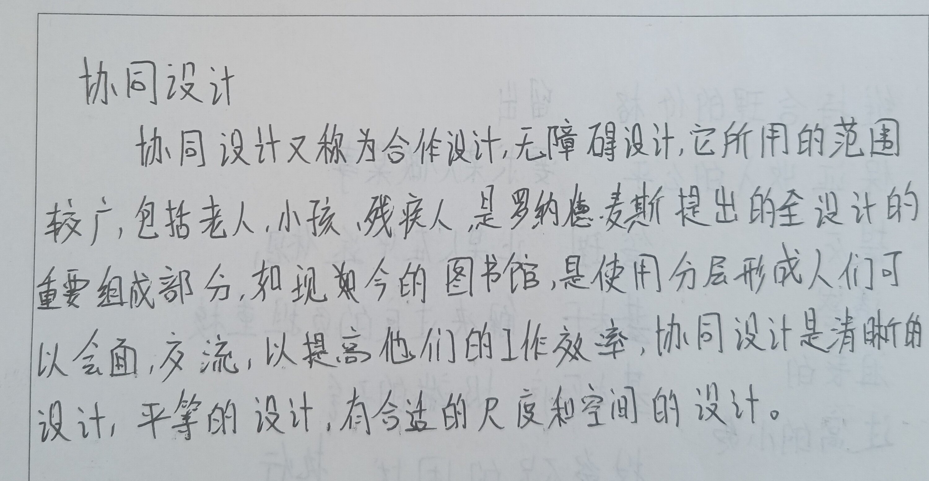 协同设计 协同设计又称为合作设计,无障碍设计,它所用的范围 较广,包括老人、小孩、残疾人,是罗纳德麦斯提出的全设计的 重要组成部分,如现今的图书馆,是使用分层形成人们可 以会面,交流,以提高他们的工作效率,协同设计是清晰的 设计,平等的 )设计,有合适的尺度和空间的设计。