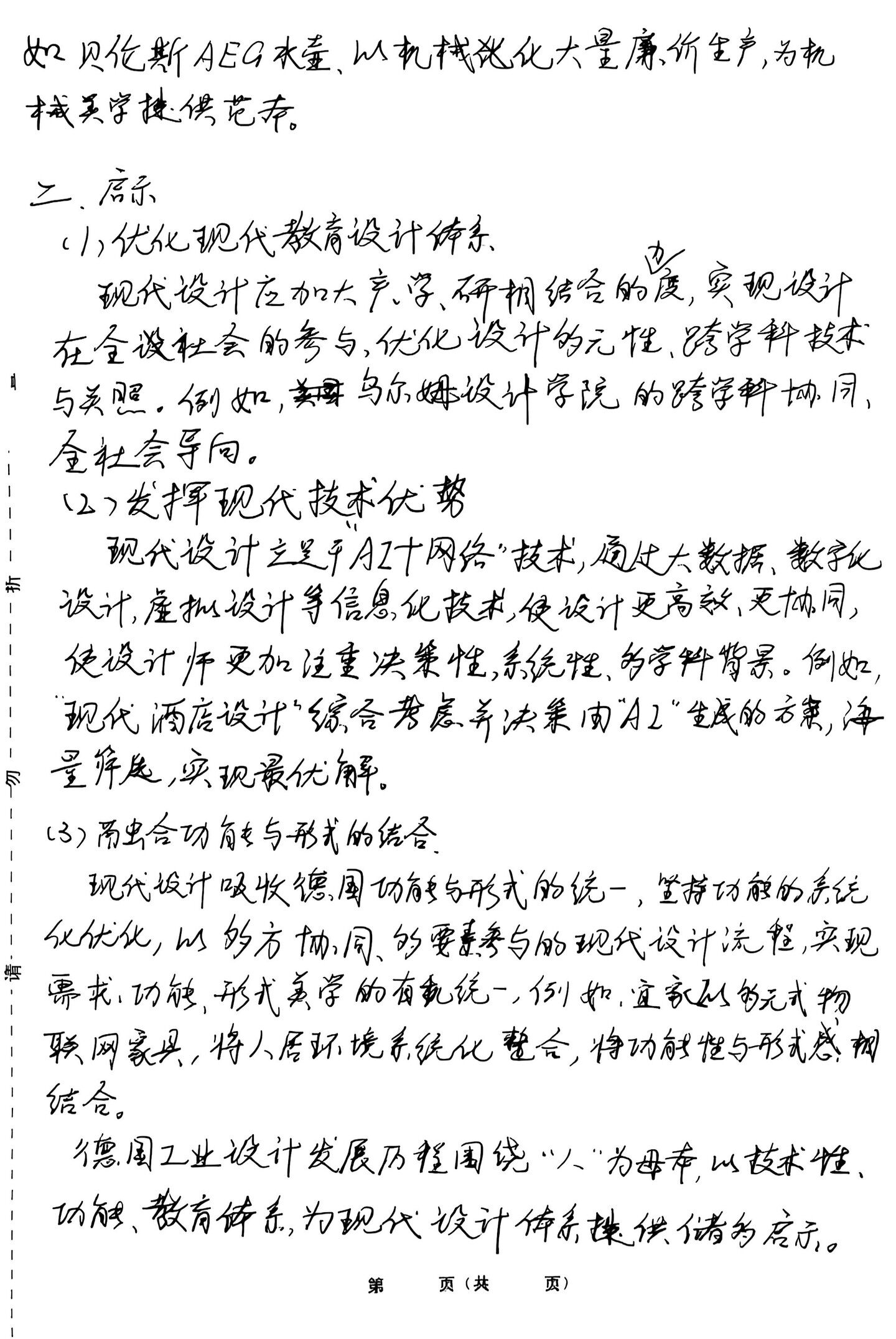 如贝伦斯AEG水壶、以机械化大量廉价生产,为机 械美学提供范本。 >启示 (1)优化现代教育设计体系 现代设计应加大产、学、研相结合的度,实现设计 在全社会的参与,优化设计多元性、跨学科技术 与关照。例如,乌尔姆设计学院的跨学科协同, 全社会导向。 (2)发挥现代技术优势 现代设计立足于AI+网络”技术,通过大数据、数字化 设计,虚拟设计等信息化技术,使设计更高效、更协同, 使设计师更加注重决策性,系统性,多学科背景。例如, 现代酒店设计”综合考虑并决策由“AI”生成的方案,海 量筛选,实现最优解。 (3)融合功能与形式的结合 现代设计吸收德国功能与形式的统一,坚持功能的系统 化优化,以多方协同、多要素参与的现代设计流程,实现 需求,功能,形式美学的有机统一,例如,宜家的多元式物 联网家具,将人居环境系统化整合,将功能性与形式感 结合。 德国工业设计发展历程围绕“人”为母本,以技术性, 功能,教育体系,为现代设计体系提供储多启示。 第 页(共 页)