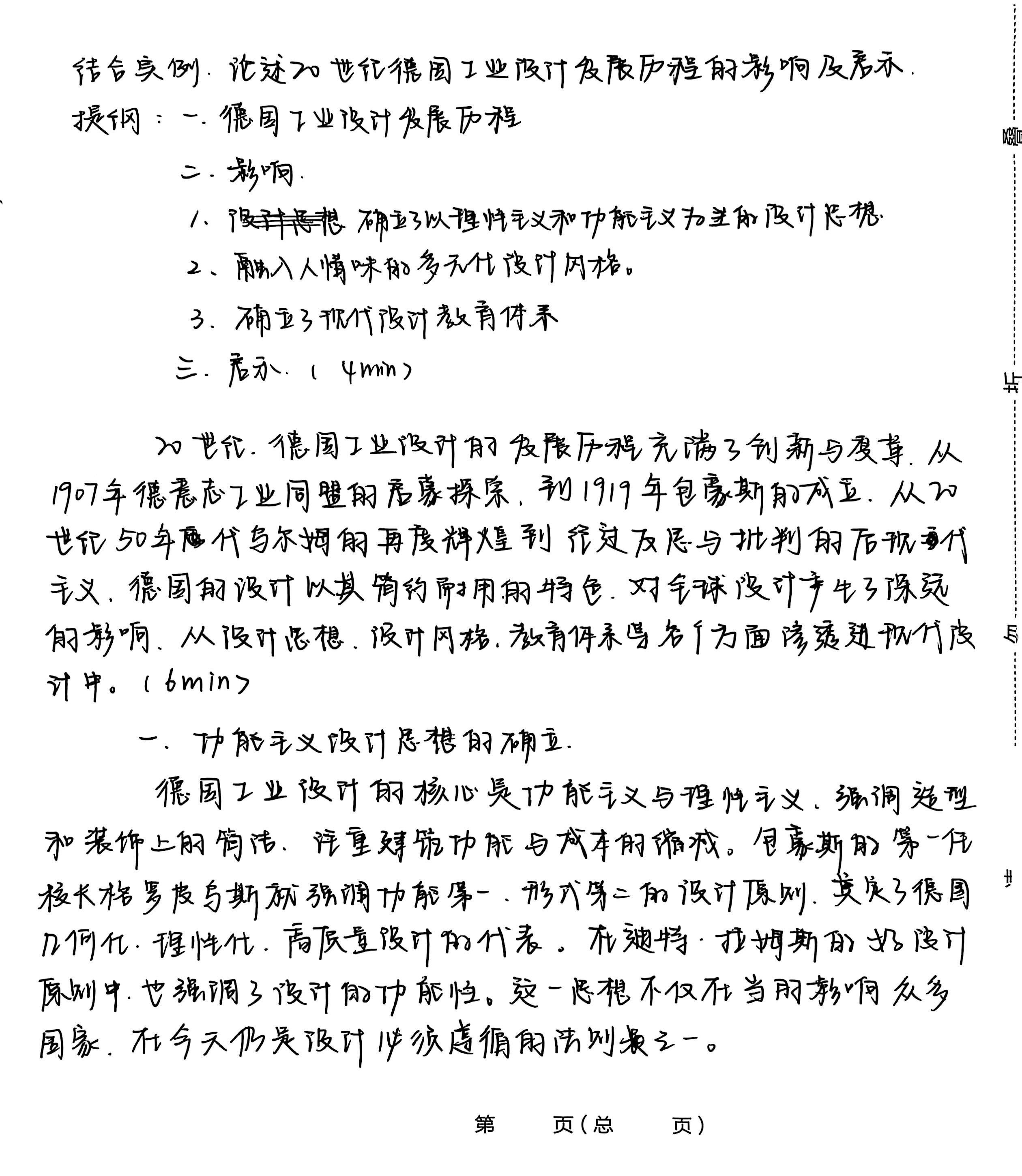 1 结合实例,论述20世纪德国工业设计发展历程的影响及启示 提纲:一、德国工业设计发展历程 二.影响 人确立了以理性主义和功能主义为主的设计思想 2、融入人情味的多元化设计风格。 3.确立了现代设计教育体系 三,启示(4 4mn) 异 20世纪,德国工业设计的发展历程充满了创新与变革,从 1907年德意志工业同盟的启蒙探索,到1919年包蒙斯的成立,从20 世纪50年代写尔姆的再度辉煌到经过反思与批判的后现代 主义,德国的设计以其简约耐用的特色,对全球设计产生了深远 的影响,从设计思想,设计风格,教育体系等各个方面渗透进现代皮 计中.(6min> 一、功能主义设计思想的确立。 德国工业设计的核心是功能主义与理性主义,强调造型 和装饰上的简洁,注重建筑功能与成本的缩减.包蒙斯的第一任 校长格罗皮乌斯就强调协能第一,形式第二的设计原则,奠定了德国 几何化,理性化,高质量设计的代表。在迪特,拉姆斯的好设计 原则中,也强调了设计的功能性。这一思想不仅在当时影响众多 国家,在今天仍是设计必须遵循的法则最之一。 第 页(总 页)
