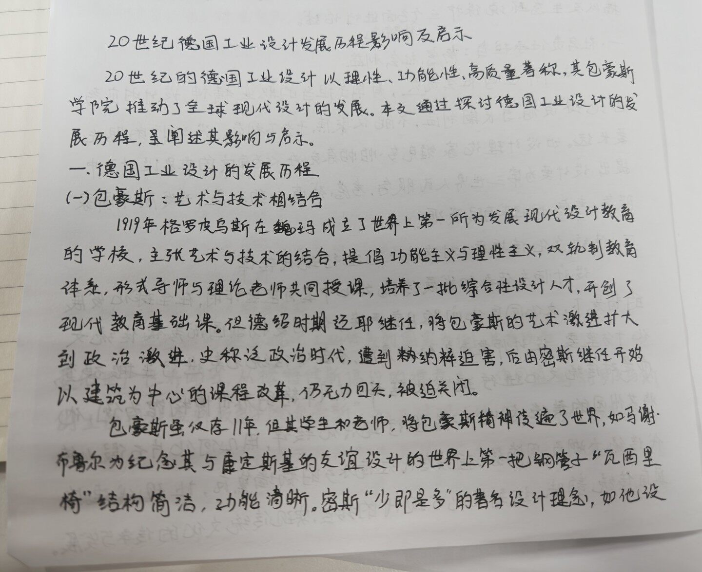 20世纪德国工业设计发展历程影响及启示 20世纪的德国工业设计以理性、功能性、高质量著称,其包豪斯 学院推动了全球现代设计的发展。本文通过探讨德国工业设计的发 展历程,阐述其影响与启示。 一、德国工业设计的发展历程 (一)包豪斯:艺术与技术相结合 1919年格罗皮乌斯在魏玛成立了世界上第一所为发展现代设计教育 的学校,主张艺术与技术的结合,提倡功能主义与理性主义,双轨制教育 体系,形式导师与理论老师共同授课,培养了一批综合性设计人才,开创了 现代教育基础课。但德绍时期迈耶继任,将包豪斯的艺术激进扩大 到政治激进,史称泛政治时代,遭到纳粹迫害,后由密斯继任开始 以建筑为中心的课程改革,仍无力回天,被迫关闭。 包豪斯虽仅存11年,但其学生和老师,将包豪斯精神传遍了世界,如马谢。 布鲁尔为纪念其与康定斯基的友谊设计的世界上第一把钢管子“瓦西里 椅”结构简洁,功能清晰。密斯“少即是多”的著名设计理念,如他设