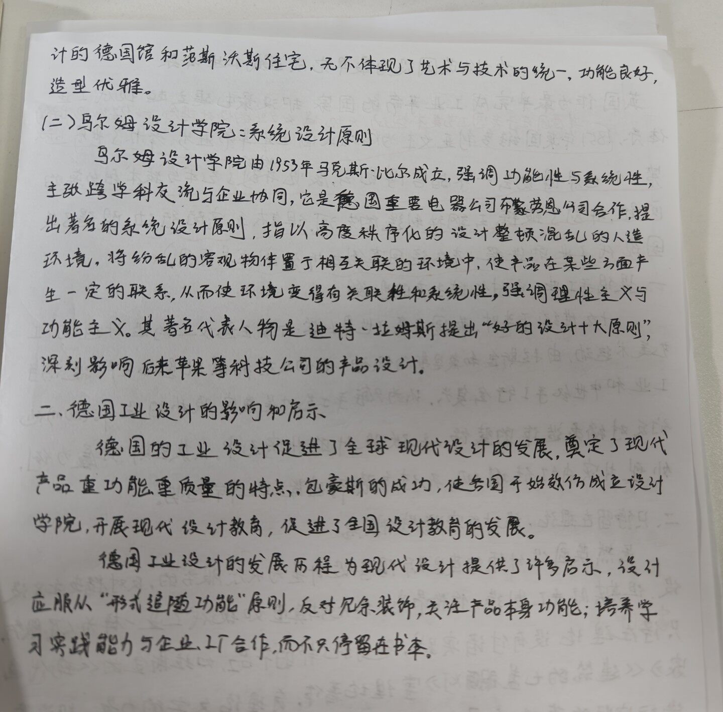 计的德国馆和范斯沃斯住宅,无不体现了艺术与技术的统一,功能良好 造型优雅。 (二)乌尔姆设计学院:系统设计原则 马尔姆设计学院由1953年马克斯?比尔成立,强调功能性与系统性, 主张跨学科交流与企业协同,它是德国重要电器公司布蒙劳恩公司合作,提 出著名的系统设计原则,指以高度秩序化的设计整顿混乱的人造 环境,将纷乱的客观物体置于相互关联的环境中,使产品在某些方面产 生一定的联系,从而使环境变得有关联牲和系统性,强调理性主义与 功能主义。其著名代表人物是迪特.拉姆斯提出“好的设计十大原则”, 深刻影响后来苹果等科技公司的产品设计。 二、德国工业设计的影响和启示 TFI毛 德国的工业设计促进了全球现代设计的发展,奠定了现代 产品重功能重质量的特点。包豪斯的成功,使各国开始效仿成立设计 学院,开展现代设计教育,促进了全国设计教育的发展。 德国工业设计的发展历程为现代设计提供了许多启示,设计 应服从“形式追随功能“原则,反对见余装饰,关注产品本身功能;培养学 习实践能力与企业、工厂合作,而不只停留在书本。
