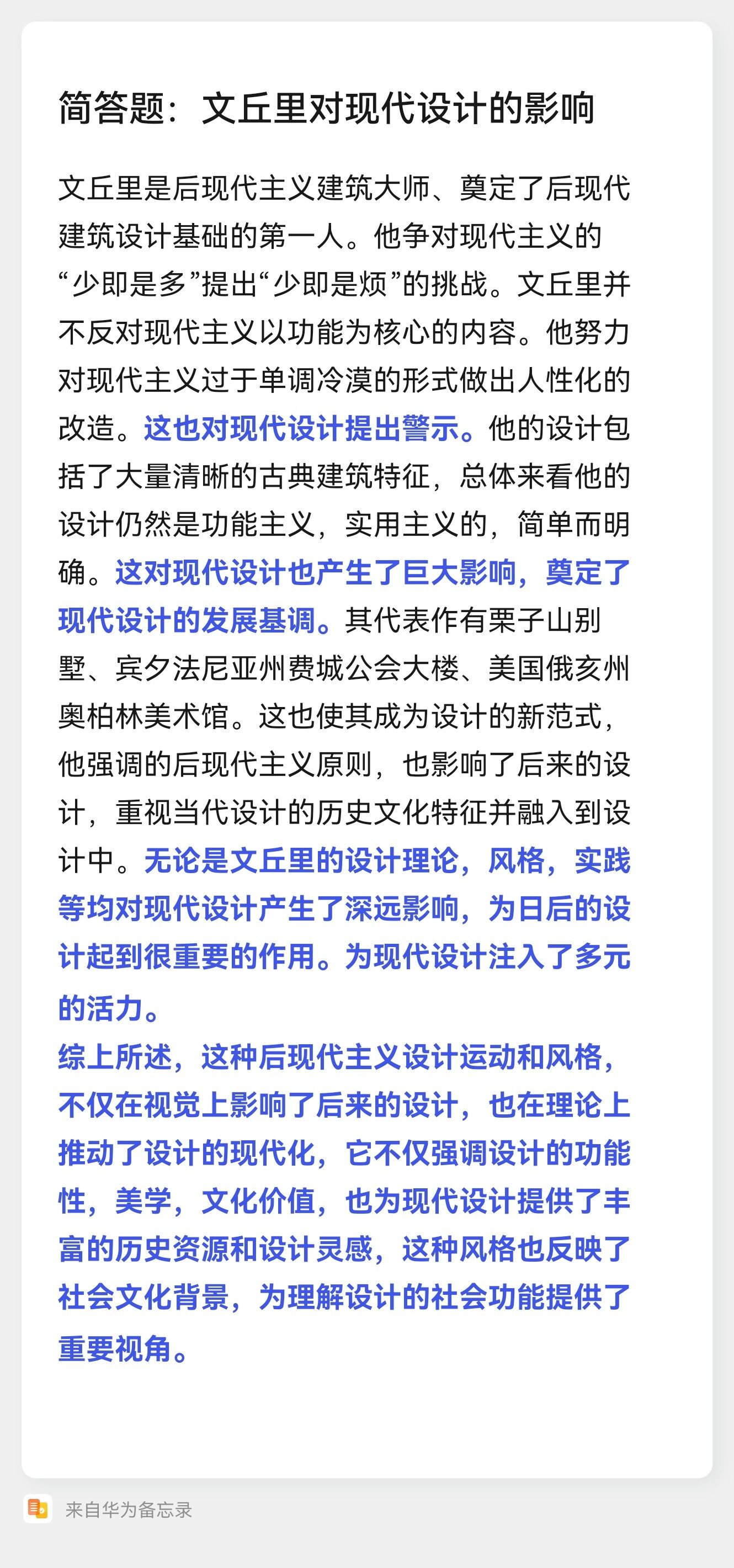 简答题: 文丘里对现代设计的影响 文丘里是后现代主义建筑大师、奠定了后现代 建筑设计基础的第一人。他争对现代主义的 “少即是多”提出“少即是烦”的挑战。文丘里并 不反对现代主义以功能为核心的内容。他努力 对现代主义过于单调冷漠的形式做出人性化的 改造。这也对现代设计提出警示。他的设计包 括了大量清晰的古典建筑特征,总体来看他的 设计仍然是功能主义,实用主义的,简单而明 确。这对现代设计也产生了巨大影响,奠定了 现代设计的发展基调。其代表作有栗子山别 墅、宾夕法尼亚州费城公会大楼、美国俄亥州 奥柏林美术馆。这也使其成为设计的新范式, 他强调的后现代主义原则,也影响了后来的设 计,重视当代设计的历史文化特征并融入到设 计中。无论是文丘里的设计理论,风格,实践 等均对现代设计产生了深远影响,为日后的设 计起到很重要的作用。为现代设计注入了多元 的活力。 综上所述,这种后现代主义设计运动和风格, 不仅在视觉上影响了后来的设计,也在理论上 推动了设计的现代化,它不仅强调设计的功能 性,美学,文化价值,也为现代设计提供了丰 富的历史资源和设计灵感,这种风格也反映了 社会文化背景,为理解设计的社会功能提供了 重要视角。 来自华为备忘录