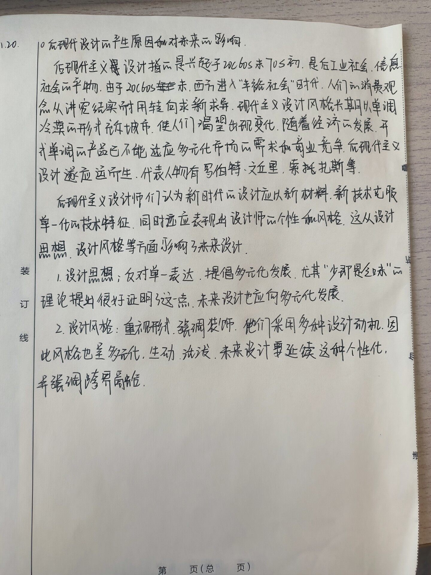 1.20. !后现代设计的产生原因和对未来的影响 后现代主义设计指的是兴起于20C60S末70S初,是后工业社会、信息 社会的平物,由于20C60S未,西方进入“丰裕社会”时代,人们的消费观 念从讲究结实耐用转向求新求异.现代主义设计风格长期以单调 冷漠的形式充斥城市,使人们渴望出现变化,随着经济的发展.开 式单调的产品已不能适应多元化市场的需求和商业竞争,后现代主义 设计遂应运而生.代表人物有罗伯特、文丘里、索扎斯等. 后现代主义设计师们认为新时代的设计应以新材料.新技术克服 单一化的技术特征.同时还应表现出设计师的个性和风格,这从设计 WI 田相 W .设计风格等方面影响了未来设计 装 1.设计思想;反对单一表达,提倡多元化发展,尤其“少即是乏味”的 异 订 理论提出很好证明了这一点,未来设计也应向多元化发展 线 2.设计风格:重视形式、强调装饰,他们采用多种设计动机.因 此风格也呈多元化,生动,活泼,未来设计要延续这种个性化, 并强调跨界融合. 第 页(总 页)