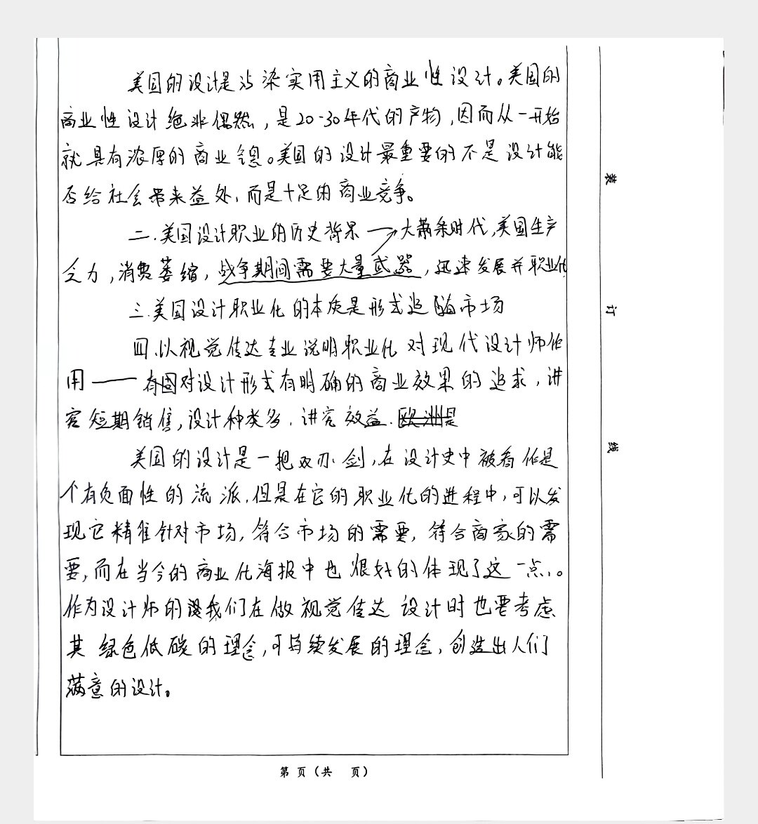 美国的设计是3沾染实用主义的商业性设计。美国的 商业性设计绝非偶然,是20-30年代的产物,因而从一开始 就具有浓厚的商业气息。美国的设计最重要的不是设计能 否给社会带来益处,而是十足的商业竞争。 游 二.美国设计职业的历史背景→大萧条时代,美国生产 乏力,消费萎缩,战争期间需要大量武器,迅速发展并职业化 三、美国设计职业化的本质是形式追随市场 四、以视觉传达专业说明职业化对现代设计师作 用--有对设计形式有明确的商业效果的追求,讲 究短期销售,设计种类多,讲究效益。 美国的设计是一把双刃剑,在设计史中被看作是 个有负面性的流派,但是在它的职业化的进程中,可以发 现它精准针对市场,符合市场的需要,符合商家的需 要,而在当今的商业化海报中也很好的体现了这一点0 作为设计师的我们在做视觉传达设计时也要考虑 其绿色低碳的理念,可持续发展的理念,创造出人们 满意的设计。 第页(共 页)