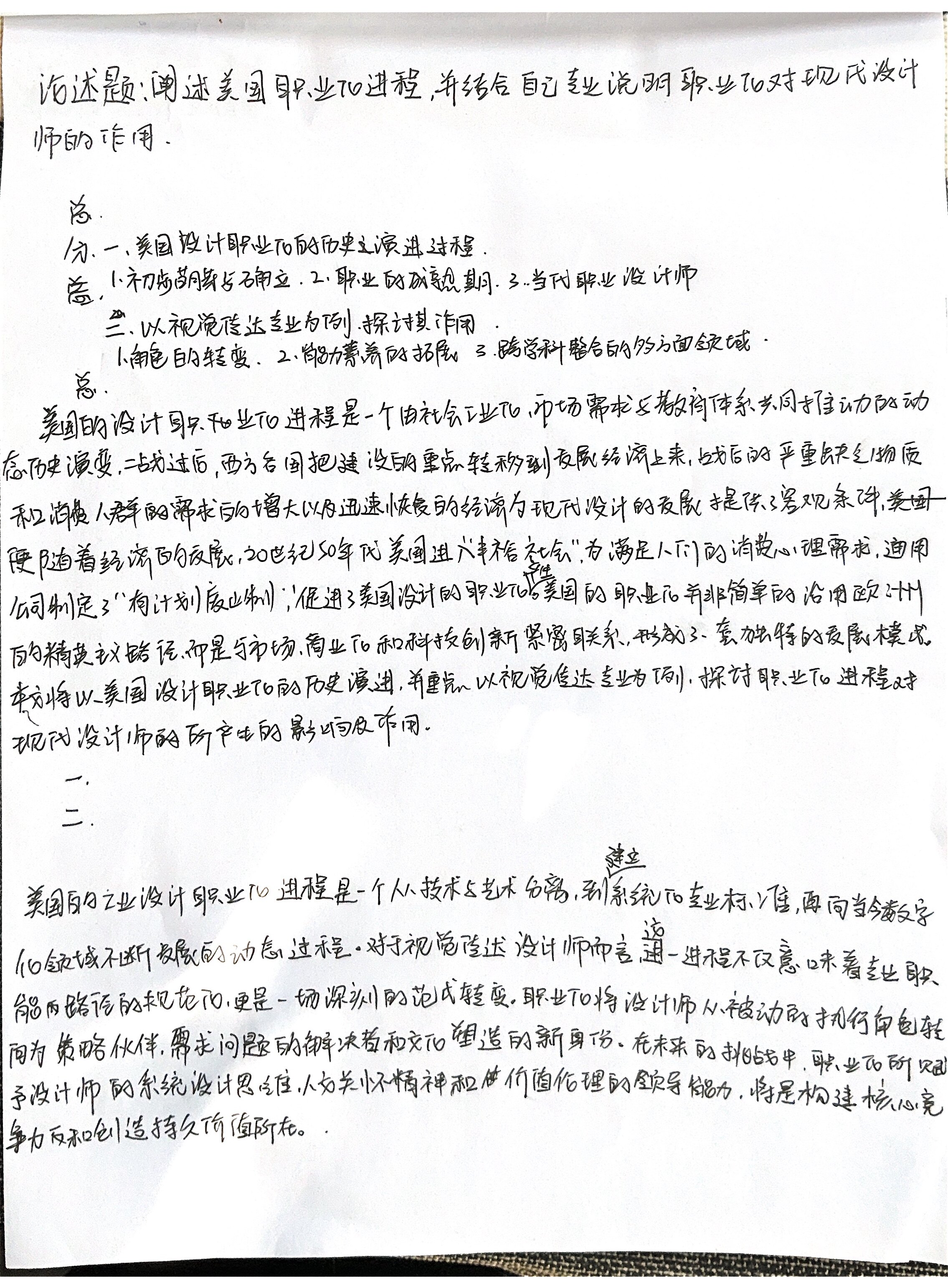 论述题:阐述美国职业化进程,并结合自己专业说明职业化对现代设计 师的作用. 总. 分一、美国设计职业化的历史主演进过程. 总,1.初步月芽与确立.2、职业的成熟期.3.当代职业设计师 三、以视觉传达专业为例,探讨其作用 1.角色的转变。2、能力素养的拓展3、跨学科整合的多方面领域 总: 美国的设计职业化进程是一个由社会工业化、市场需求与教育体系共同推动的动 态历史演变,二战过后,西方各国把建设的重点转移到发展经济上来,战后的严重缺乏物质 和消费人群的需求的增大以及迅速恢复的经济为现代设计的发展提供3客观条件,美国 便随着经济的发展,20世纪50年代美国进入丰裕社会”,为满足人们的消费心理需求,通用 公司制定了“有计划度止制”,促进了美国设计的职业化美国的职业化并非简单的沿用欧洲 的精英主义路径,而是与市场、商业化和科技创新紧密联系,形成了,套独特的发展模式。 文将以美国设计职业化的历史演进,并重点以视觉传达专业为例,探讨职业化进程对 现代设计师所产生的影响及作用。 建立 美国的工业设计职业化进程是一个从技术与艺术分离,到系统的专业标准,再向当今数字 化领域不断发展的动态过程。对于视觉传述设计师而言,通一进程不仅意味着专业助 能内路径的规范化,更是一场深刻的范式转变,职业化将设计师从被动的执行角色转 口文化塑造的新 毛米 向为策略伙伴,需求问题的解决不精神和价值伦理的领导占战中职业化所赋 设计师 里的领导能 争力反和创造持久价值所在。 竞