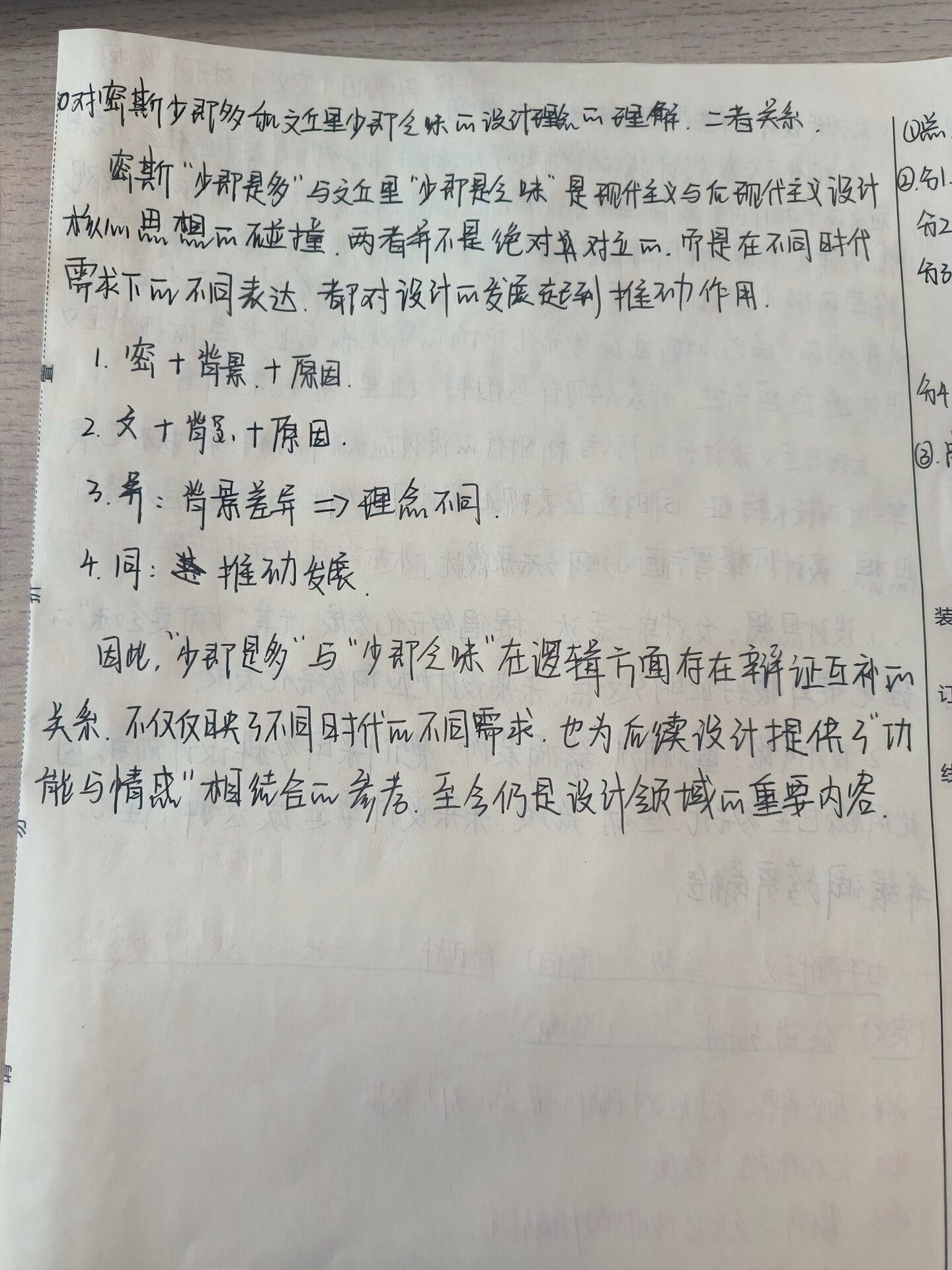 ①对密斯少即多和文丘星少即乏味的设计理念的理解,二者关系 R D总 逾斯“少即是多”与文丘里“少即是乏味”是现代主义与后现代主义设计 ②分1. 分2 核心思想的碰撞.两者并不是绝对对立的,而是在不同时代 分子 需求下的不同表达,都对设计的发展起到推动作用. 1.密+背景.+原因. 分4 2.文+背景、+原因. ③. 了.异:背景差异理念不同 4.同:推动发展 装 因此,“少即是多”与“少即乏味”在逻辑方面存在辩证互补的 关系,不仅仅映了不同1 时代的不同需求,也为后续设计提供了“功 能与情感”相结合的参考.至今仍是设计领域的重要内容