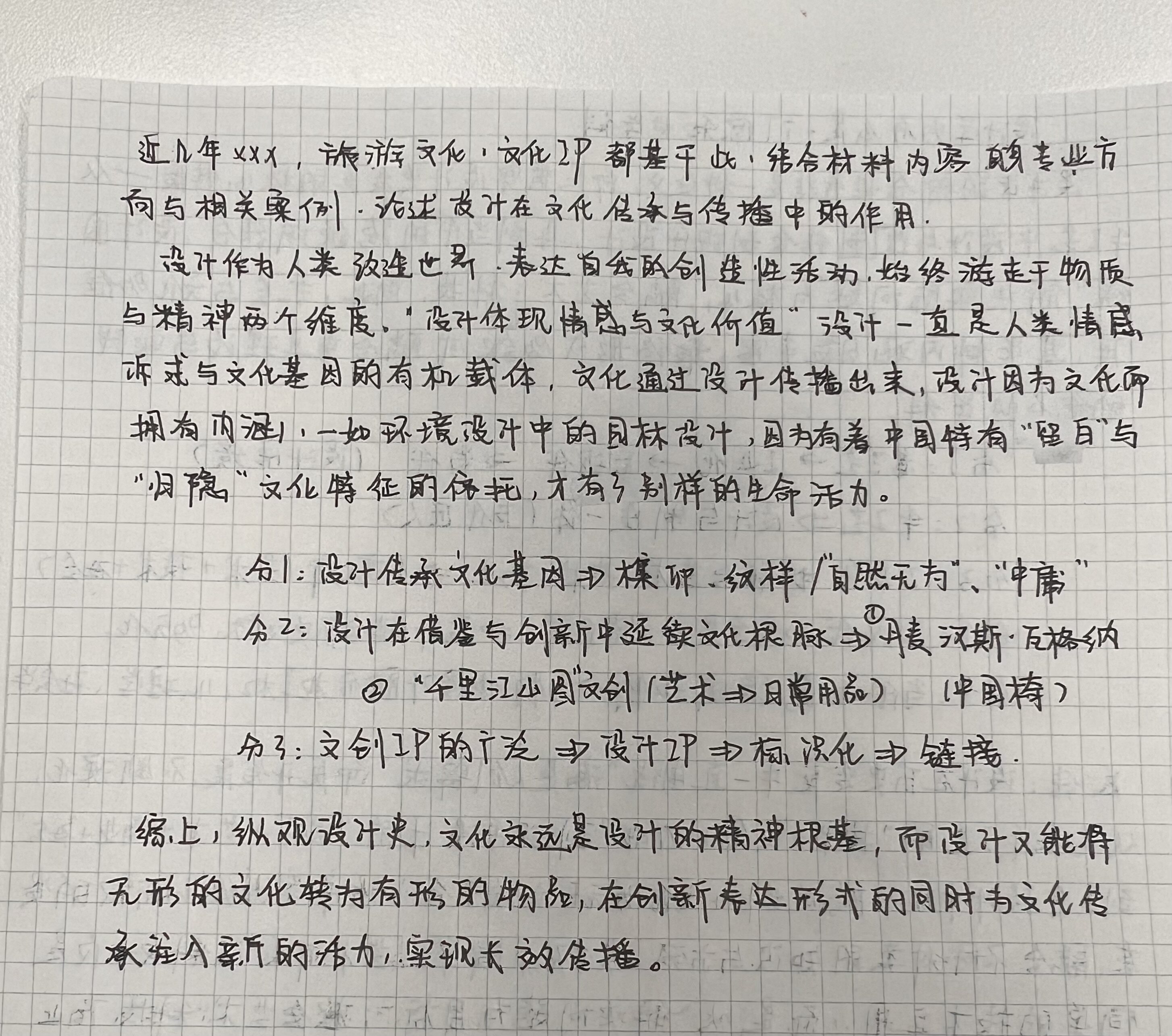 近几年xXX,旅游文化,文化2P都基干此.结合材料内容自身专业方 向与相关案例.论述设计在文化传承与传播中的作用 设计作为人类改造世界.夹 表达自我的创造性活动,始终游走于物质 与精神两个维度。”设计体现情感与文化价值 设计一直是人类情感 诉求与文化基因的有机载体,文化通过设计传播出来,设计因为文化而 拥有内涵.一如环境设计中的园林设计,因为有着中国特有“留白”与 归隐“文 “文化特征的依托,才有了别样的生命活力。 7 小 分:设计传承又化基因卵,纹样/自然无为”、“中庸 分工:设计在借鉴与创新中延续文化根脉麦汉斯.瓦格纳 ②“千里江山图文创(艺术1>日常用品) (中国椅) 分3:文创工P的广泛设计2P1标化链接. 17 92 综上,纵观设计史,文化永远是设计的精神根基,而设计又能将 5 无形的文化转为有形的物品,在创新表达形式的同时为文化传 承注入新的活力,实现长效传播。 18 .5