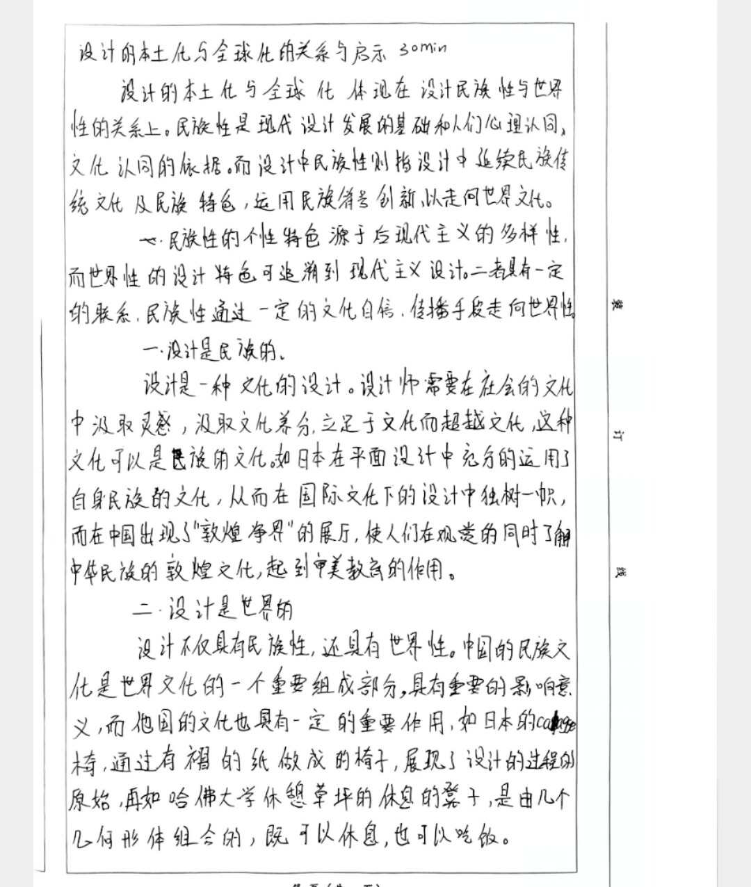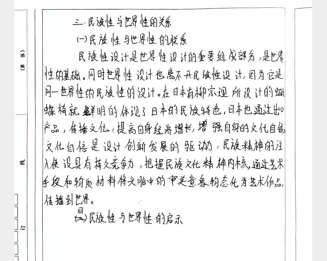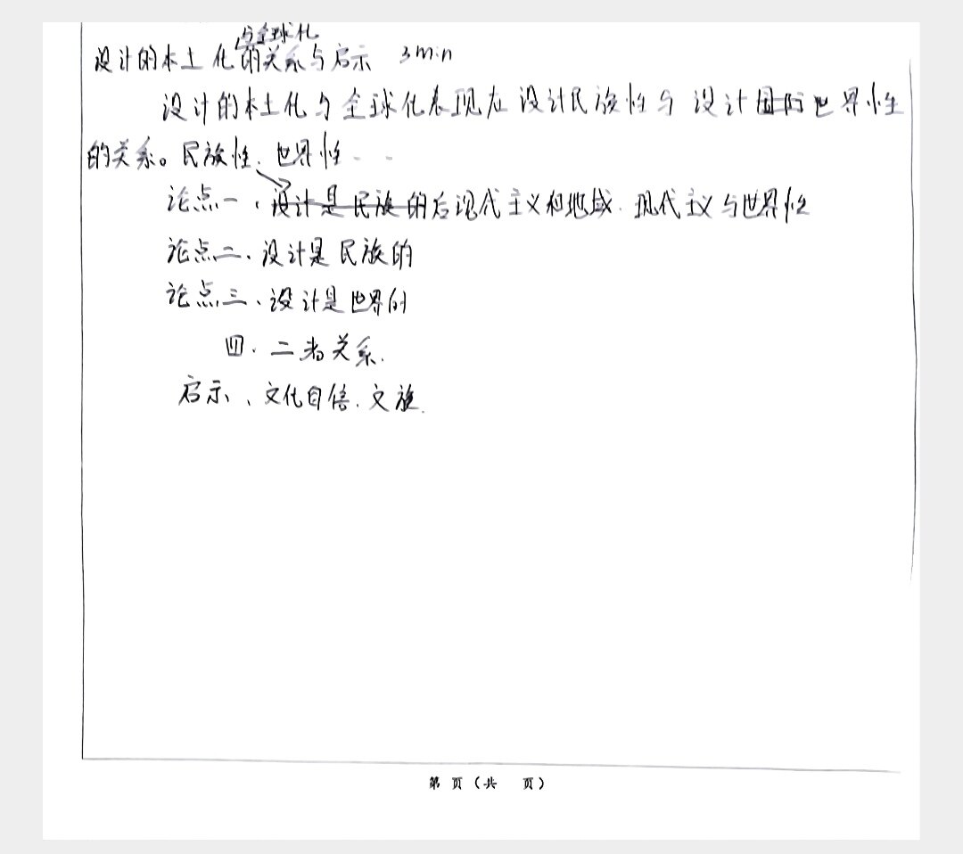 分全球孔 设计的本土化的关系与启示 3m.n 设计的本土化与全球化表现在设计民族性与设计际世界性 的关系。民族性:世界性 论点一后现代主义和地域.现代主义与世界性 论点二、设计是民族的 论点三、设计是世界的 四.二者关系. 启示、文化自信.文族 第 页(共 页)