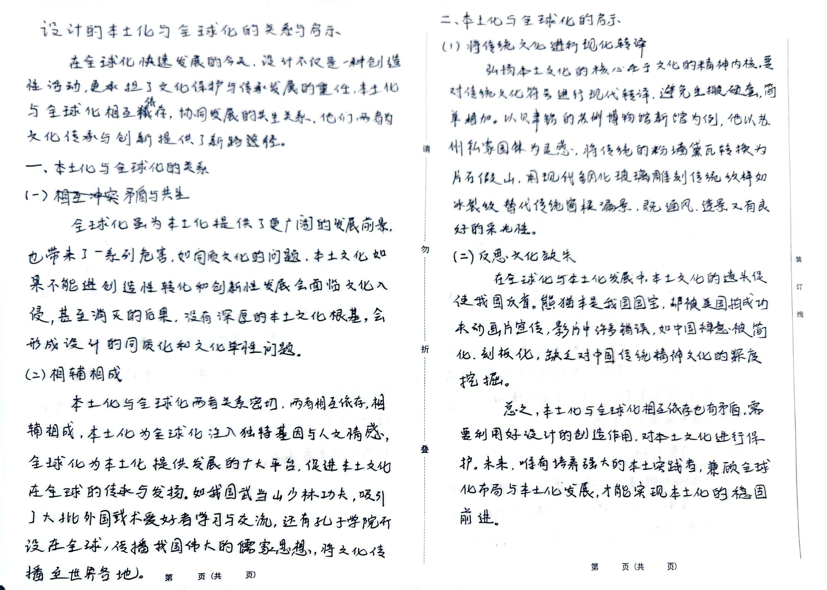 二、本土化与全球化的启示 设计的本土化与全球化的关系与启示 (1)将传统文化进行现化转译 在全球化快速发展的今天,设计不仅是一种创造 弘扬本土文化的核心在于文化的精神内核,要 性活动,更承担了文化保护与传承发展的重任,本土化 依, 对传统文化符号进行现代转译,避免坐搬硬套,简 与全球化相互存,协同发展的共生关系,他们两者为 单相加。以贝聿铭的苏州博物馆新馆为例,他以苏 文化传承与创新提供了新路径。 请 州私家园林为灵感,将传统的粉墙黛瓦转换为 一、本土化与全球化的关系 片石假山,用现代钢化玻璃雕刻传统纹样如 (一)矛盾与共生 冰裂纹替代传统窗根漏景,既通风、透景又有良 全球化虽为本工化提供了更广阔的发展前景, 好的采光性。 也带来了一系列危害,如同质文化的问题、本土文化如 勿 (二)反思文化缺失 装 果不能进创造性转化和创新性发展会面临文化入 在全球化与本土化发展中,本土文化的遗失促 订 使我国反省。熊猫丰是我国国宝,却被美国拍成功 侵,甚至消灭的后果,没有深厚的本土文化根基,会 线 夫动画片宣传,影片中许多错误,如中国禅意被简 形成设计的同质化和文化单一性问题。 折 化。刻板化,缺乏对中国传统精神文化的深度 (二)相辅相成 挖掘。 本土化与全球化两者关系密切,两者相互依存,相 总之,本土化与全球化相互依存也有矛盾,需 辅相成,本土化为全球化注入独特基因与人文情感, 要利用好设计的创造作用,对本土文化进行保 叠 全球化为本土化提供发展的广大平台,促进本土文化 护。未来,唯有培养强大的本土实践者,兼顾全球 在全球的传承与发扬。如我国武当山少林功夫,吸引 化布局与本土化发展,才能实现本土化的稳固 ]大批外国或术爱好者学习与交流,还有孔子学院开 前进。 设在全球,传播我国伟大的儒家思想,将文化传 播至世界各地。 第 页(共 页) 第 页(共 页)