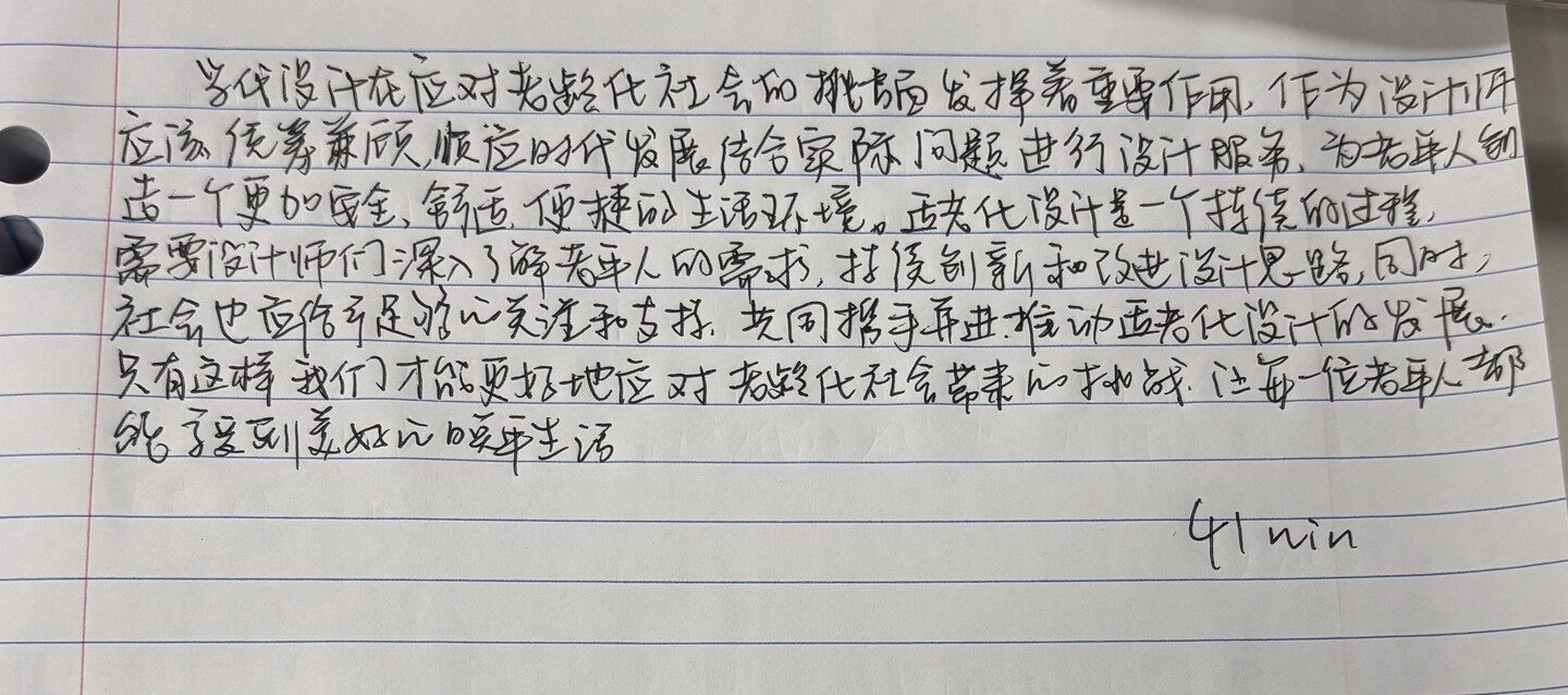 学代设计在应对老龄化社会的挑方面发挥着重要作用,作为设计师 应该统筹兼顾,顺应时代发展结合实际问题进行设计服务,为老年人创 需要设计师们深入了解老人的需长找创新和进设计里路同时, 社会也应给予足够的关注和支持,共同携手并进.推动适者化设计的发展. 只有这样我们才能更好地应对老龄化社会带来的挑战,让每一位老年人都 能享受到美好的晚生活 41wir M