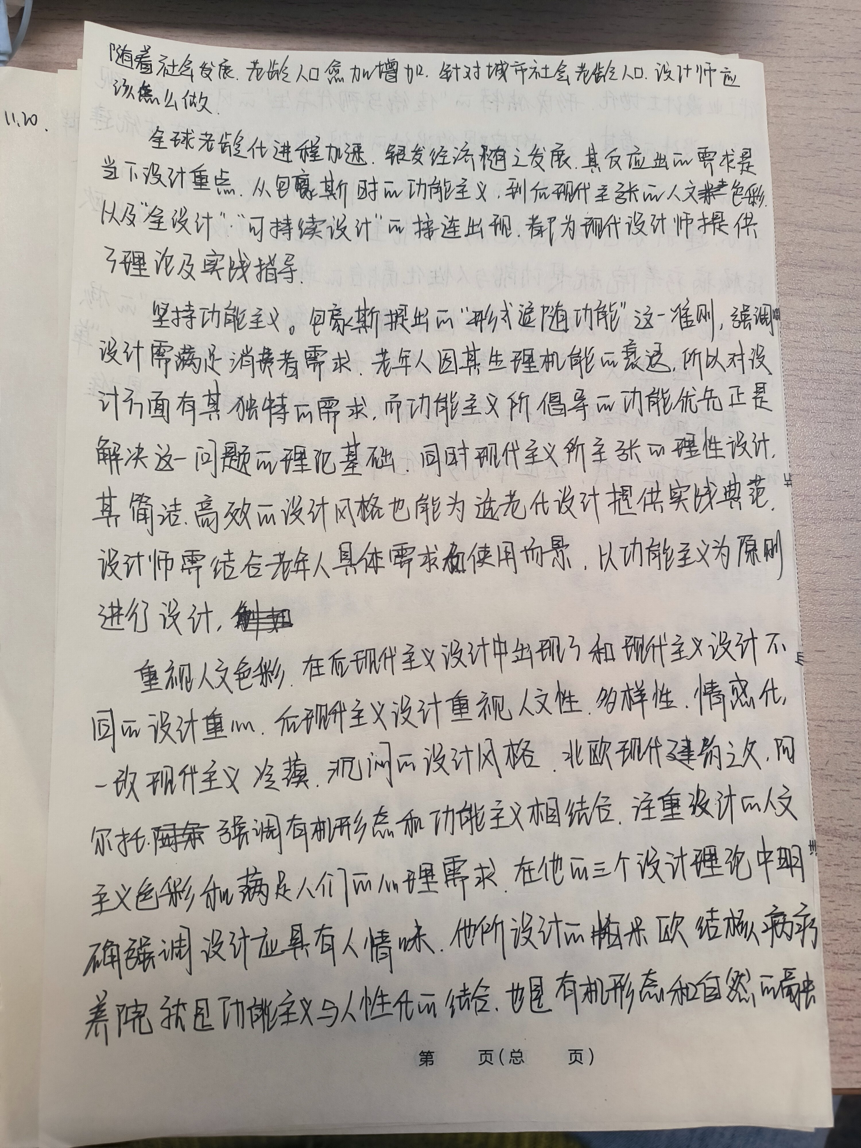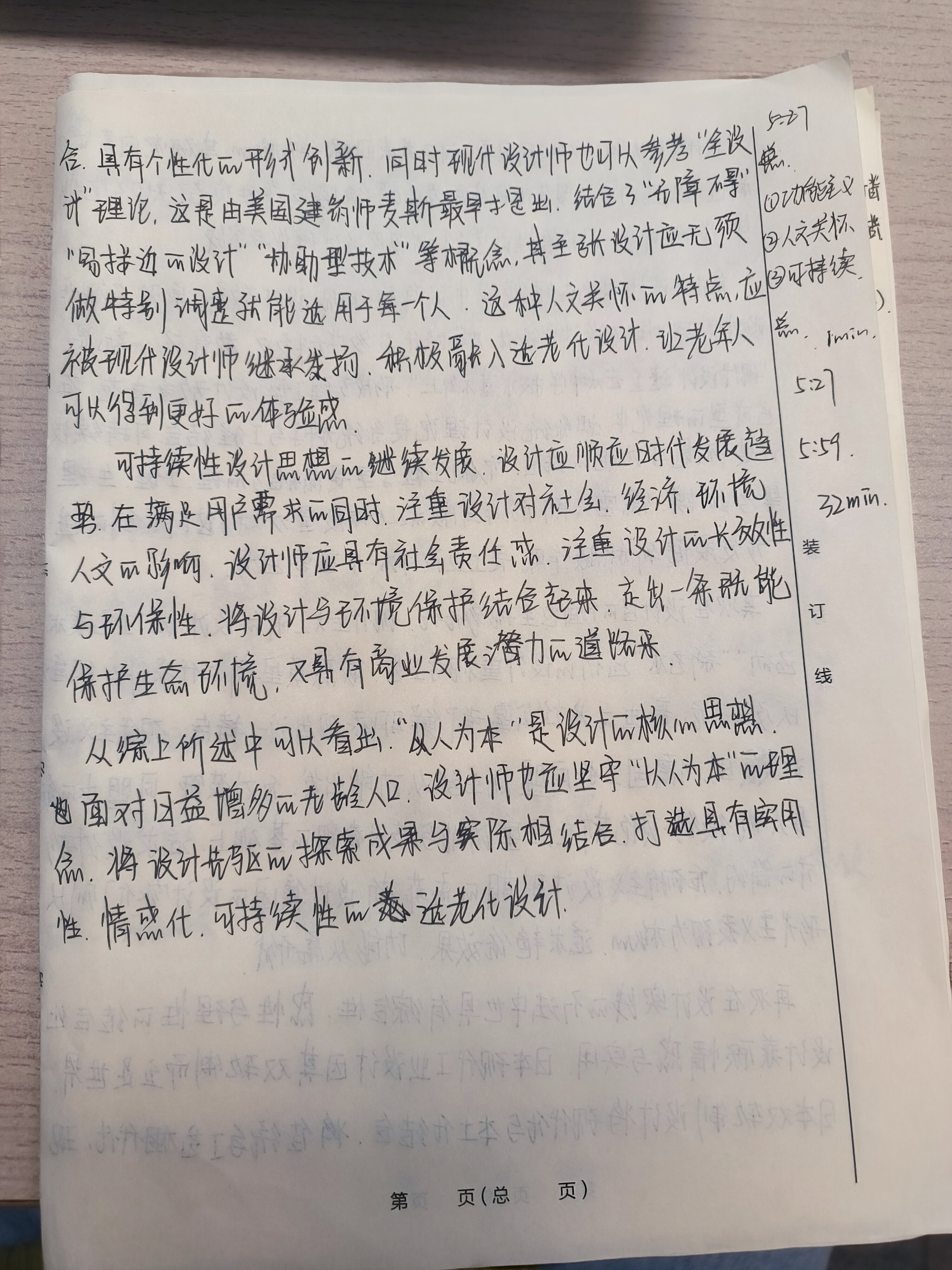合,具有个性化的形式创新,同时现代设计师也可以参考“全设 5.27 . 理论,这是由美国建筑师麦斯最早提出,结合了“无障碍” ①功能主义 背 “易接近可设计”“协助型技术”等概念,其主张设计应无须 ②人文关怀 做特别调整就能适用于每一个人.这种人文关怀的特点,应 ③可持续 ) 被现代设计师继承发扬.积极融入适老化设计,让老年人 总 Imim 可以得到更好的体验感 5:21 可持续性设计思想的继续发展,设计应顺应时代发展趋 5:59. 势在满足用户需求的同时,注重设计对社会、经济,环境 32min 人文的影响,设计师应具有社会责任感,注重设计的长效性 装 与环保性,将设计与环境保护结合起来,走出一条既能 订 保护生态环境,又具有商业发展潜力的道路采 线 从综上所述中可以看出。“以人为本”是设计的核心思想 面对日益增多的老龄人口,设计师也应坚守“以人为本”的理 念,将设计先驱的探索成果与实际相结合.打造具有实用 性 .情惑化,可持续性的适老化设计. 西下业工本日 第 页(总 页)