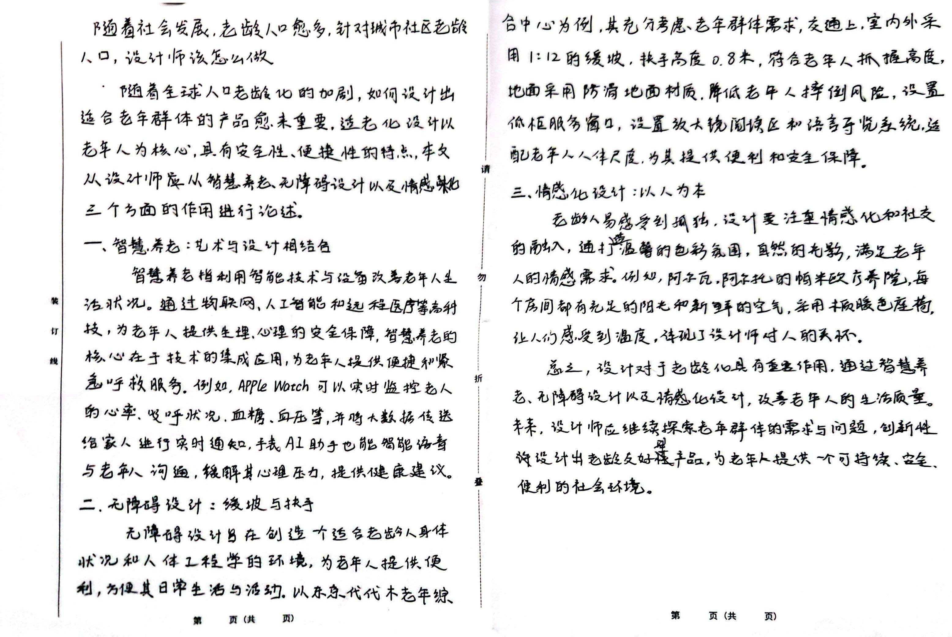 随着社会发展,老龄人口愈多,针对城市社区老龄 合中心为例,其充分考虑老年群体需求,交通上,室内外采 人口,设计师该怎么做 用1:12的缓坡,扶手高度0.8米,符合老年人抓握高度, 随着全球人口老龄化的加剧,如何设计出 地面采用防滑地面材质,降低老年人摔倒风险,设置 适合老年群体的产品愈来重要。适老化设计以 低柜服务窗口,设置放大镜阅读区和语言导览系统。适 老年人为核心,具有安全性、便捷性的特点,本文 请 配老年人人体尺度,为其提供便利和安全保障。 从设计师从智慧养老,无障碍设计以及情感化 三、情感化设计:以人为本 三个方面的作用进行论述。 老龄人易感受到孤独,设计要注重情感化和社交 一、智慧养老:艺术与设计相结合 的融入,通扩温馨的色彩氛围,自然的光影,满足老年 智养老指利用智能技术与设备改善老年人生 勿 人的情感需求。例如,阿尔瓦。阿尔托的帕米欧疗养院,每 装 活状况。通过物联网,人工智能和远程医疗等高种 个房间都有充足的阳光和新鲜的空气,采用木质暖色座椅, 订 技,为老年人提供生理、心理的安全保障,智慧养老的 让人们感受到温度。体现了设计师对人的关怀。 线 核心在于技术的集成应用,为老年人提供便捷和紧 总之,设计对于老龄化具有重要作用,通过智慧养 急呼救服务。例如,AppleWatch可以实时监控老人 -5 老、无障碍设计以及情感化设计,改善老年人的生活质量。 的心率,吸呼状况、血糖、血压等,并将大数据传送 未来,设计师应继续探索老年群体的需求与问题,创新性 给家人进行实时通知,手表AI助手也能智能语音 型产品 设计出老龄友好产品,为老年人提供一个可持续、安全。 与老年人沟通,缓解其心理压力,提供健康建议。 叠 便利的社会环境。 二.无障碍设计:缓坡与扶手 无障碍设计写在创造一个适合老龄人身体 状况和人体工程学的环境,为老年人提供便 利,方便其日常生活与活动。以东京代代木老年综 第 页(共 页) 第 页(共 页)